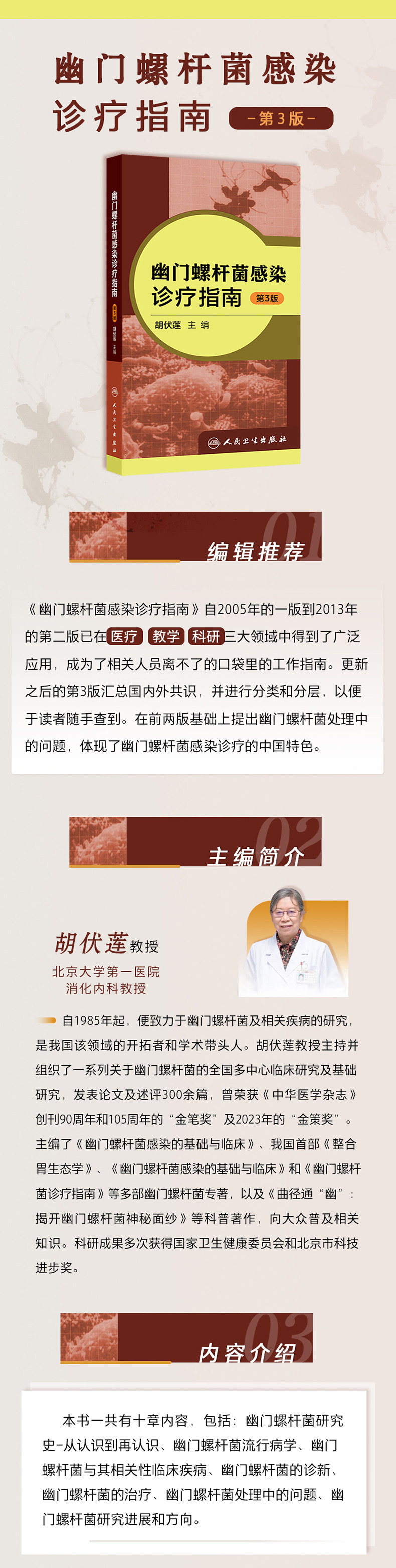 该书的2005年的一版到2013年的第二版已在医疗,教学,科研三大领域中得到了广泛应用,成为了相关人员离不了的口袋里的工作指南。更新之后的第三版将会有更多读者喜受和关注 。1, 汇总国内外共识,并进行分类和分层,以便于读者隨手查到。2, 提出幽门幜杆菌处理中的问题。3,体现中国特色。全书内容包括:幽门螺杆菌研究史-从认识到再认识、幽门螺杆菌流行病学、幽门螺杆菌与其相关性临床疾病、幽门螺杆菌的诊新、幽门螺杆菌的治疗、幽门螺杆菌处理中的问题、幽门螺杆菌研究进展和方向。