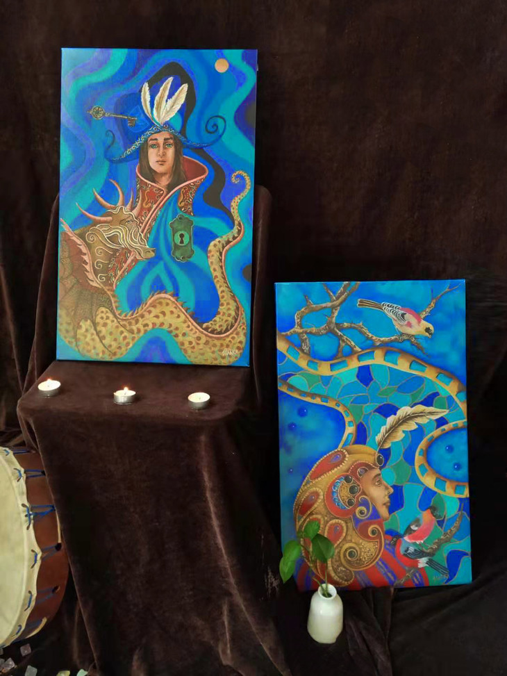 此次《精油魔法》的封面和封底取自Starka的两幅画作:长74.2cm;宽50cm