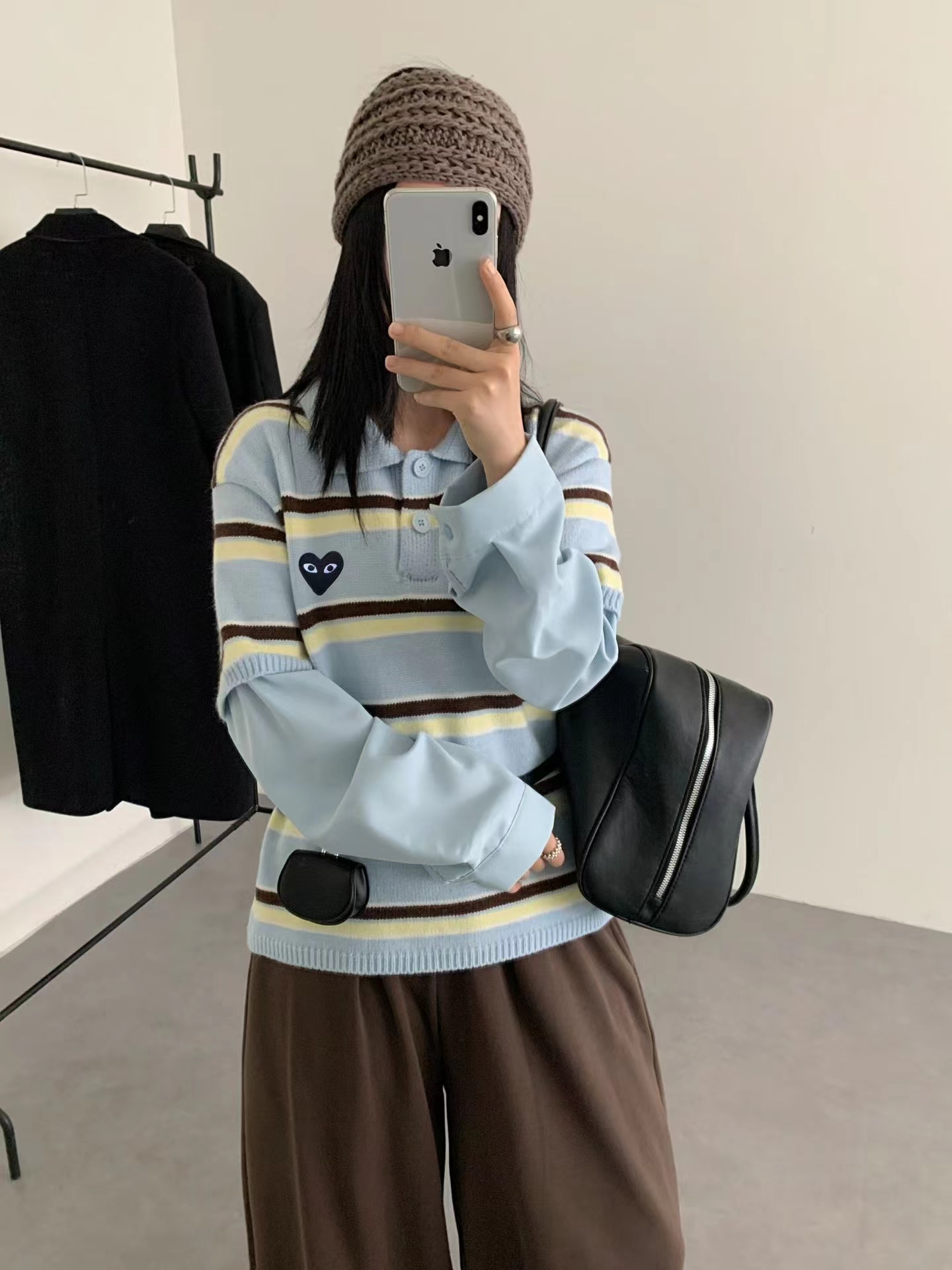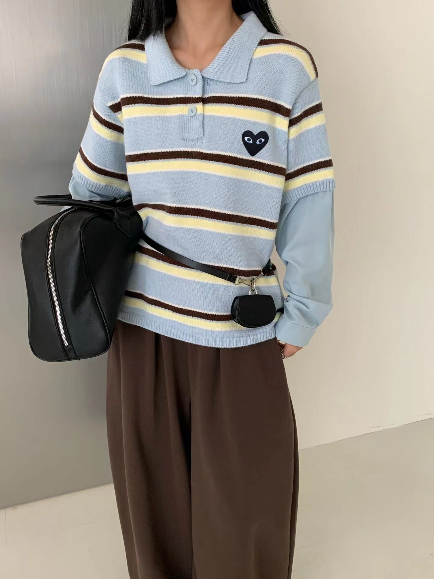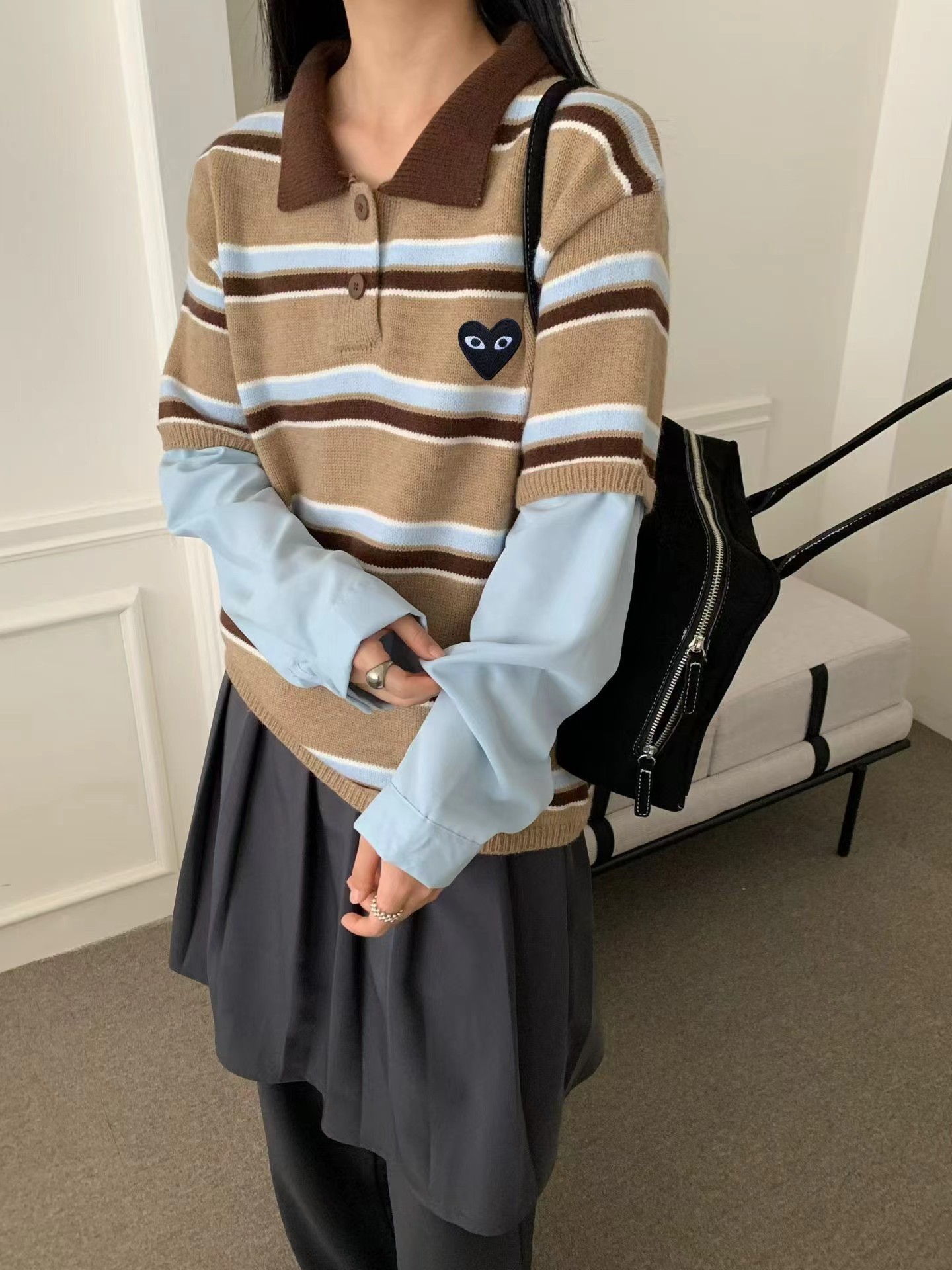 POLO条纹毛衣设计风格:采用复古 Polo 领设计,领口和条纹中的深棕色元素增添复古质感,蓝棕相间的条纹组合清新又不失沉稳,整体风格兼具复古学院风与街头潮流感。-胸前的黑色爱心图案带有白色眼睛装饰,是 Play 系列的标志性符号,极 具辨识度。版型与穿搭:短袖针织版型,图中搭配浅蓝色长袖衬衫,形成叠穿层次,下身搭配灰色裙装与黑色长裤,展现出当下流行的“混搭风”,既适合日常出街,也能轻松打造出时尚博主般的造型感。