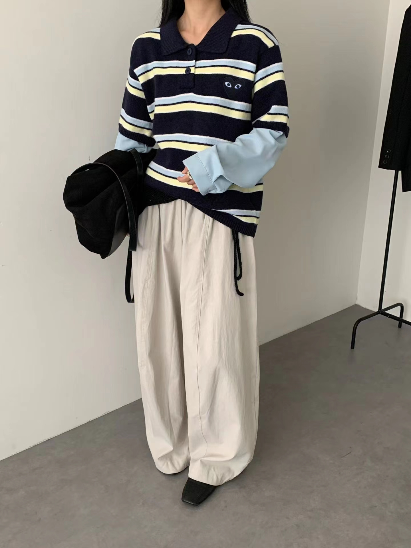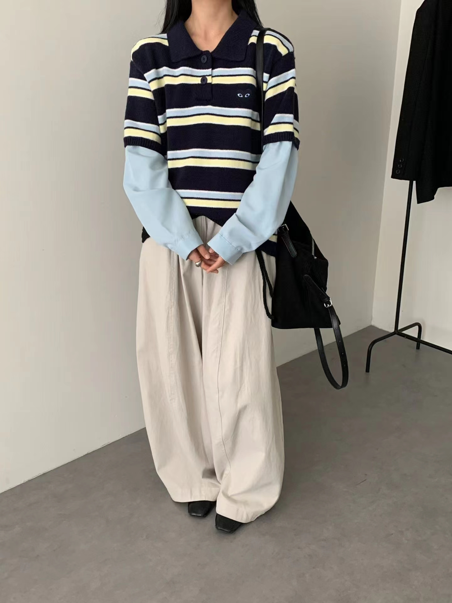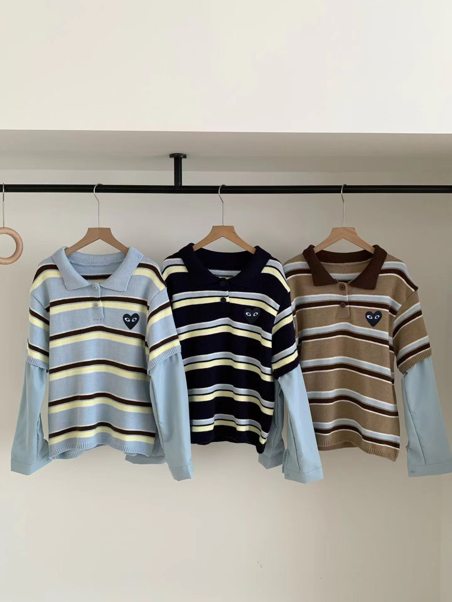 POLO条纹毛衣设计风格:采用复古 Polo 领设计,领口和条纹中的深棕色元素增添复古质感,蓝棕相间的条纹组合清新又不失沉稳,整体风格兼具复古学院风与街头潮流感。-胸前的黑色爱心图案带有白色眼睛装饰,是 Play 系列的标志性符号,极 具辨识度。版型与穿搭:短袖针织版型,图中搭配浅蓝色长袖衬衫,形成叠穿层次,下身搭配灰色裙装与黑色长裤,展现出当下流行的“混搭风”,既适合日常出街,也能轻松打造出时尚博主般的造型感。