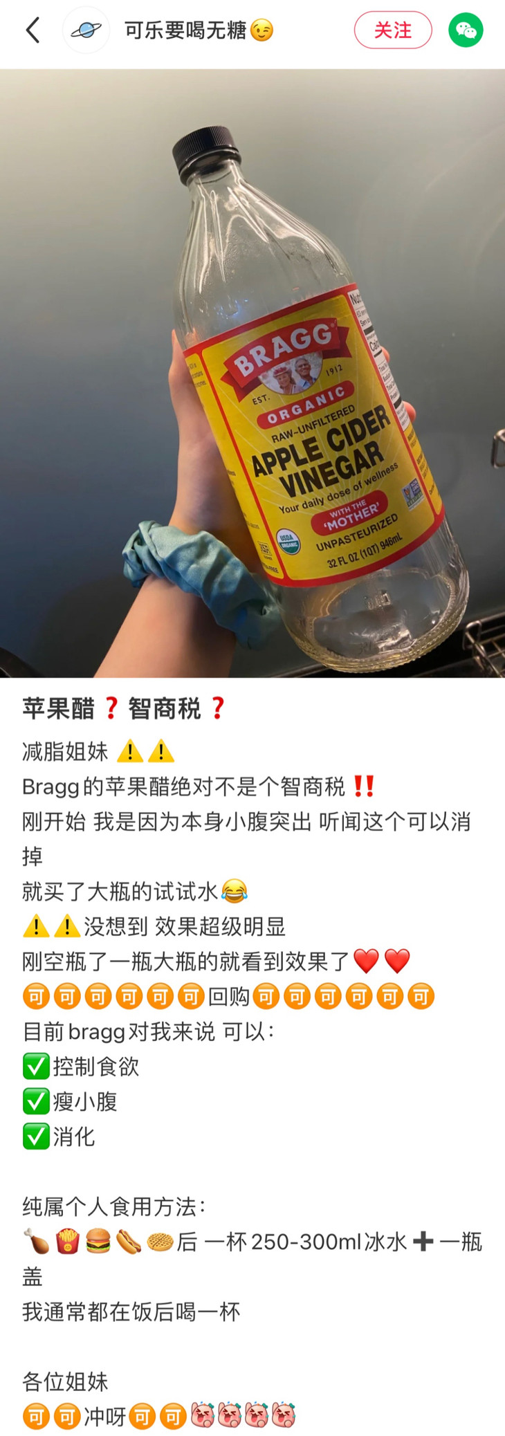 苹果醋是有位老粉要求上的,作用多多!减肥、利便、刮油,还可以用来做面膜,喷头发,清洁!趁着露肉季节即将到来,赶紧安排上,来辅助减肉大计!记得我上学那会就很流行苹果醋减肥了,没想到兜兜转转十几载,又重新大火!