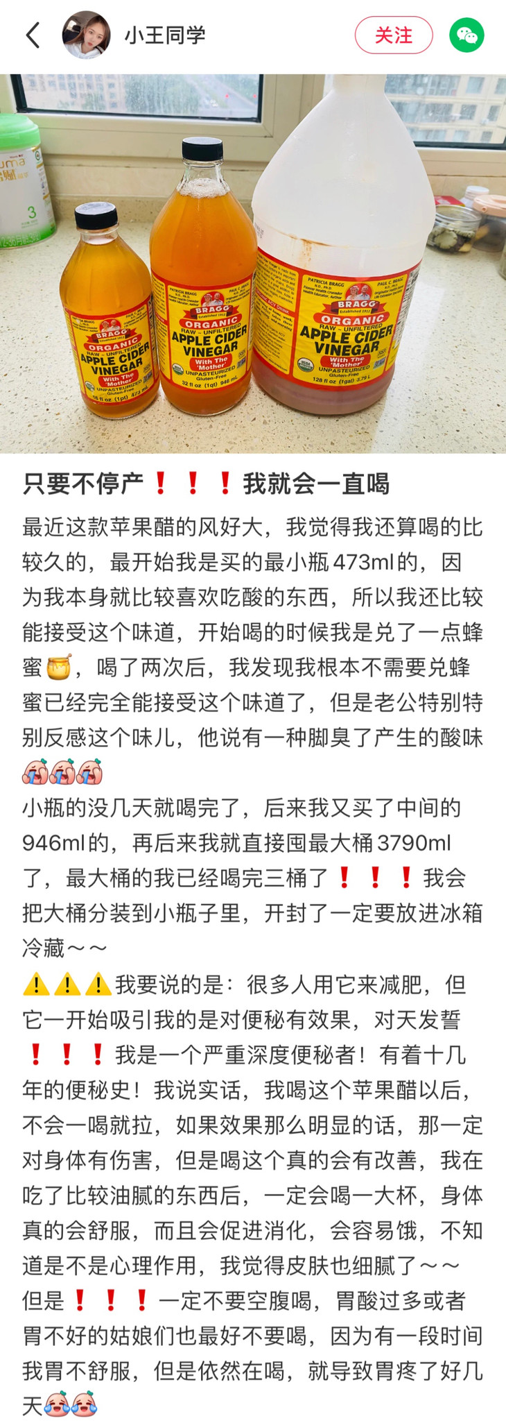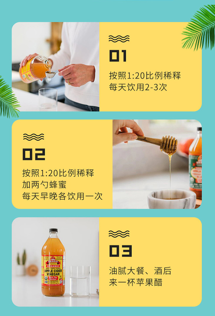 Bragg苹果醋一共有两种规格,473ml和946ml,每天只喝2-3勺,小瓶也能喝很久哦!苹果醋自然发酵浓度高,开瓶之后闻起来超级酸,甚至有点臭臭,瓶底还会有一缕缕的沉淀物漂浮,那就是“醋母”了,它是酵母和益生菌、维生素等的结合体,是苹果醋里的有效成分。喝的时候一般先摇一摇,再用1:20比例勾兑温水,直接喝就可以了,切记不要用热开水哦,以免破坏活性,一瓶就能喝上个把月!