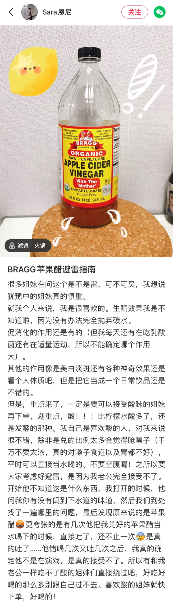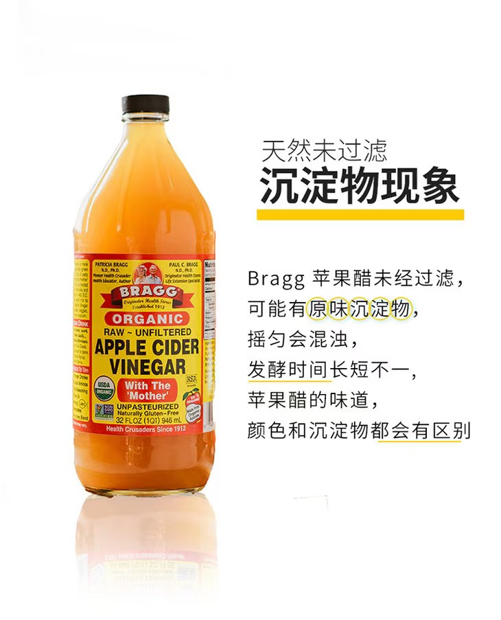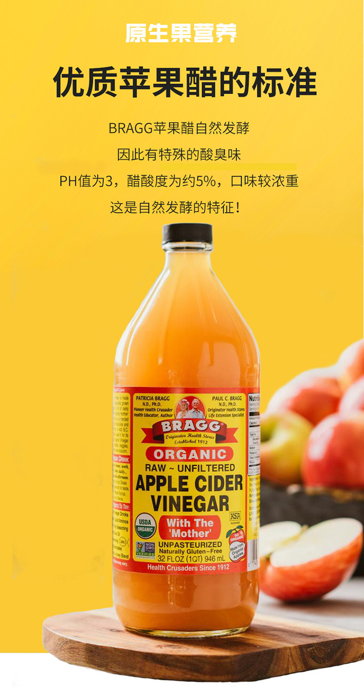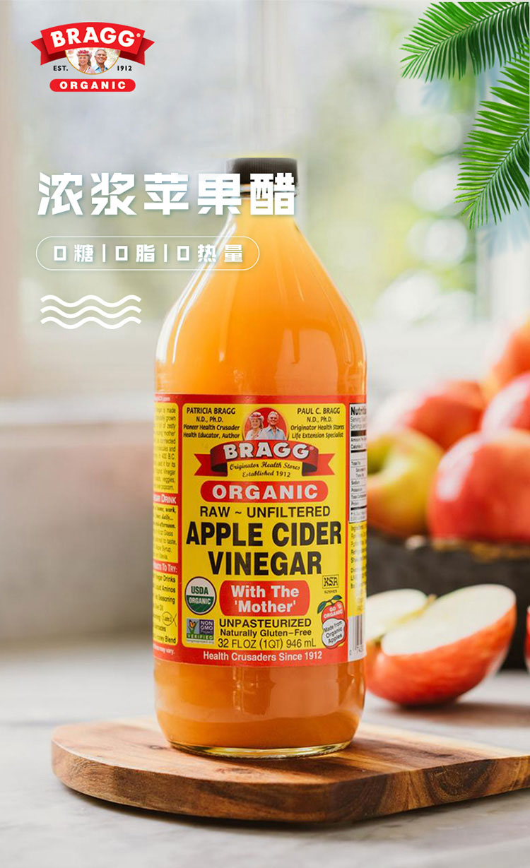 我选的苹果醋是美国Bragg的,作为110年健康膳食品牌,一直是健康鲜活食品的代名词,坚持制作简单、干净、价格合理的健康产品。品牌的董事会由医生、营养师和科学家组成,帮助指导产品的创新开发,不管是剂量还是质量都基于临床研究,可以放心食用。Bragg的苹果醋非常纯粹,不含添加剂,因此有着自然发酵醋的特性,0糖0热量0脂肪,ph值约为3,每一口都是原始自然的酸甜。