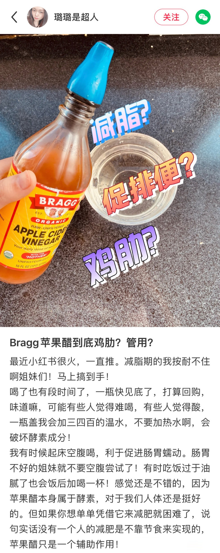 其实,苹果醋一直在明星达人中风靡。在国外,水果姐、贝嫂都是苹果醋的忠实粉丝,国内不少女明星也是持续打卡。苹果醋能够通过酵母、益生菌等来帮助肠道建立良好的循环,调理肠胃环境,加快脂肪分解。《功能食品杂志》上一项临床试验也表明,苹果醋可能有助于掉肉,每天2-3勺苹果醋,加速肠道运动!