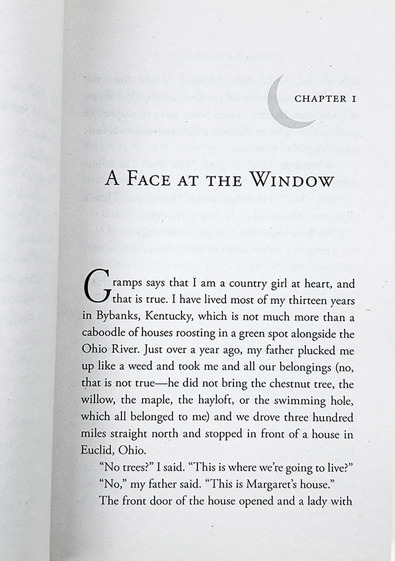 Gramps says that I am a country girl at heart, and that is true. I have lived most of my thirteen years in Bybanks, Kentucky, which is not much more than a caboodle of houses roosting in a green spot alongside the Ohio River. just over a year ago, my father plucked me up like a weed and took me and all our belongings (no, that is not true—he did not bring the chestnut tree, the willow, the maple, the hayloft, or the swimming hole, which all belonged to me) and we drove three hundred miles straight north and stopped in front of a house in Euclid, Ohio.