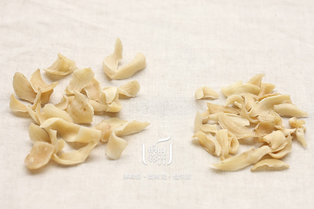 昀蓉时光的无硫龙牙百合(左)与市售硫熏百合(右)对比