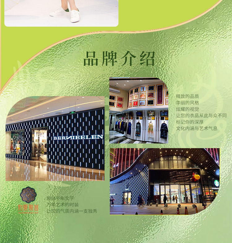 行业首家从事文创研发的女装品牌-伯妮斯茵 品牌风格:源自千年文学和万年艺术的时装,让你的气质内涵一枝独秀,精彩的品质,华丽的风格,炫耀的视觉,让你的衣品从此与众不同,标记你深厚的文化内涵与艺术气息。