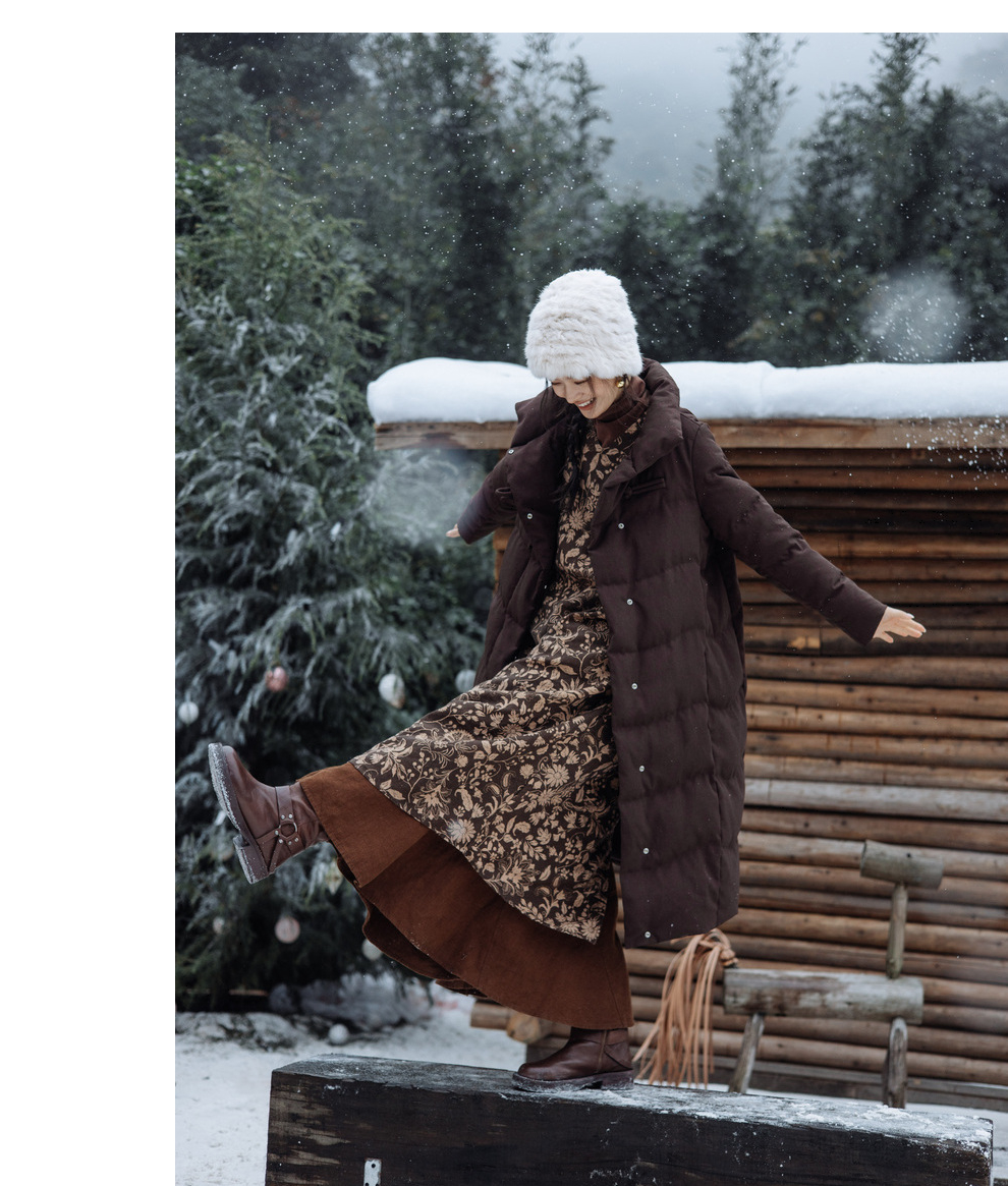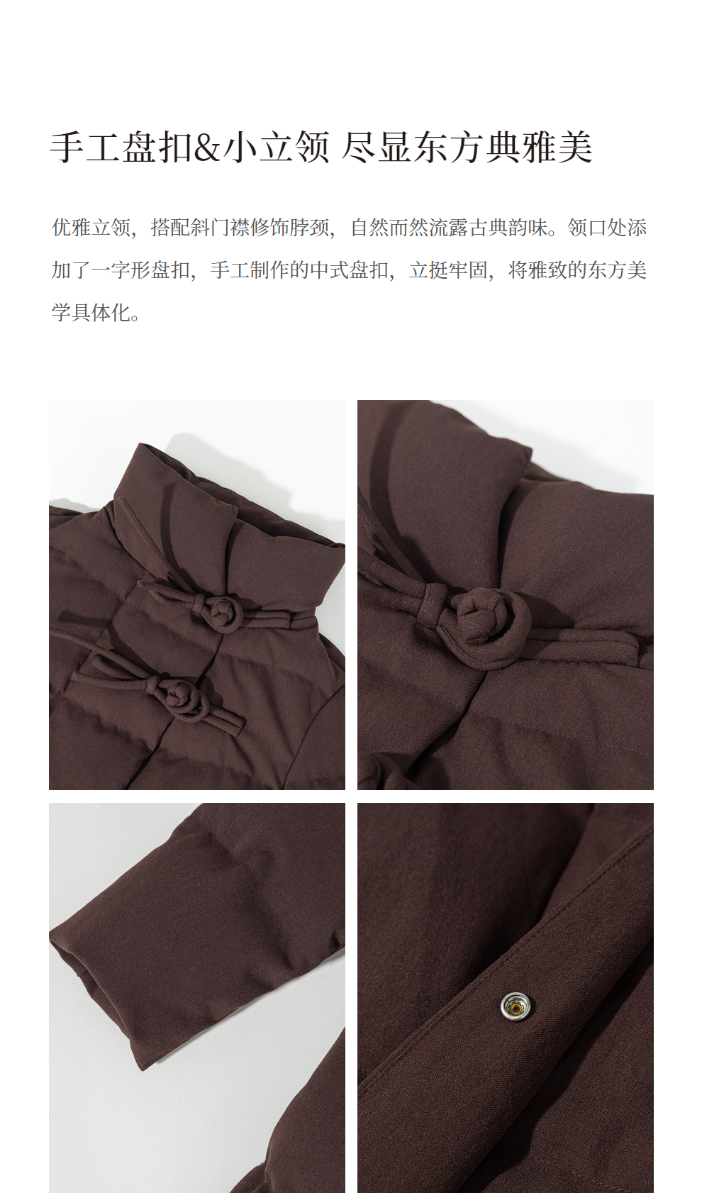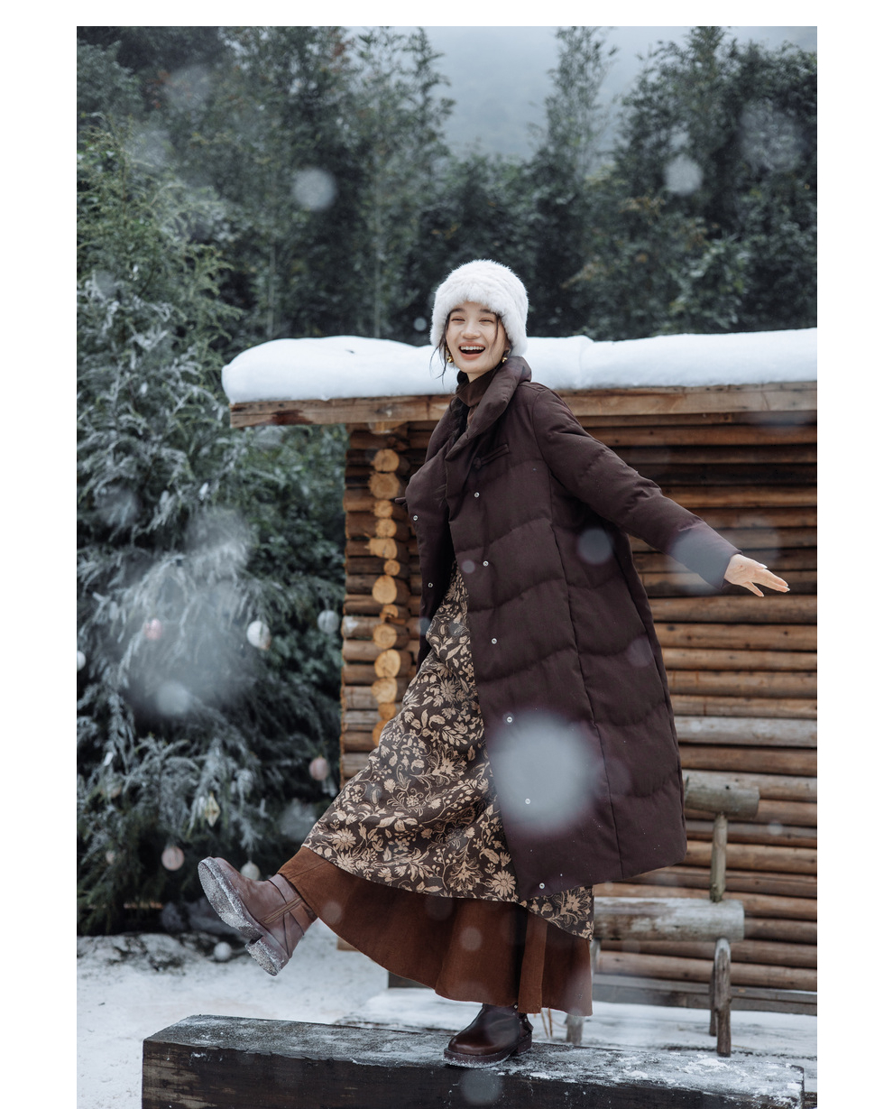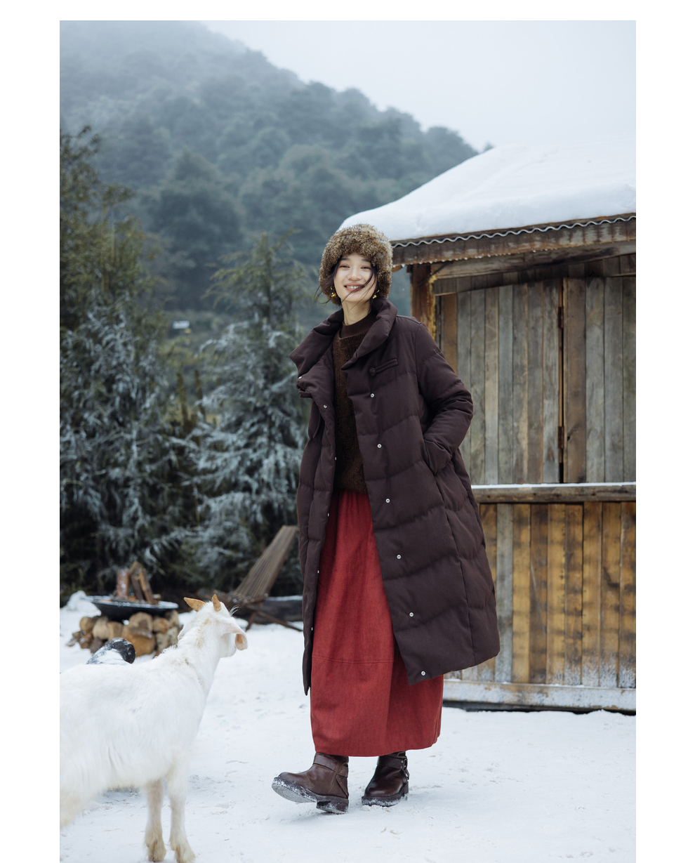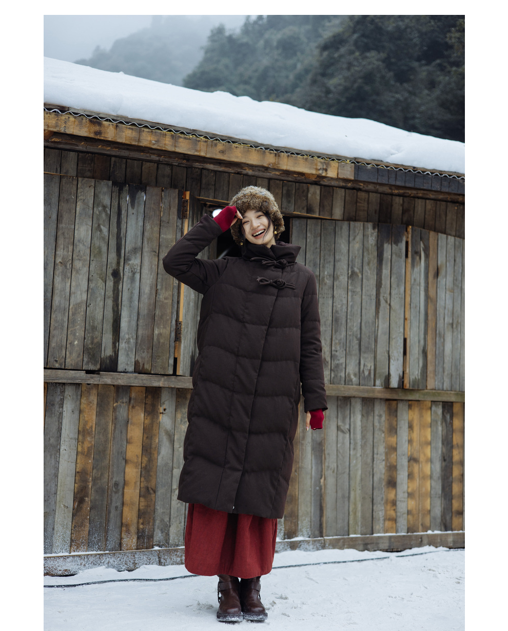 绽放868朵/冬季95白鹅绒中式盘扣磨砂质感立领长款中空纱羽绒服