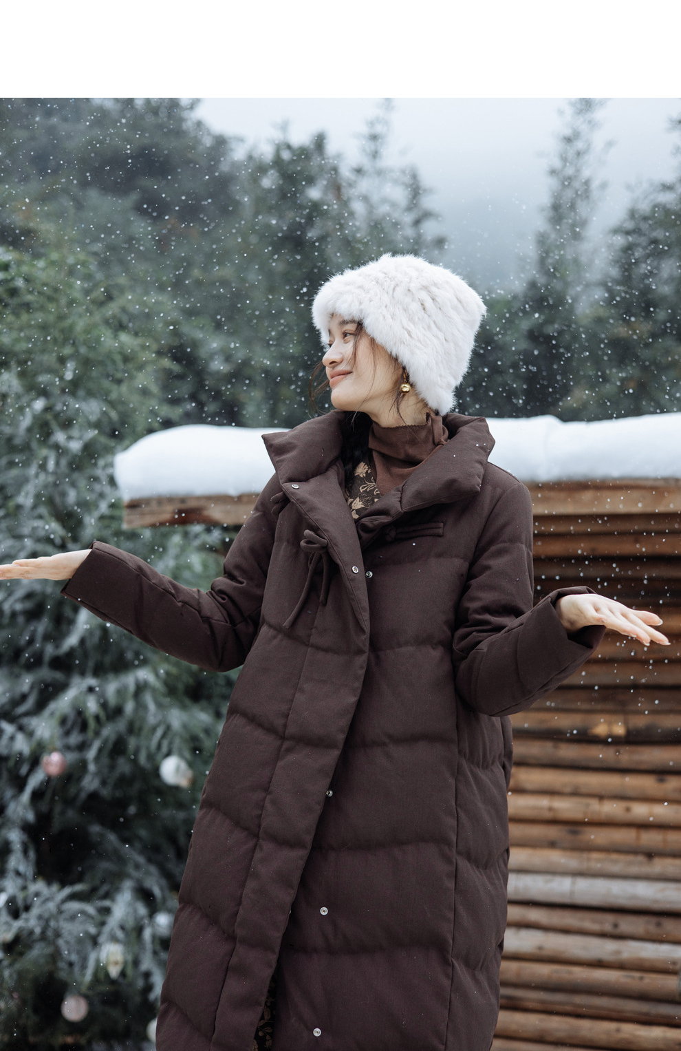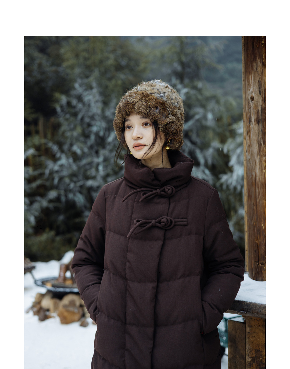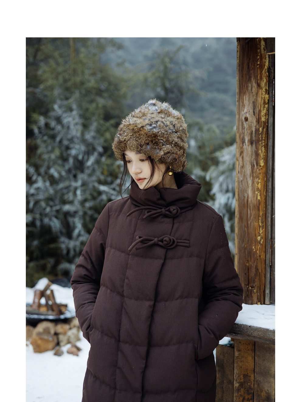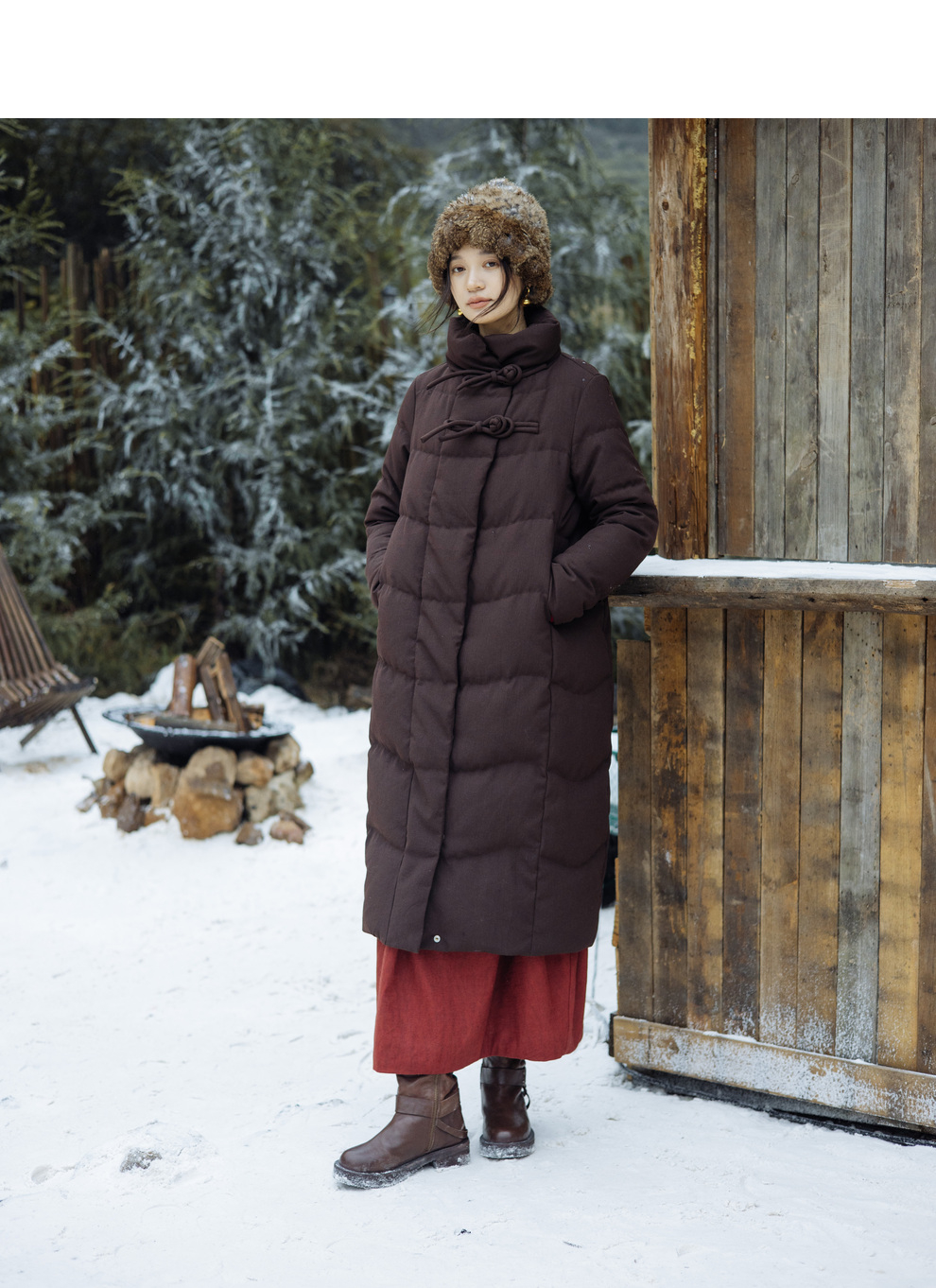 绽放868朵/冬季95白鹅绒中式盘扣磨砂质感立领长款中空纱羽绒服