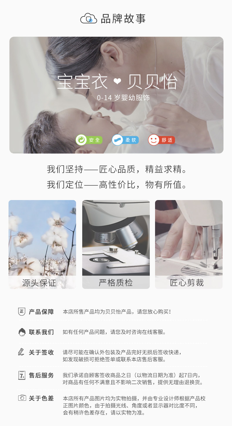 - 贝贝怡专注0-6岁婴幼儿服饰,坚持安全、柔软、舒适的产品理念,为千万中国家庭提供超高品质、安全可靠的婴幼儿服饰产品,妈妈放心,宝宝开心!
