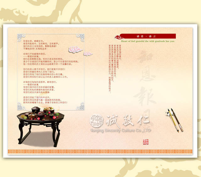 【基本信息】: 产品材质: 卡片:250g白卡纸 信封:80g铜版纸,粉红色,正反面单色印刷 内页:80g双胶纸,白色,正面4色印刷,反面无印刷 包装袋:3丝OPP 贺卡(含内页一张,信封一个,透明包装袋一个) 【产品规格】: 14.9*10.6cm 打开:29.8*21.2cm 【产品文化】: 新款感恩卡*感恩员工家属⊙壹 落叶在空中盘旋,谱写着一曲感恩的乐章,那是大树对滋养它大地的感恩;白云在蔚蓝的天空中飘荡,绘画着一幅幅感人的画面,那是白云对哺育它的蓝天的感恩。因为感恩才会有多彩的世界,因为感恩才会有真挚的情感,因为感恩才让我们懂得生命的真谛。 【感恩员工家属—峥嵘路感恩情卡】 【主题语】:峥嵘路感恩情 【副标题语】: 家是温馨的港湾 家是幸福的基石 家是远航的起点 家是疲惫的栖息地 感谢你们敬爱的家属们 是你们用理解让远方的家人能够安心工作 感恩你们无私的奉献和对我们事业的支持 【内页及其他】: 回首往昔,峥嵘岁月。艰苦的航程中,没有鲜花,没有掌声。我们的员工没有抱怨,默默地奉献!不懈地坚持!无悔地追求!在他们不知疲倦的背后,——敬爱的家属,您们总是默默无闻,有的只是支持和牵挂。多少个日夜您们不能同聚同欢,多少个日夜您们挂肚牵肠。每一位优秀的员工背后永远都离不开一个温馨的家。您们的亲人离不开您们,我们更离不开您们!是您们把最优秀的人交给了我们。是您们传给了他们克服困难的信心和力量。是您们用实际行动让远方的亲人能够安心工作。在每份沉甸甸的收获里,都有您们,——敬爱的家属有您们艰辛的汗水和卓越的智慧,有您们无私的奉献和真切的关爱,有您们成全大家的高尚情操!是您们顶起了我们的半边天,是您们用支持谱写着一曲曲胜利的凯歌。胜利的荣耀属于企业,更属于全体员工和您们! 【感恩建议】:批量使用可以打印后领导签名、适合在年终发放奖金时赠送,或者单位年会时发放 |