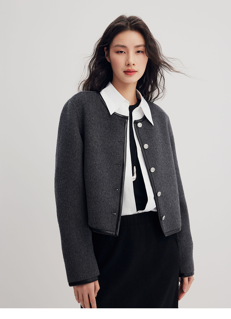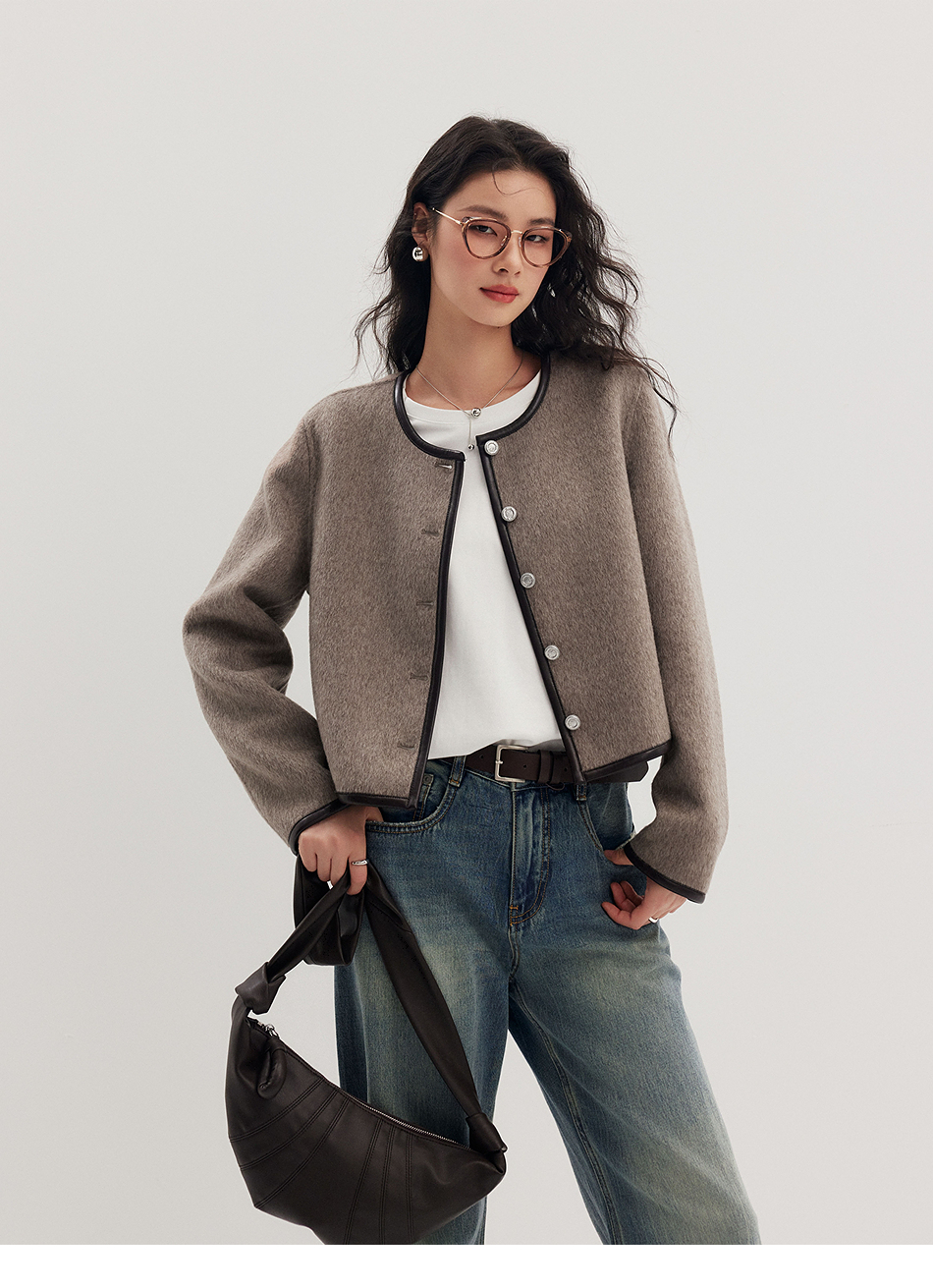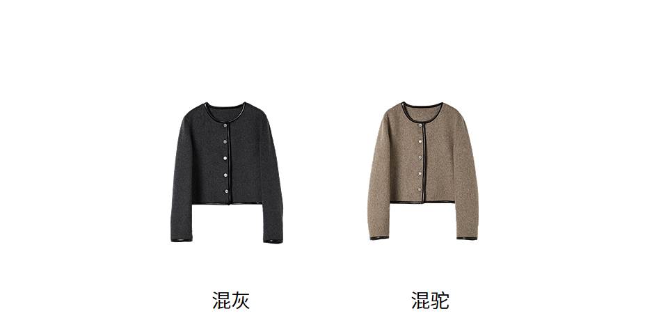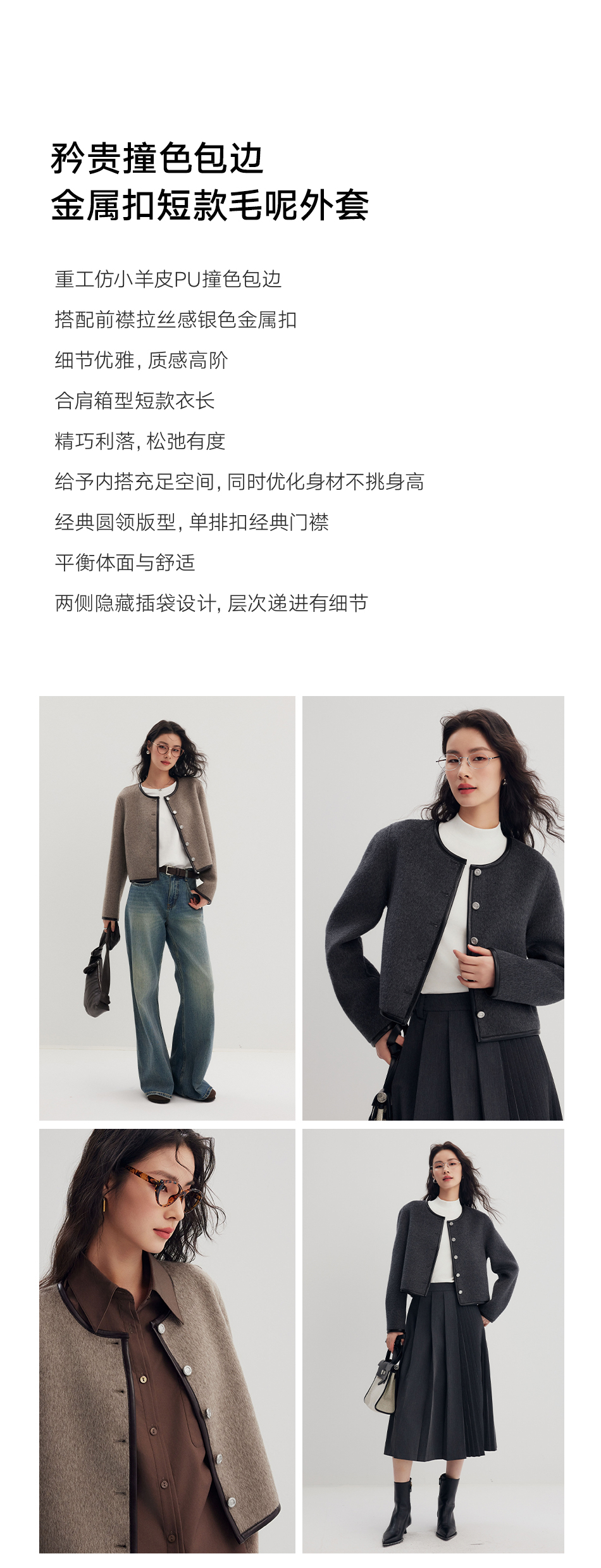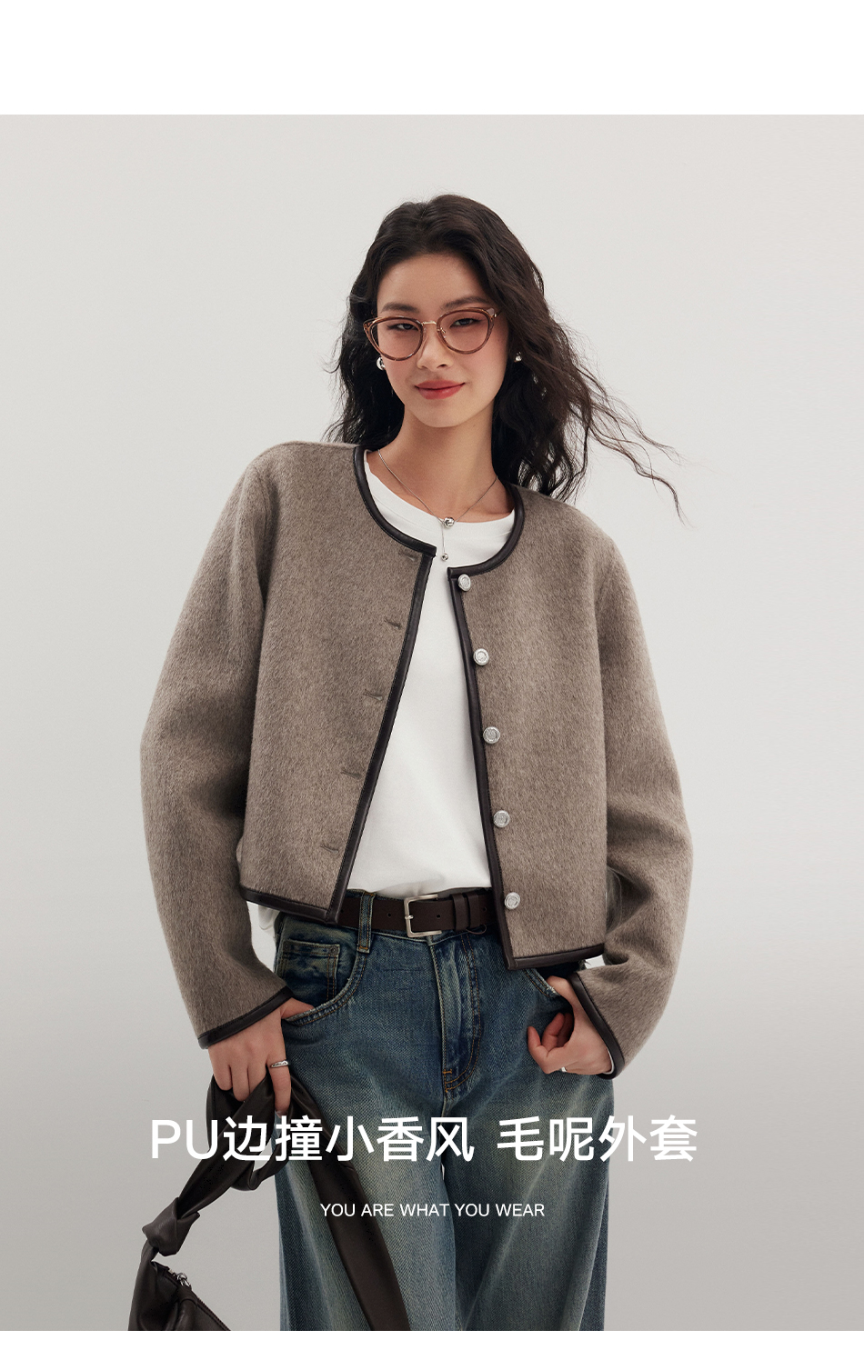 棉仓357666012-PU边撞色短款小香风金属扣毛呢外套