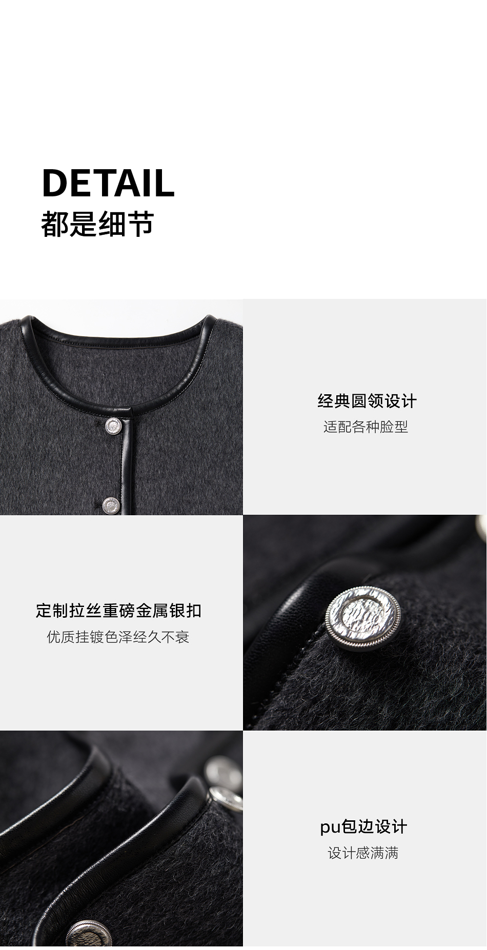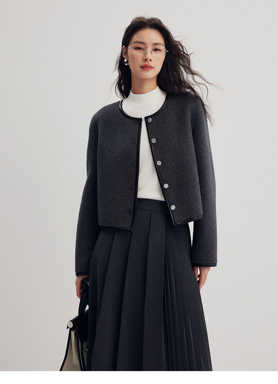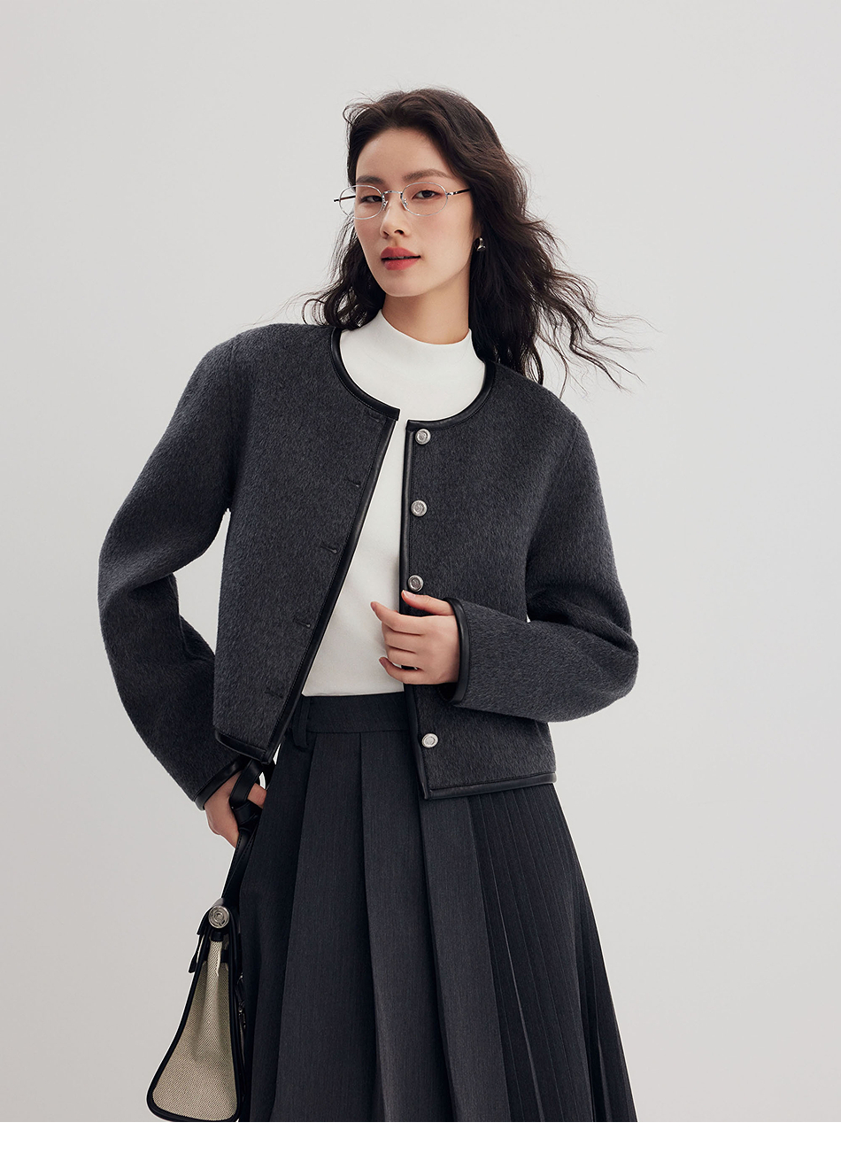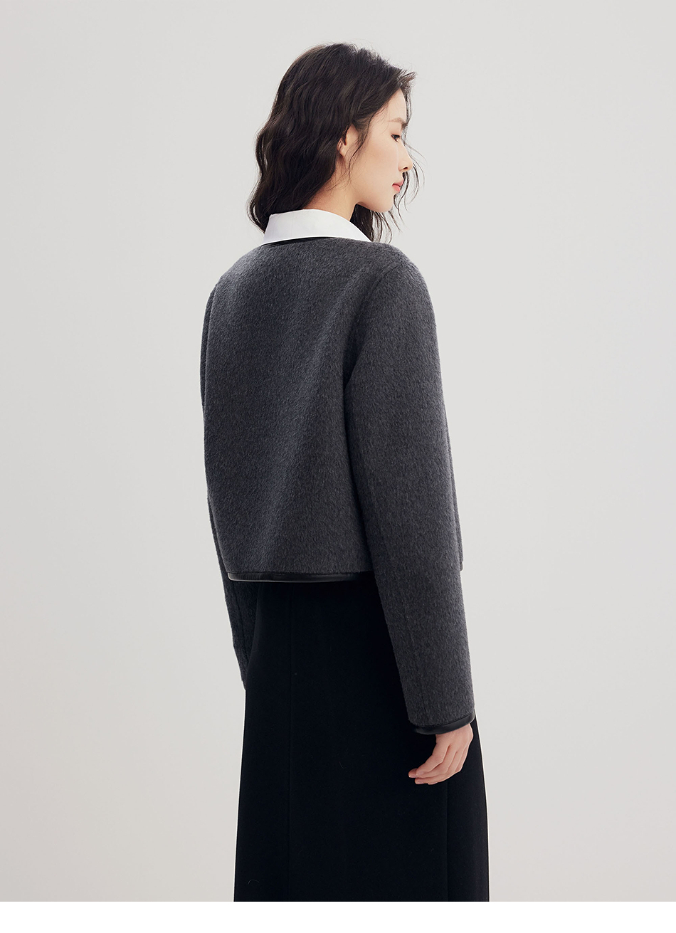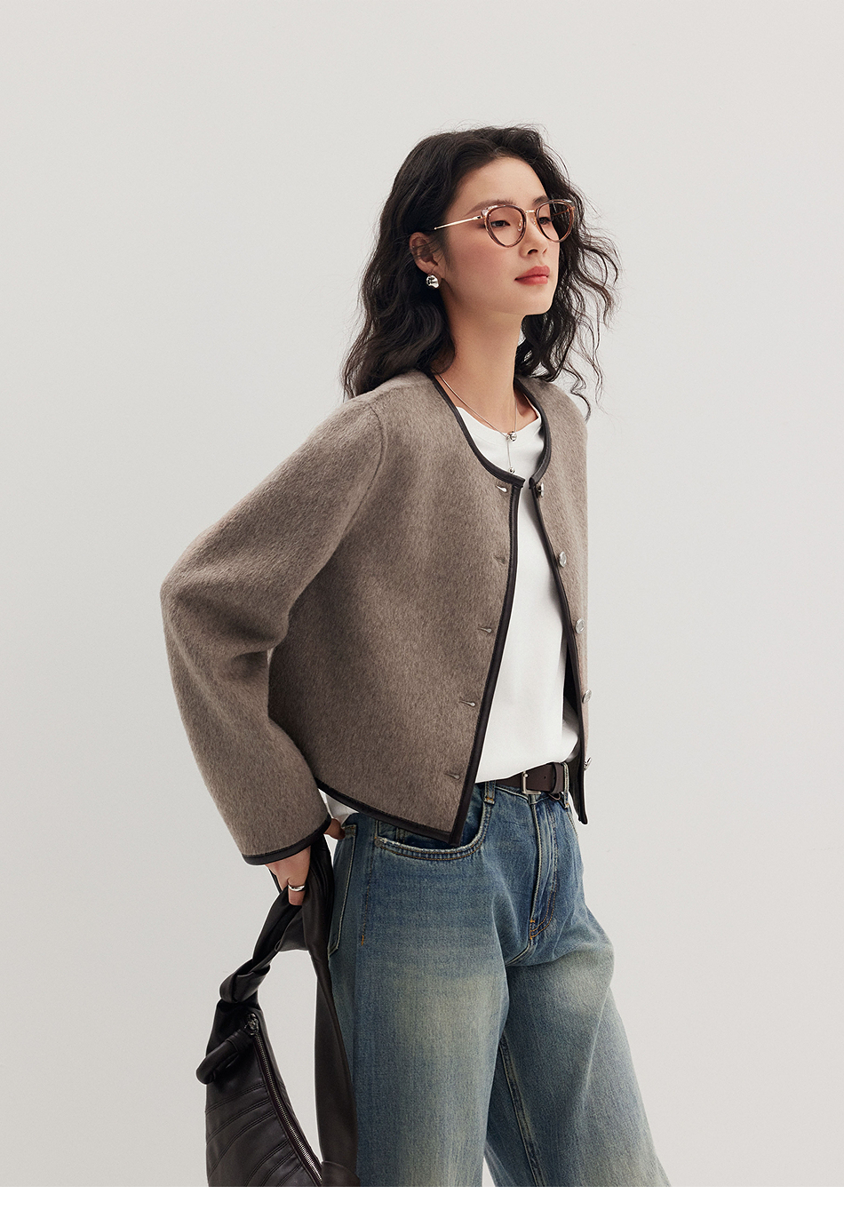 棉仓357666012-PU边撞色短款小香风金属扣毛呢外套