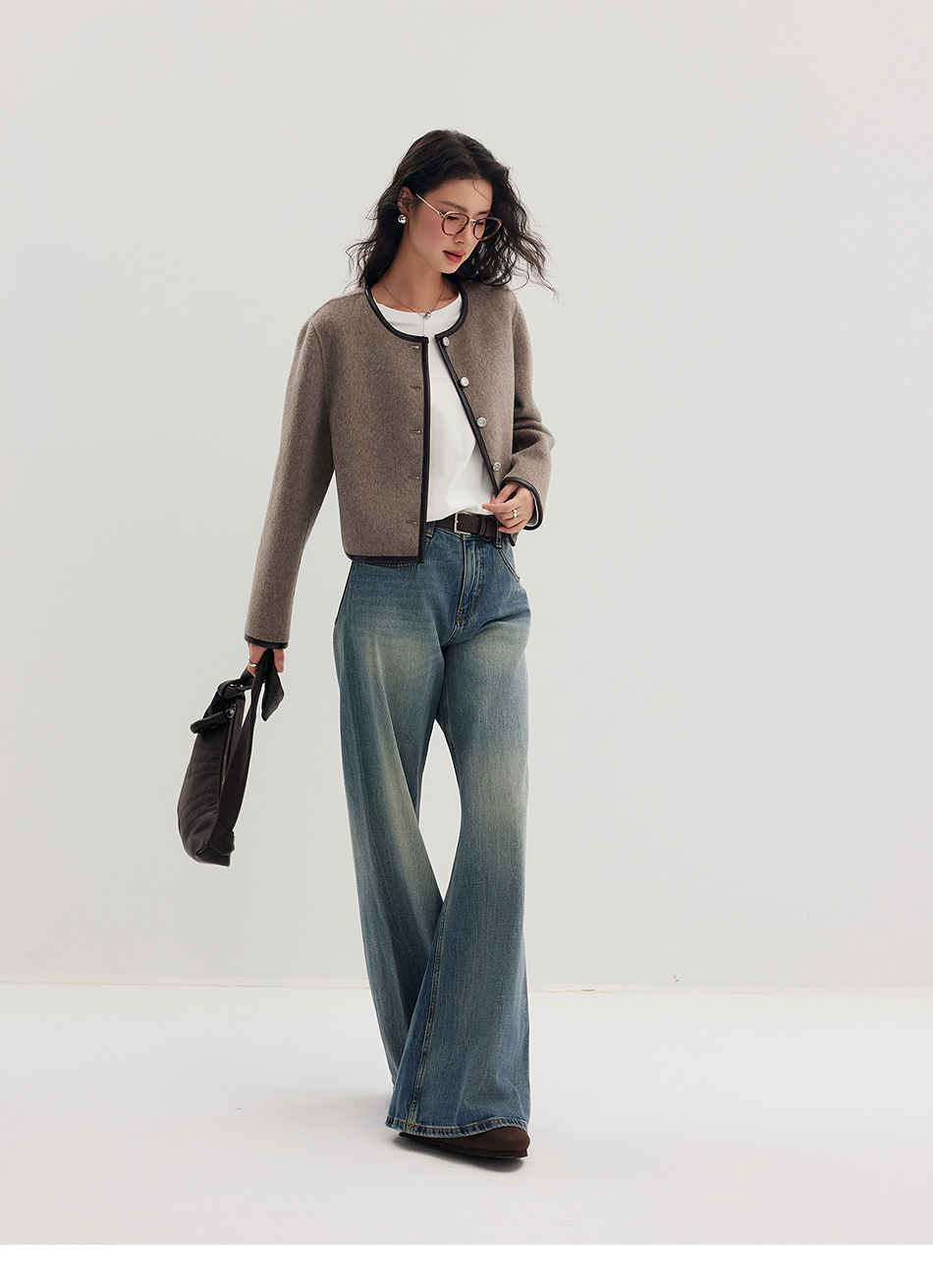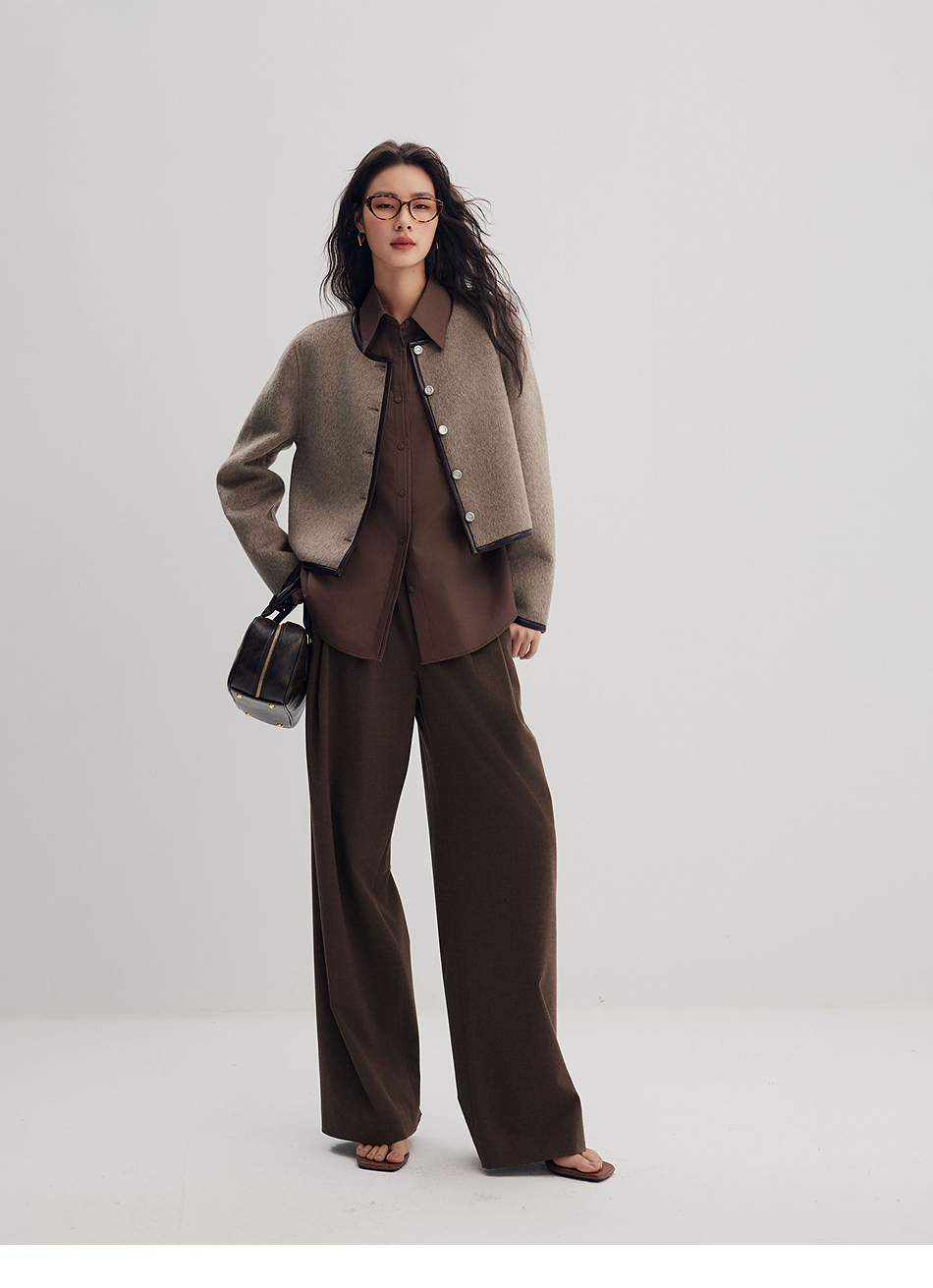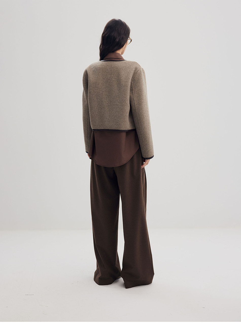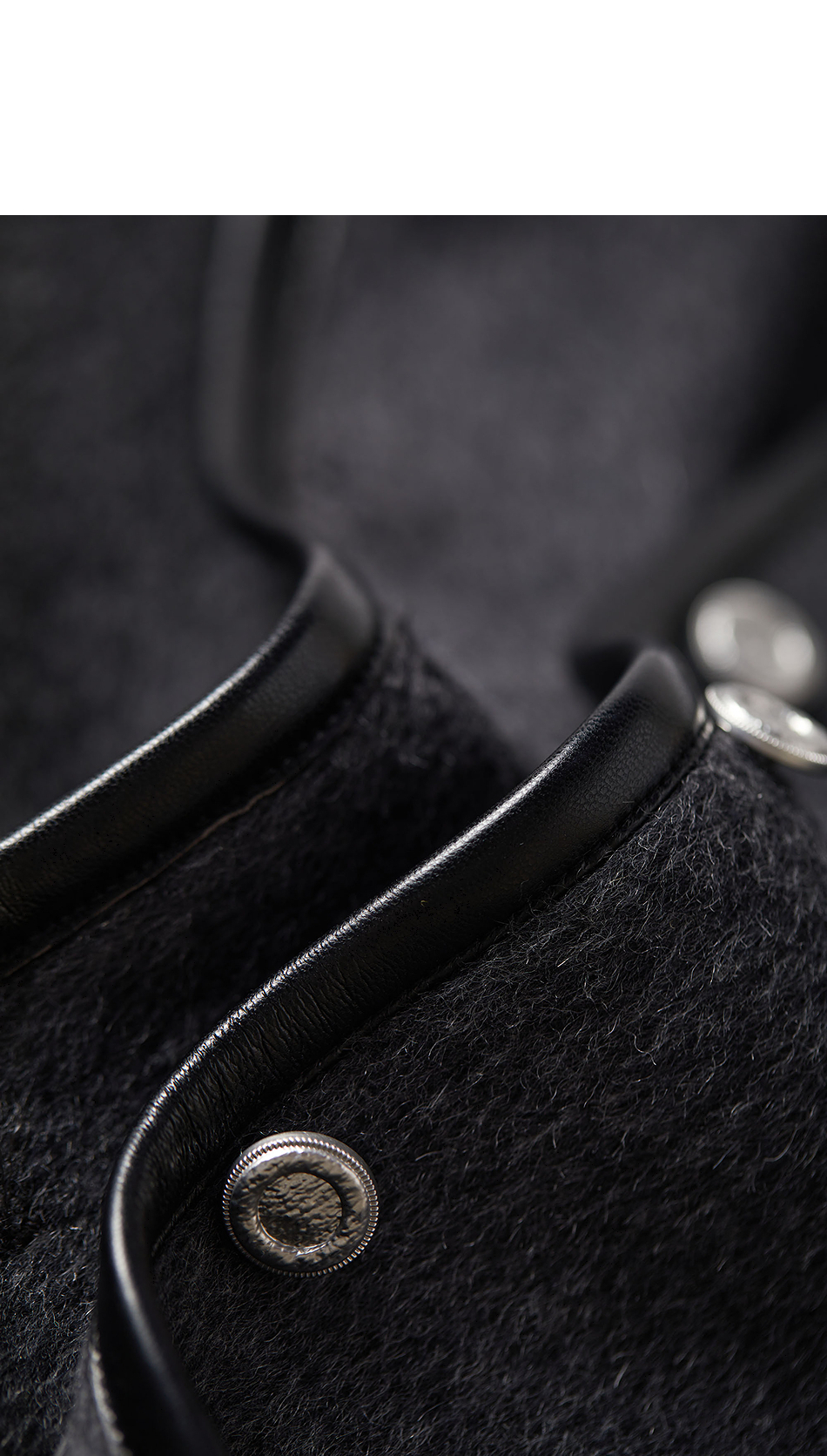 棉仓357666012-PU边撞色短款小香风金属扣毛呢外套