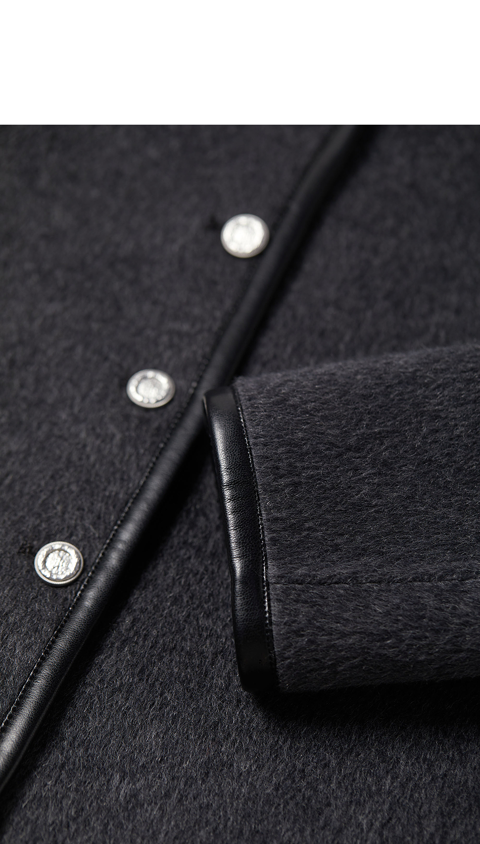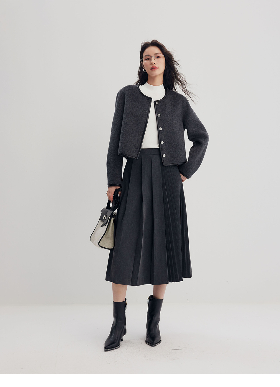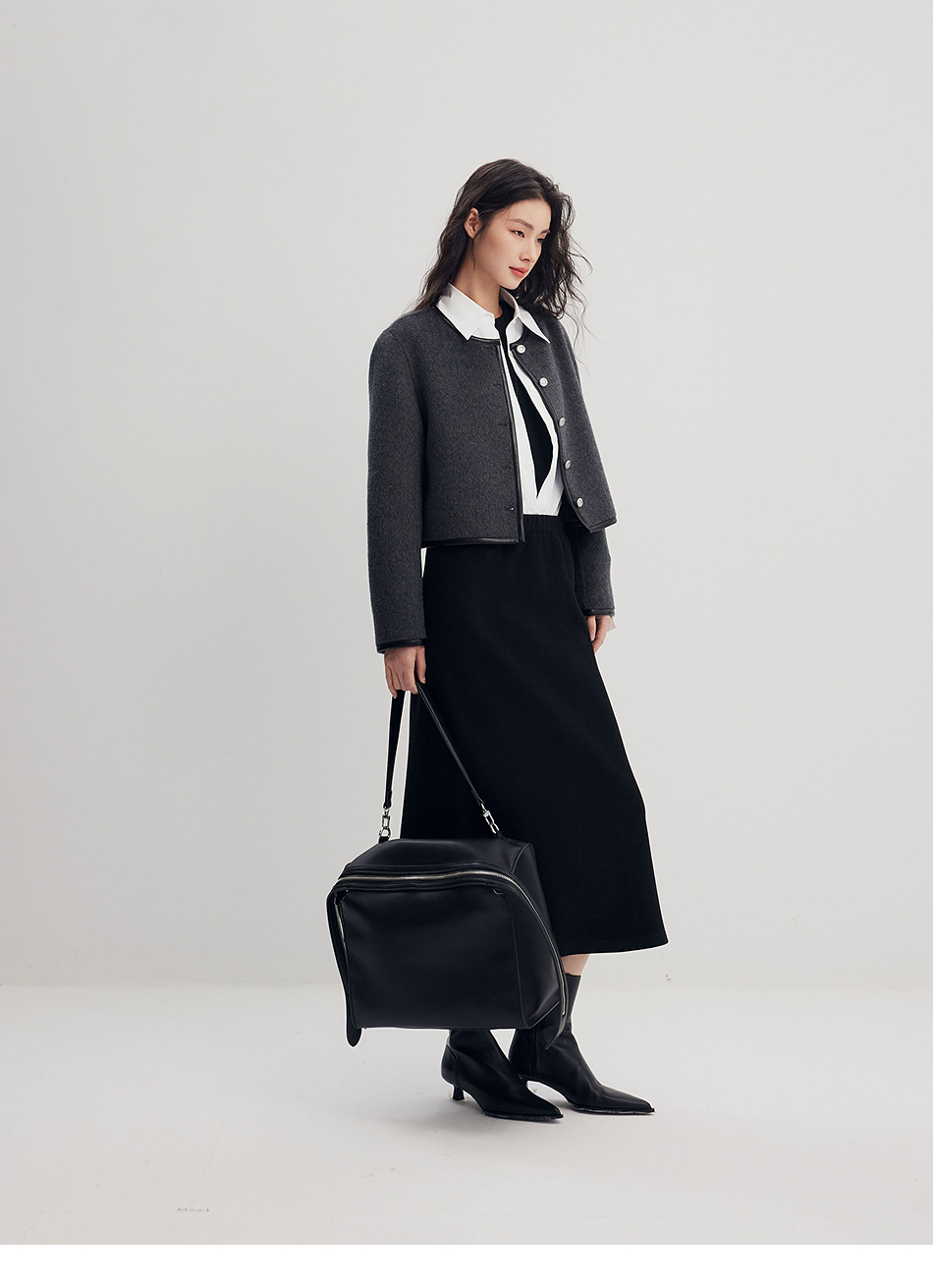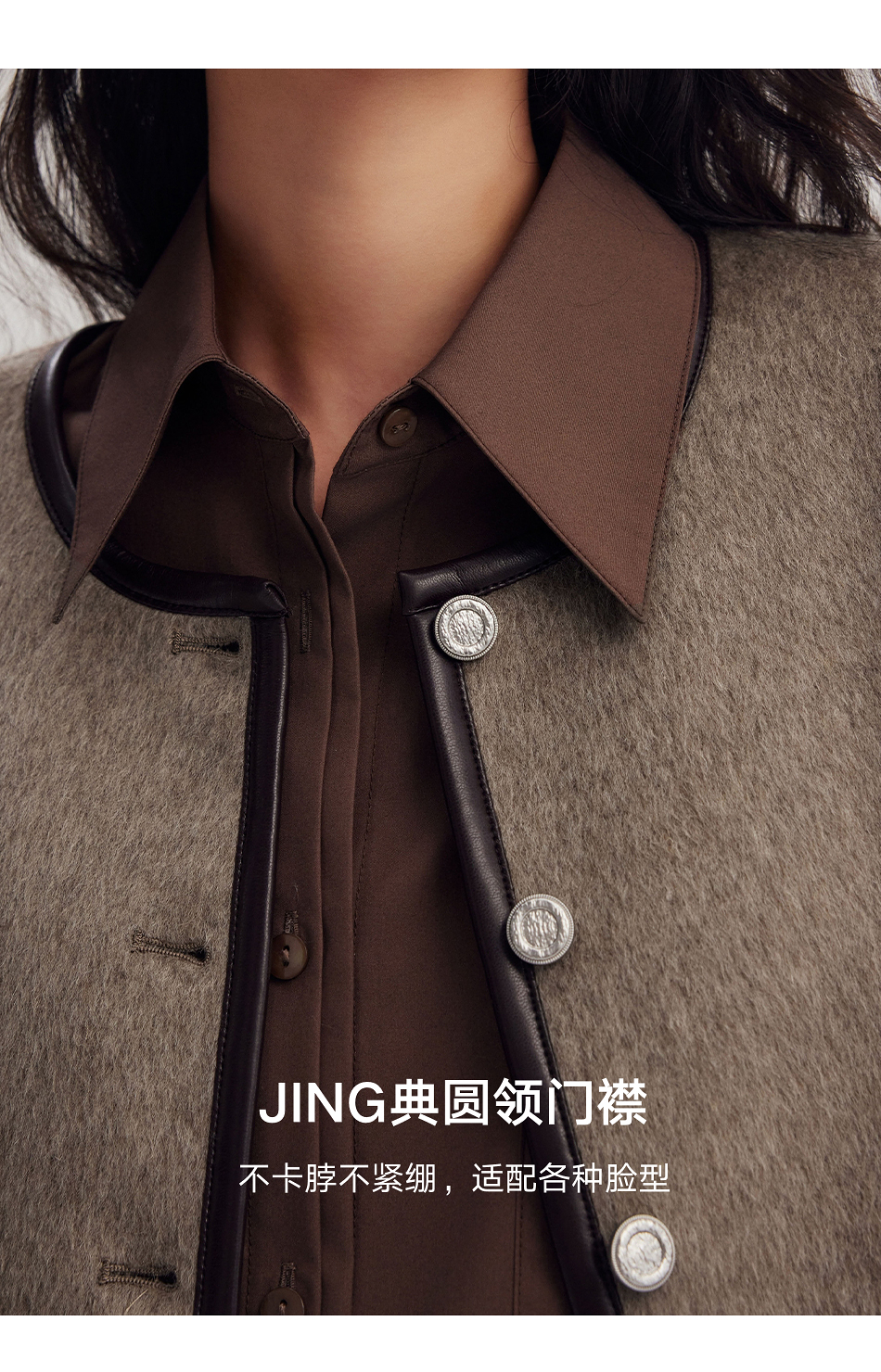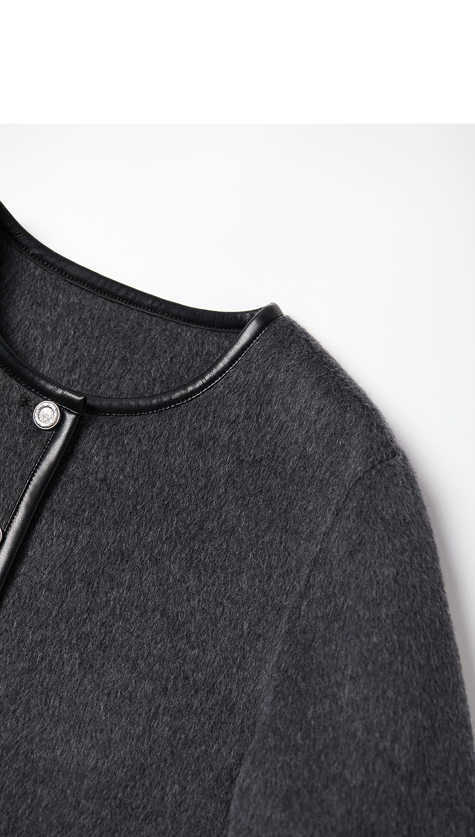 棉仓357666012-PU边撞色短款小香风金属扣毛呢外套