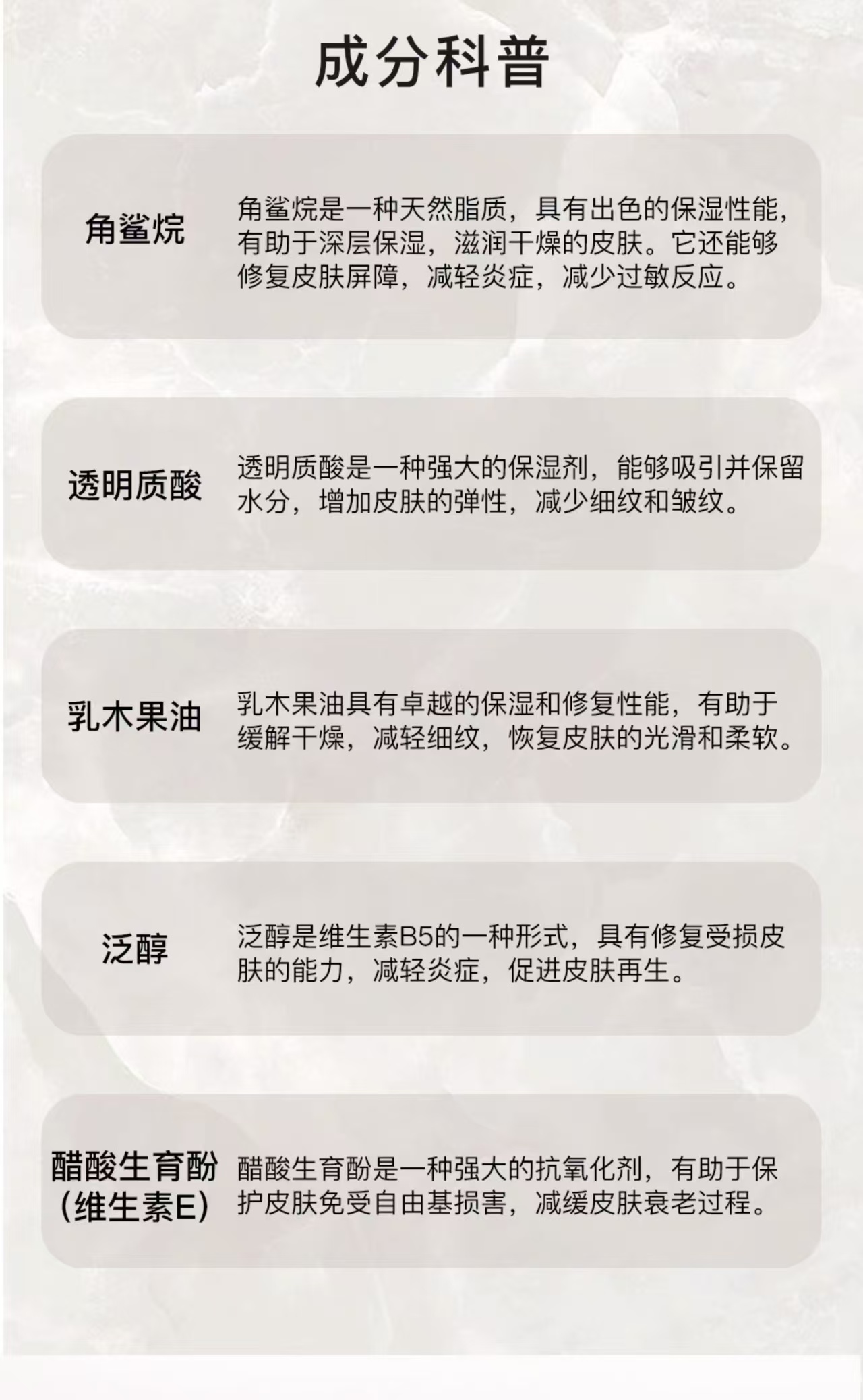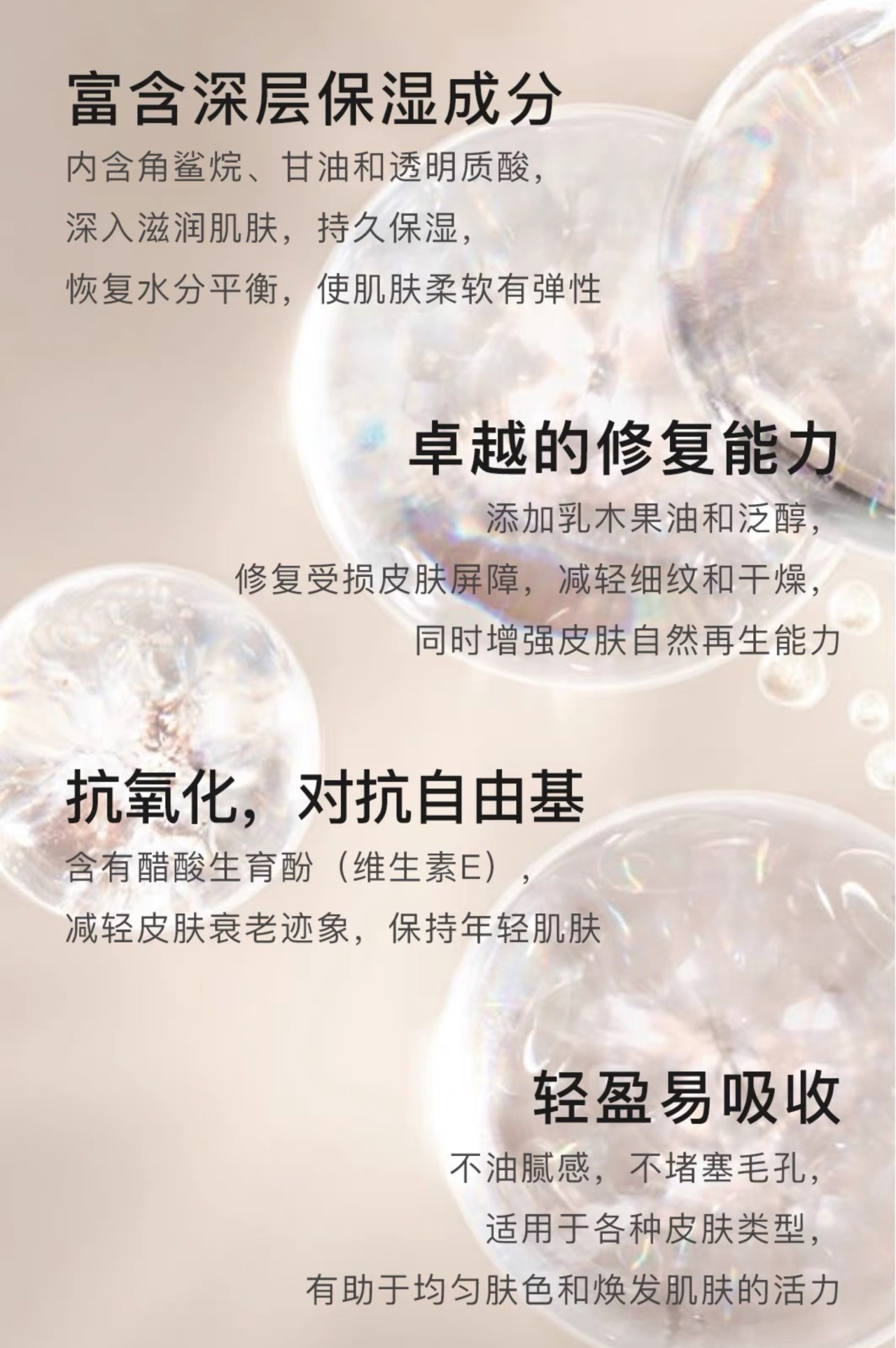 特别值得一提的是,乳液中融入了珍贵的乳木果油与泛醇,这两者如同守护天使,不仅深层滋养,还能有效修复受损的皮肤屏障,温和抚平岁月留下的细纹,缓解因干燥引起的不适,同时激活内在再生机制,促进细胞更新,让肌肤焕发新生般的活力与光泽。