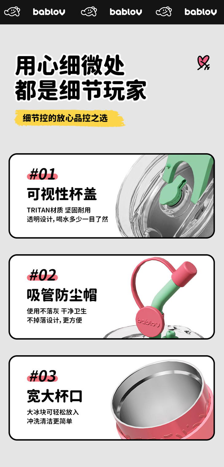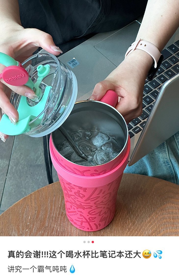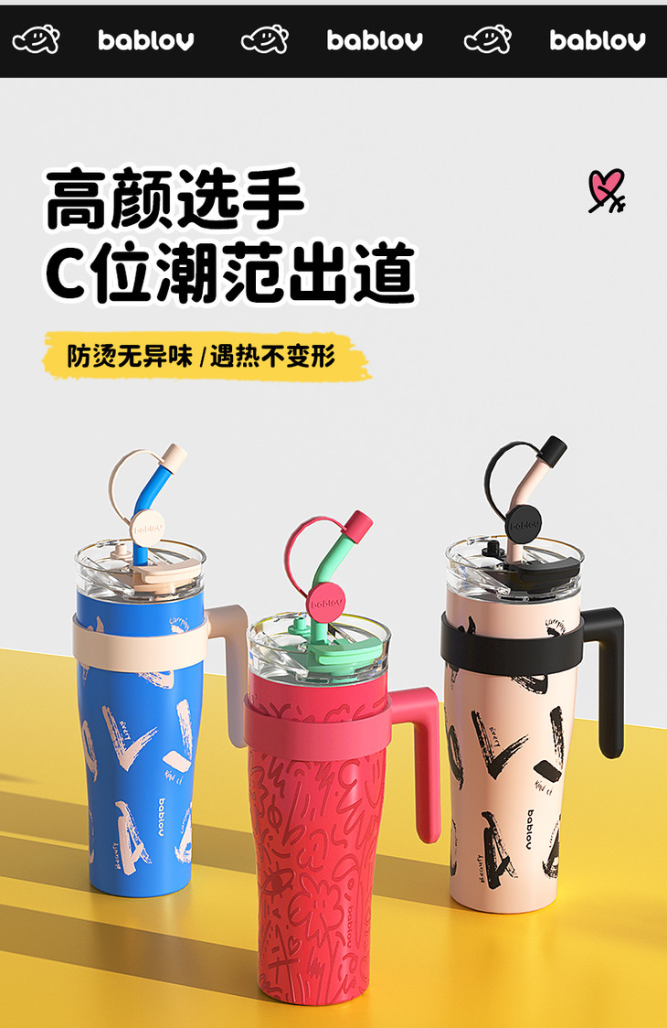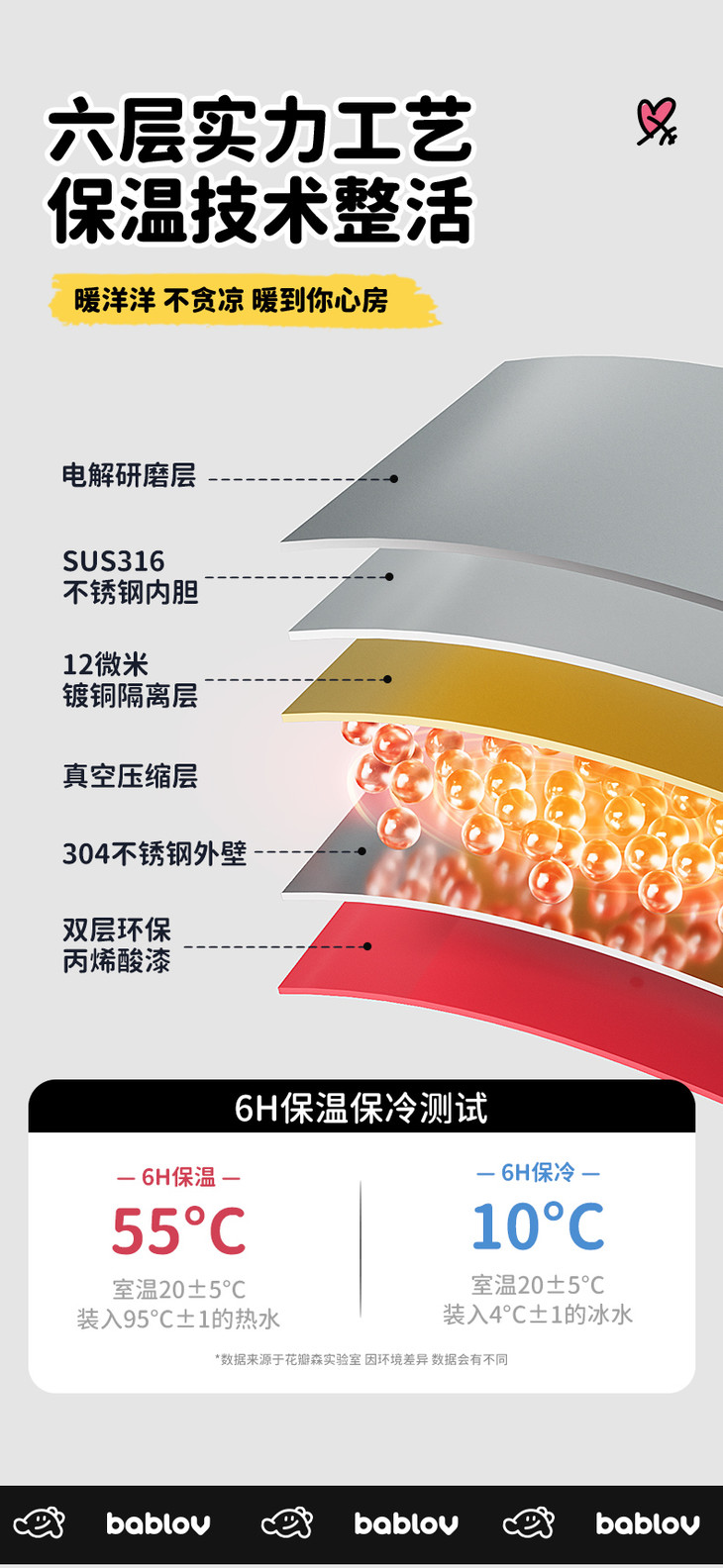 BABLOV保温杯采用六层实力工艺,电解研磨层、SUS316不锈钢内胆、12微米镀铜隔离层、真空压缩层、304不锈钢外壁以及双层环保丙烯酸漆,层层守护,实现6小时长效保温保冷。杯杯内胆是SUS31603不锈钢真空杯体,无论是冰美式、热奶热茶,亦或是气泡水、果汁,都能放心装;一体无缝内胆,保温又保冷;119mm的超大口径杯身,清洗时更是超级方便!直饮品和吸管的双饮设计,想怎么喝就怎么喝!食品级硅胶粗吸管的设计,对于女生来说简直太贴心,不会沾口红!还自带可拆解的防尘帽,防尘也防丢,再加上防滑把手,很好握!