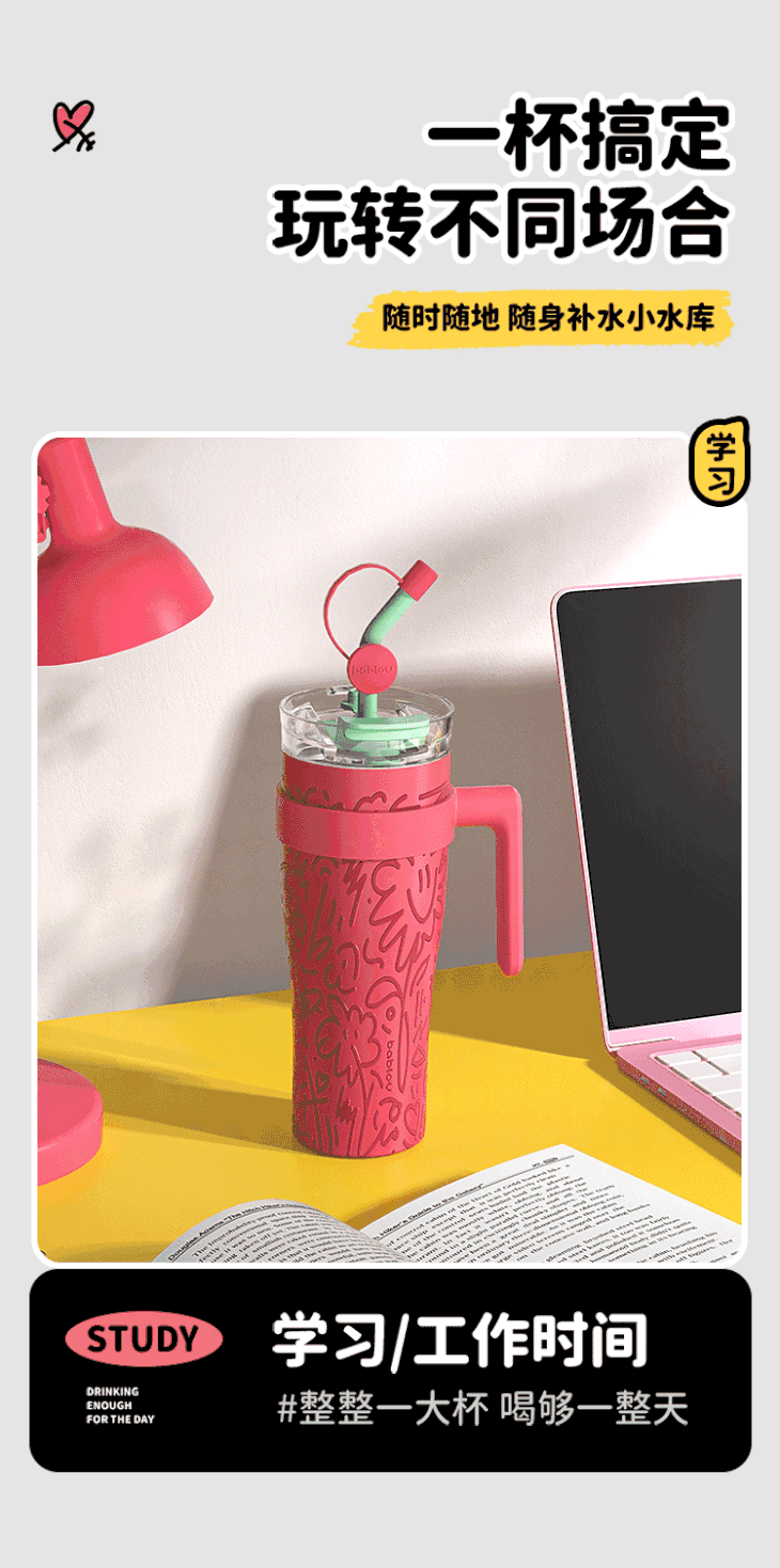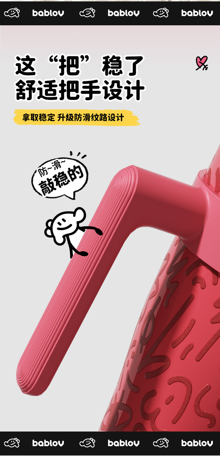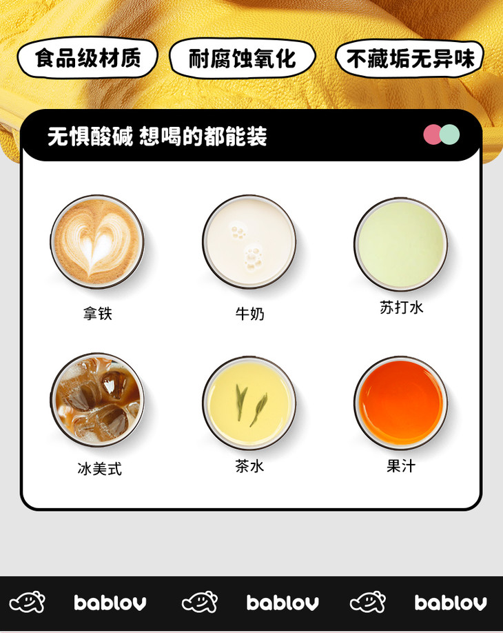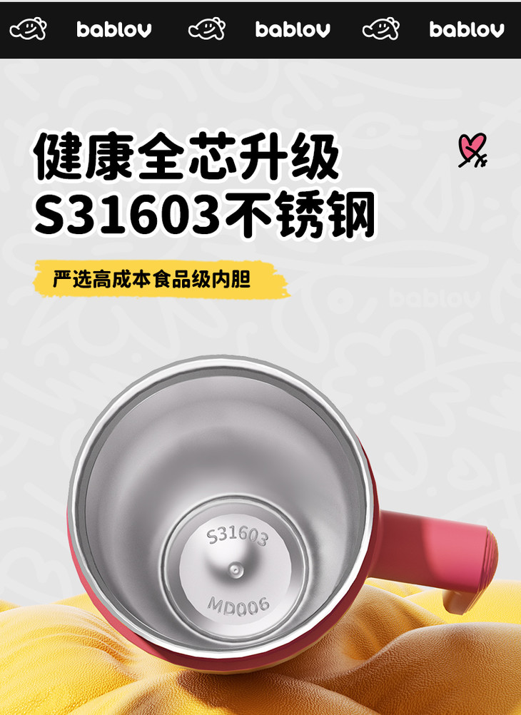 BABLOV保温杯采用六层实力工艺,电解研磨层、SUS316不锈钢内胆、12微米镀铜隔离层、真空压缩层、304不锈钢外壁以及双层环保丙烯酸漆,层层守护,实现6小时长效保温保冷。杯杯内胆是SUS31603不锈钢真空杯体,无论是冰美式、热奶热茶,亦或是气泡水、果汁,都能放心装;一体无缝内胆,保温又保冷;119mm的超大口径杯身,清洗时更是超级方便!直饮品和吸管的双饮设计,想怎么喝就怎么喝!食品级硅胶粗吸管的设计,对于女生来说简直太贴心,不会沾口红!还自带可拆解的防尘帽,防尘也防丢,再加上防滑把手,很好握!