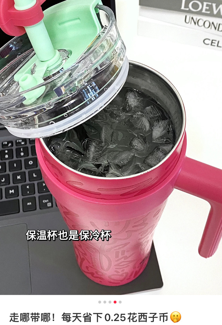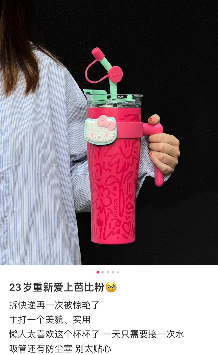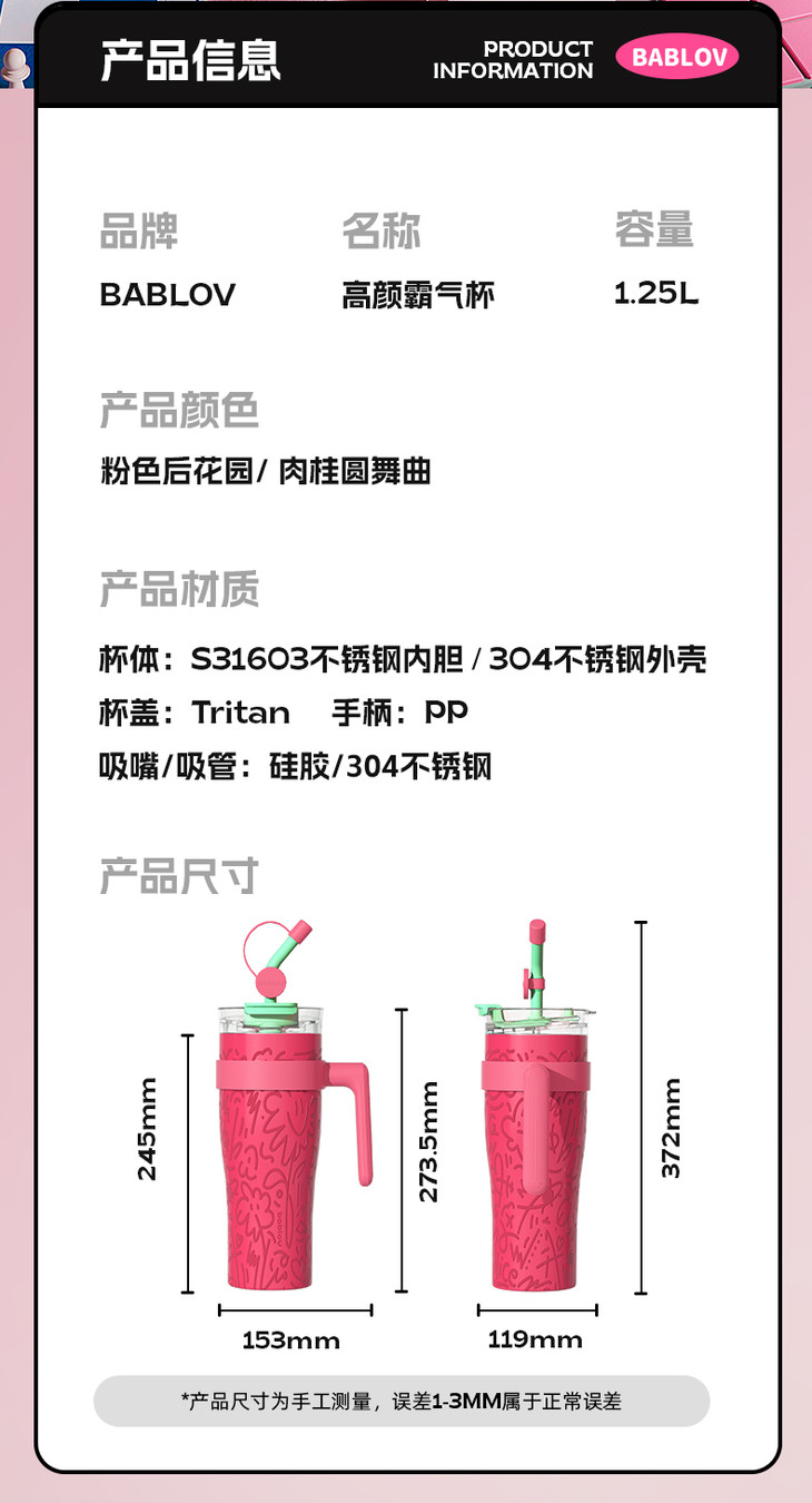 BABLOV保温杯有桃红配果绿的肉桂圆舞曲和粉红配黑的粉色后花园,我自留的是肉桂圆舞曲,就真的很貌美,花还是立体的,泡上玫瑰花茶,绝配!1.25L的大容量,出门逛街或是健身运动,一杯的饮水量就够够的了!而且保热保冷功能都很在线,早上装完热水,到下午也还温热温热的,养生女孩必备!当然装冰美式也非常可,从早冰到晚都不是问题。。。杯杯虽然容量大,但杯身不是太重,去撸铁健身算是很好看的配件了!