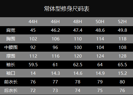 左图模特身高172cm,体重120斤。瘦体型西装(44Y):胸围94cm,腰围84cm;