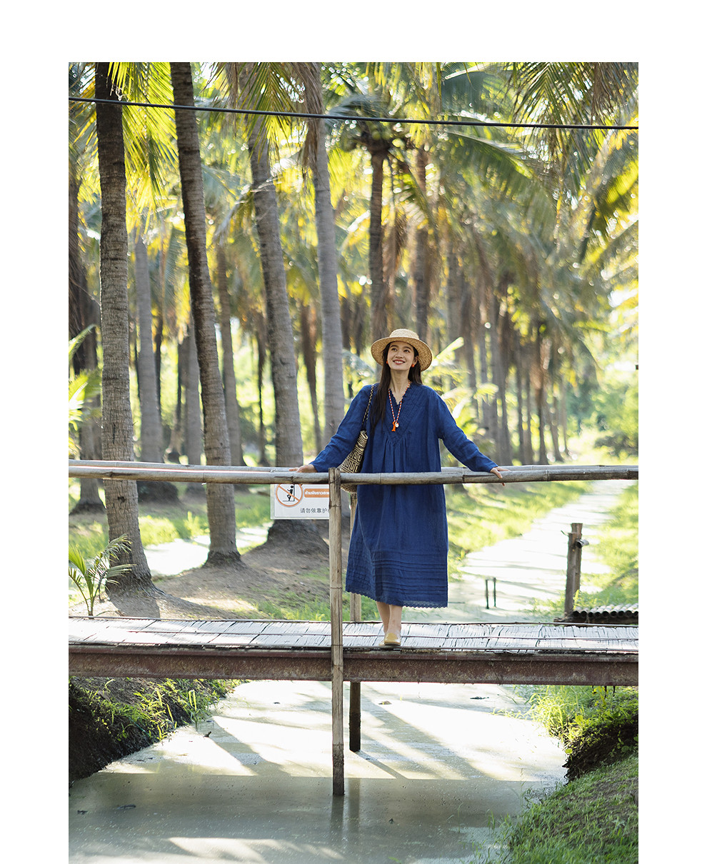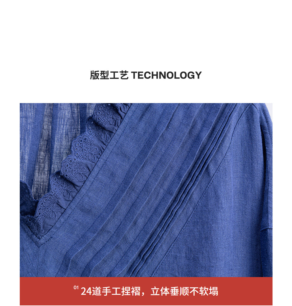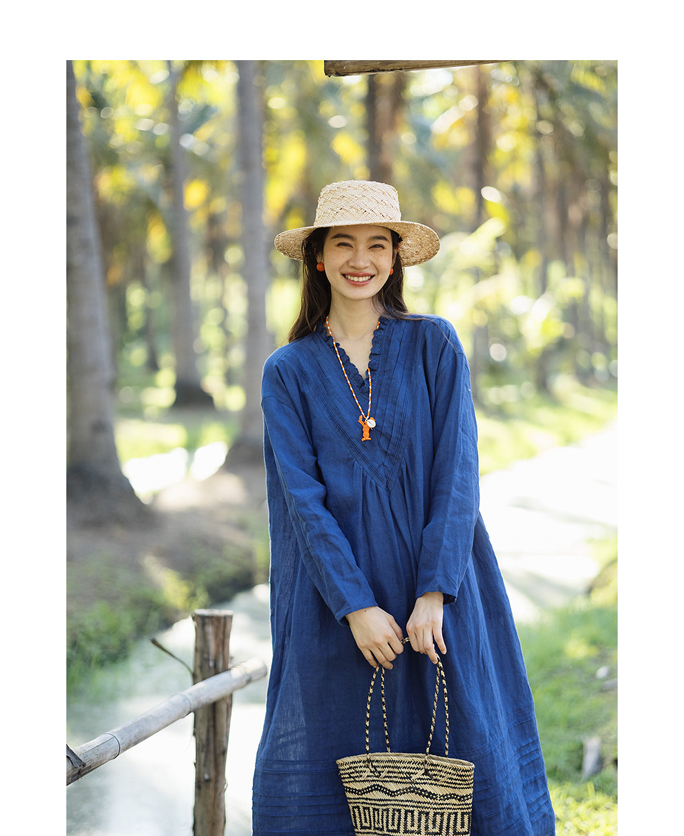 绽放146朵/褶褶裙*亚麻拼接长裙手工捏褶新款长袖木耳边V领连衣裙