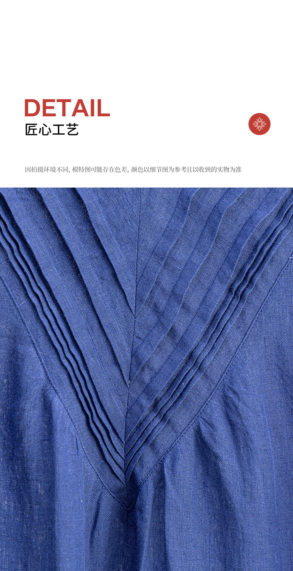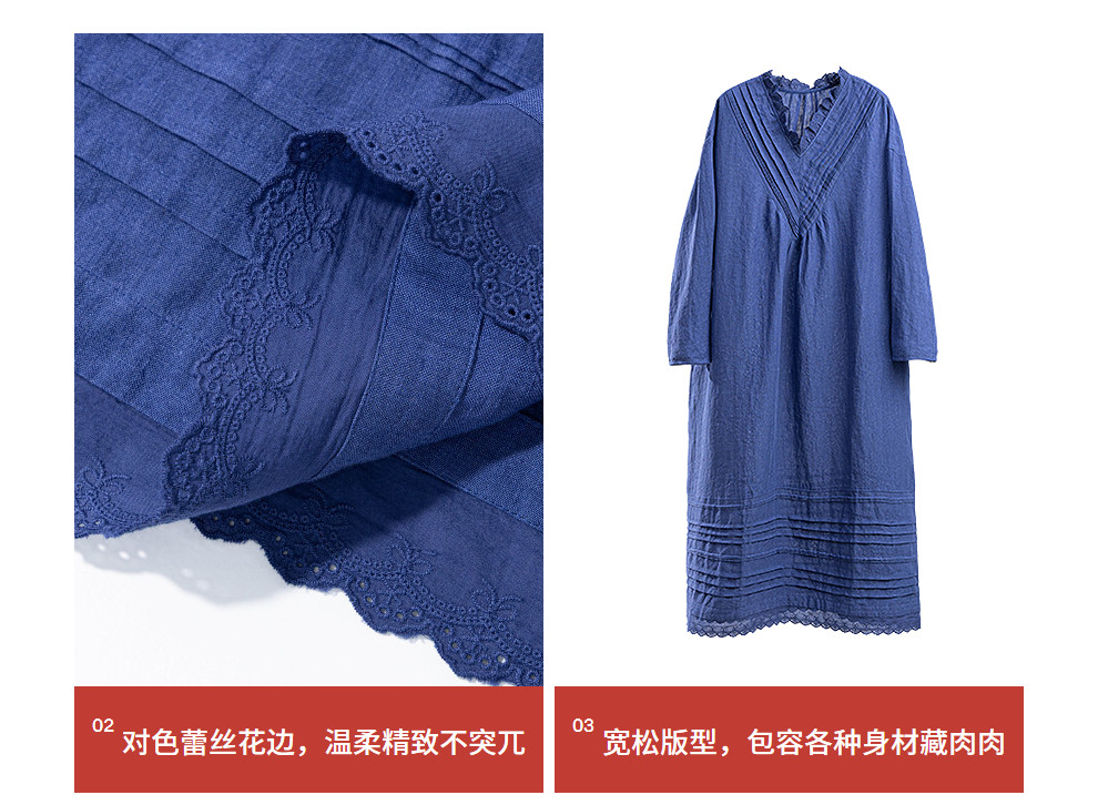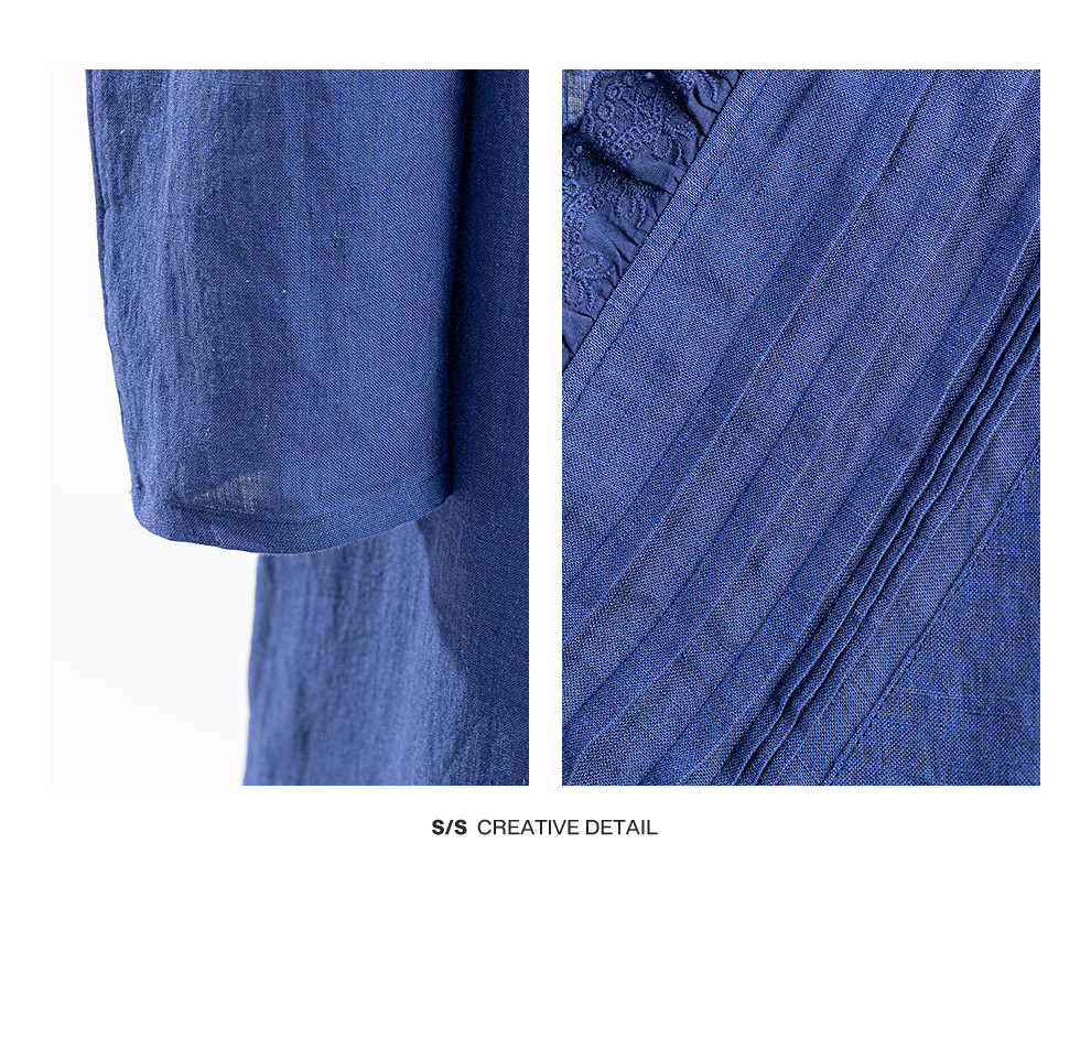 绽放146朵/褶褶裙*亚麻拼接长裙手工捏褶新款长袖木耳边V领连衣裙