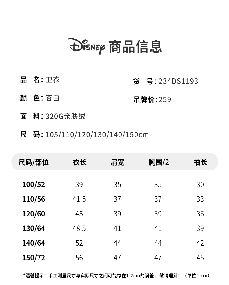 【商场同款】迪士尼秋季女童保暖加绒连帽套头卫衣234DS1193