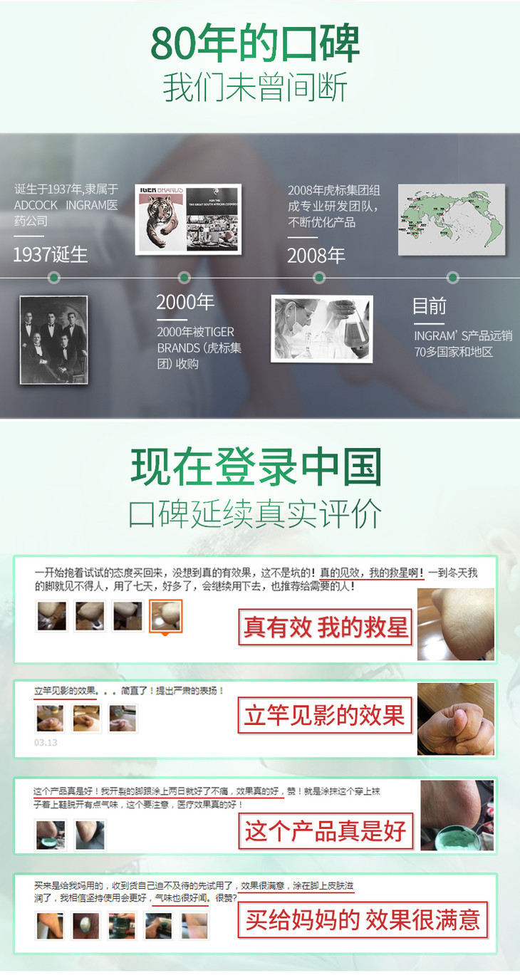 1973年到1974年间,ADCOCK Ingram生产工厂正式成立,Ingram’s camphor cream正式生产销售,1978年生产线上加了草方配制,这个产品现在销售最好,成长最快的产品。从开始到现在,各种推销的途径包括了报纸、电台、杂志、电视等,都是用“the skin Doctor即皮肤医生”这句话作为广告主题。现在每天生产量约17吨,仍供不应求。