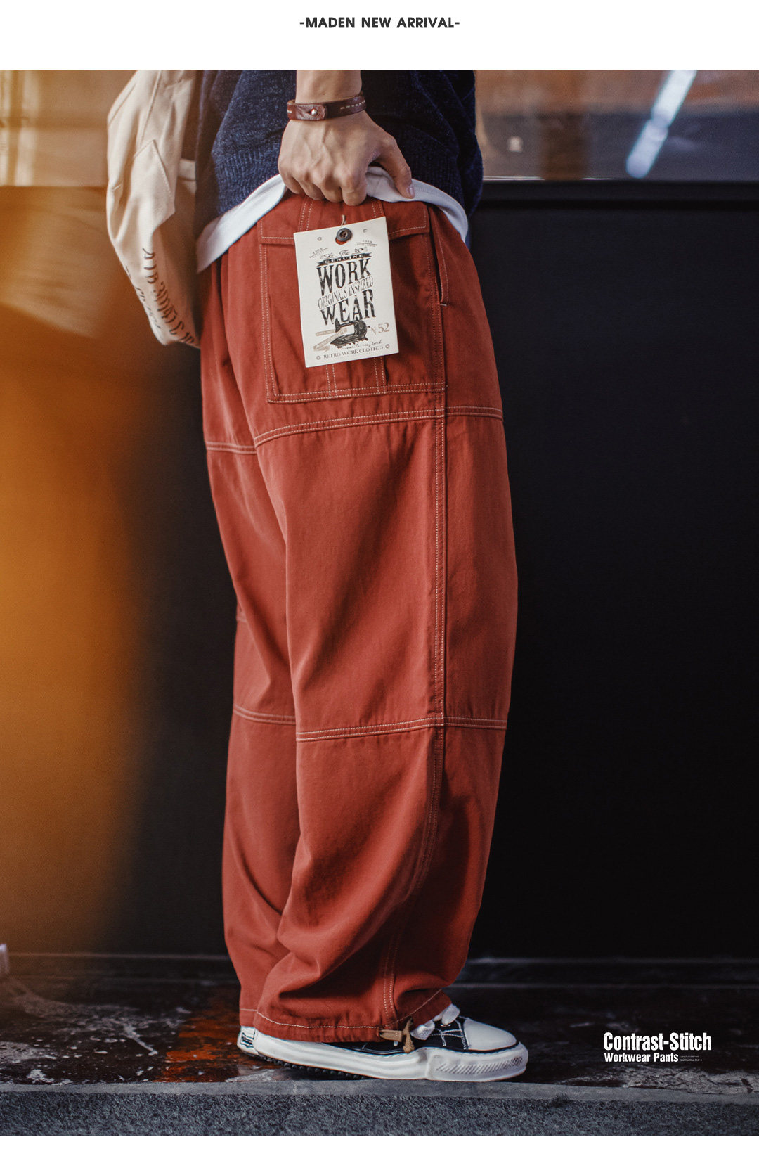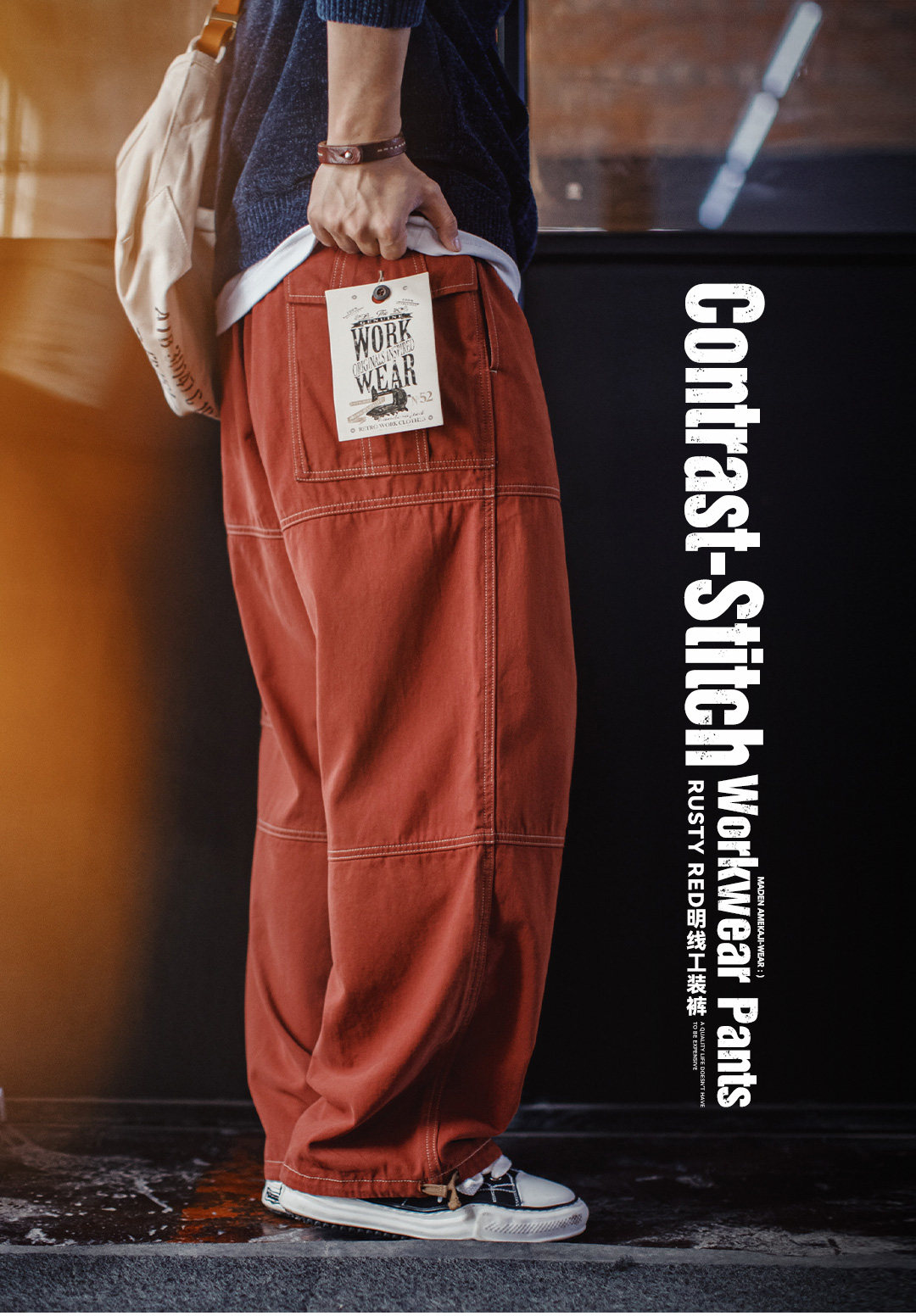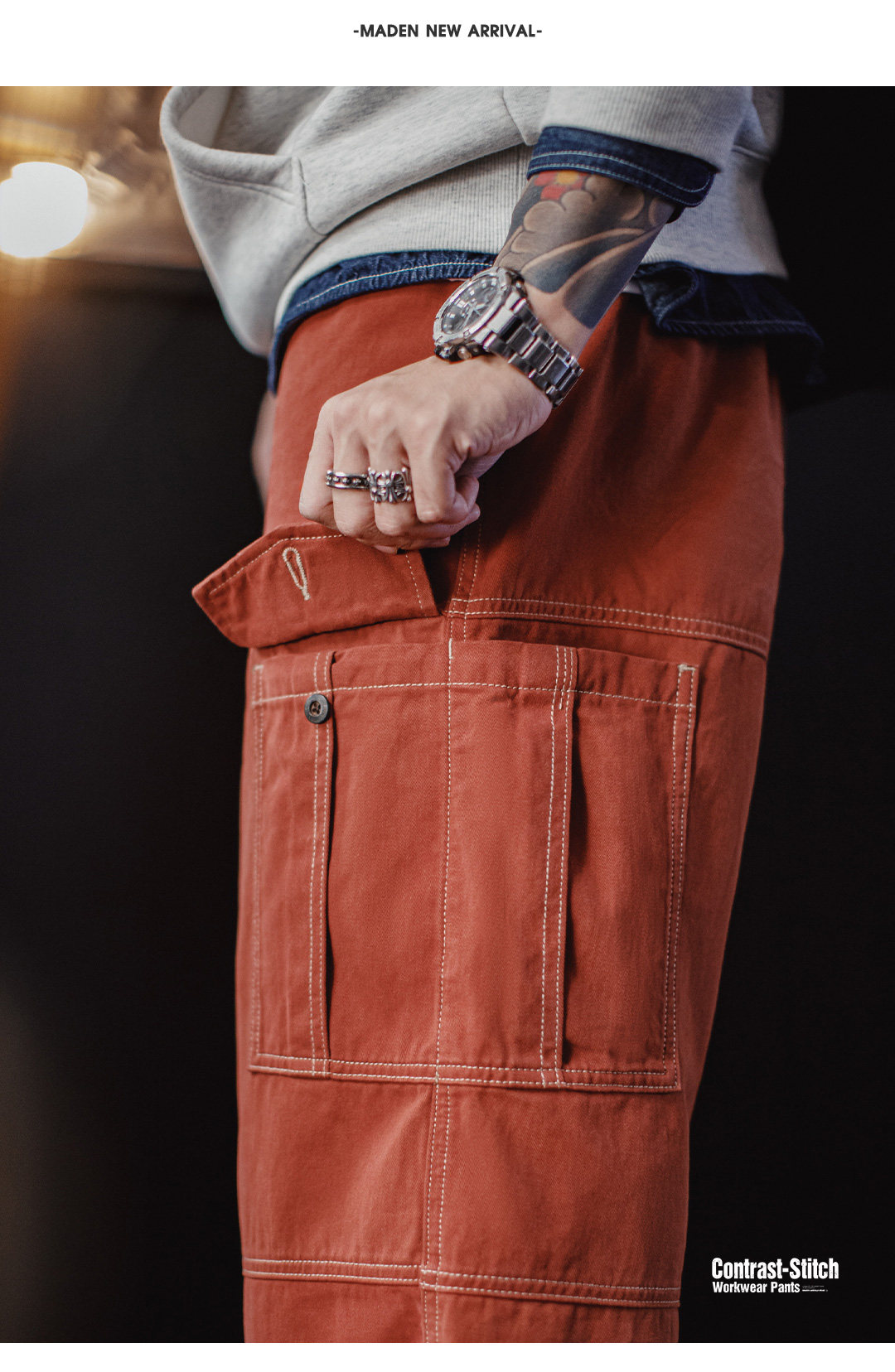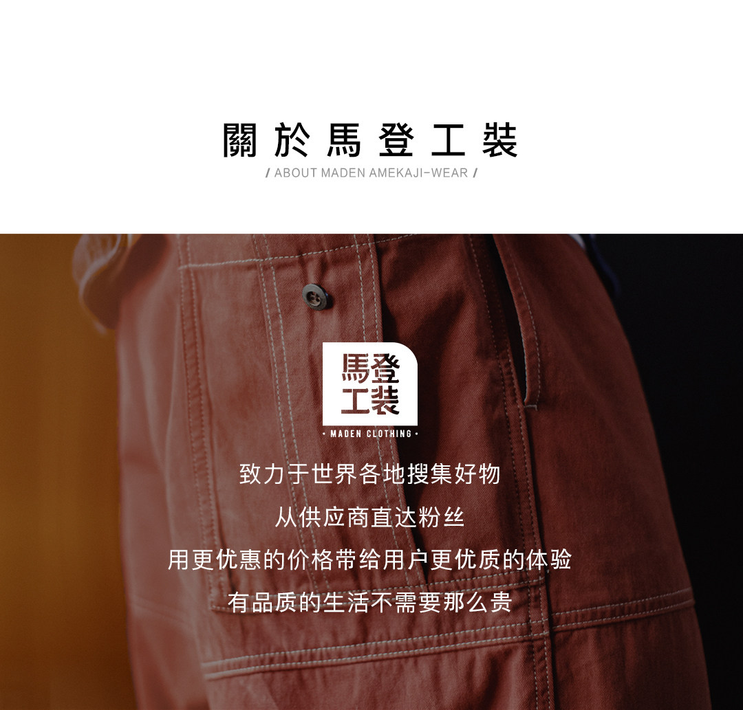 马登工装美式复古多口袋明线工装裤砖红色直筒阔腿束脚休闲裤男春
