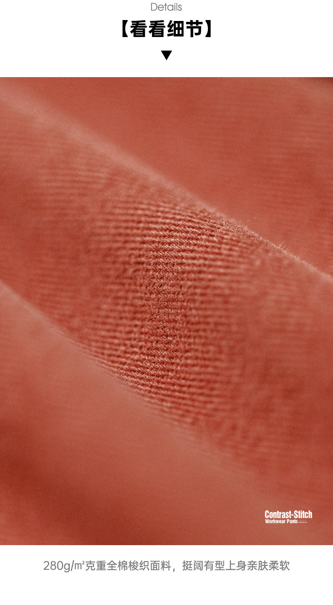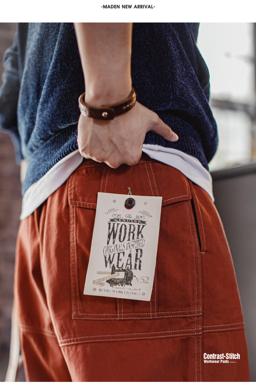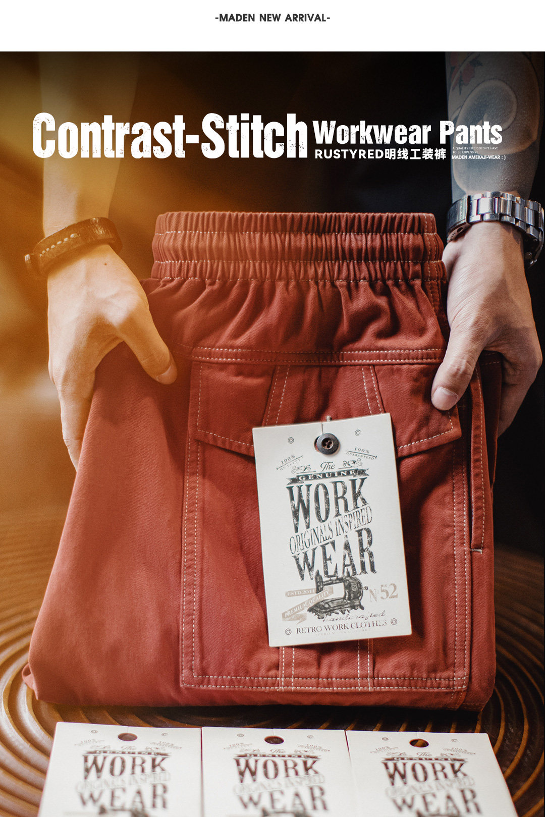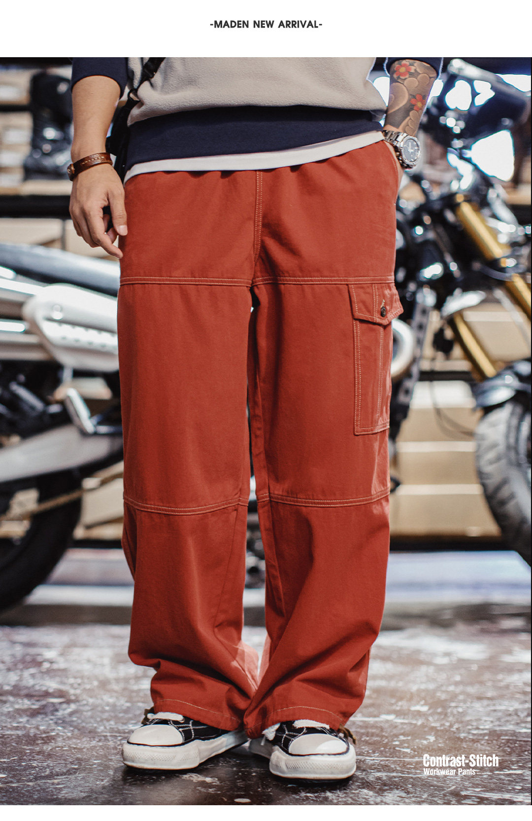 马登工装美式复古多口袋明线工装裤砖红色直筒阔腿束脚休闲裤男春