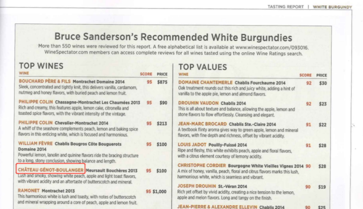《葡萄酒观察家》(Wine Spectator)于 2016 年发布了超过 550 款葡萄酒的品鉴报告。其中,2013 年宝朗格酒庄默尔索布奇一级园干白(Boucheres 1er Cru)斩获 95 分,与蒙哈榭大名庄拉梦内酒庄(Domaine Ramonet)、勃艮第百年名庄宝尚父子酒庄(Domaine Bouchard Pere & Fils)并列榜首。