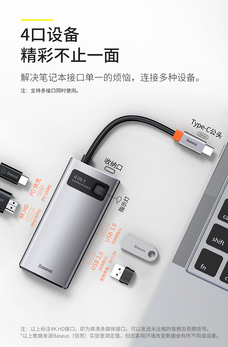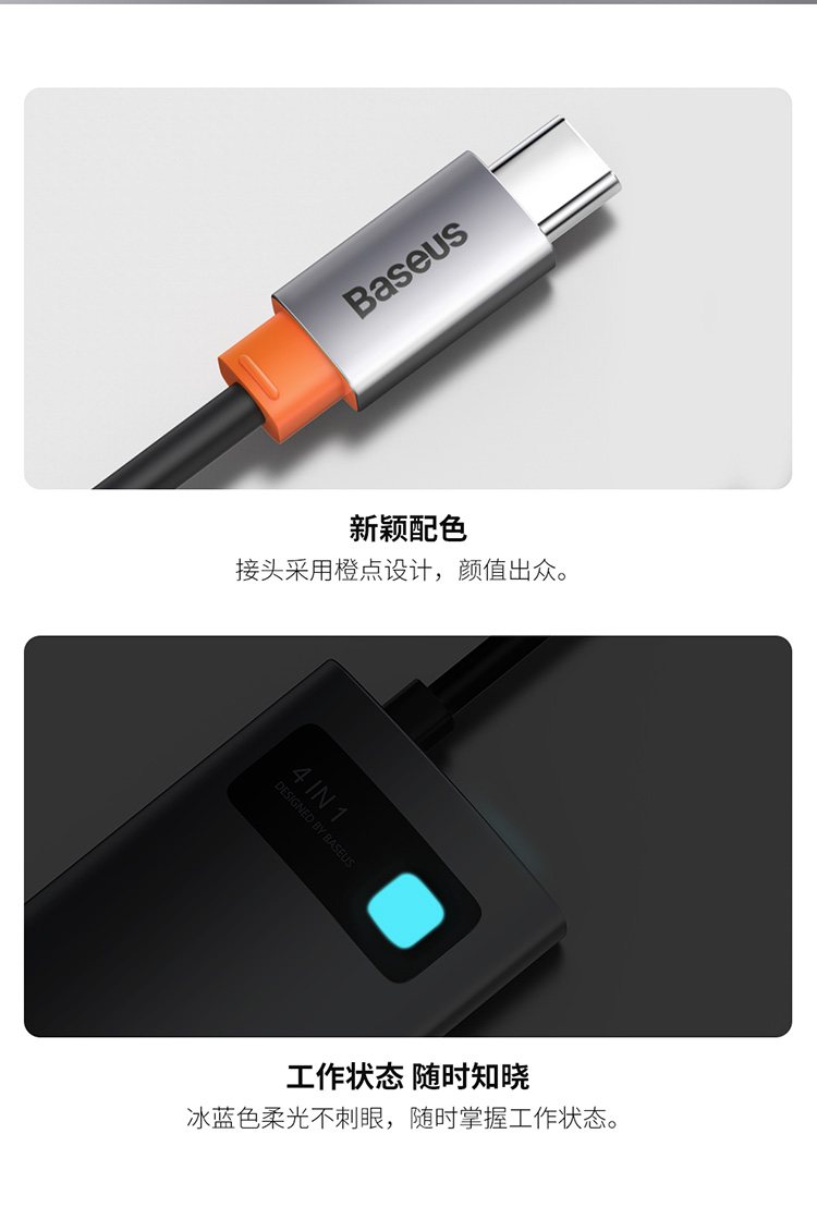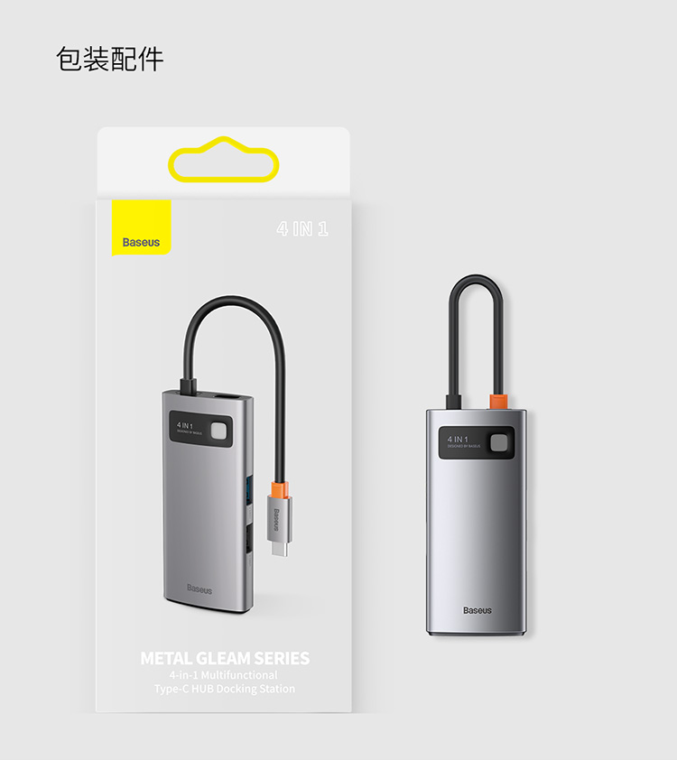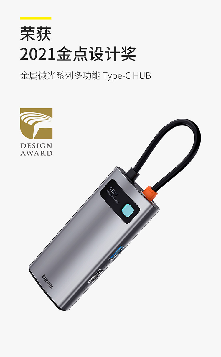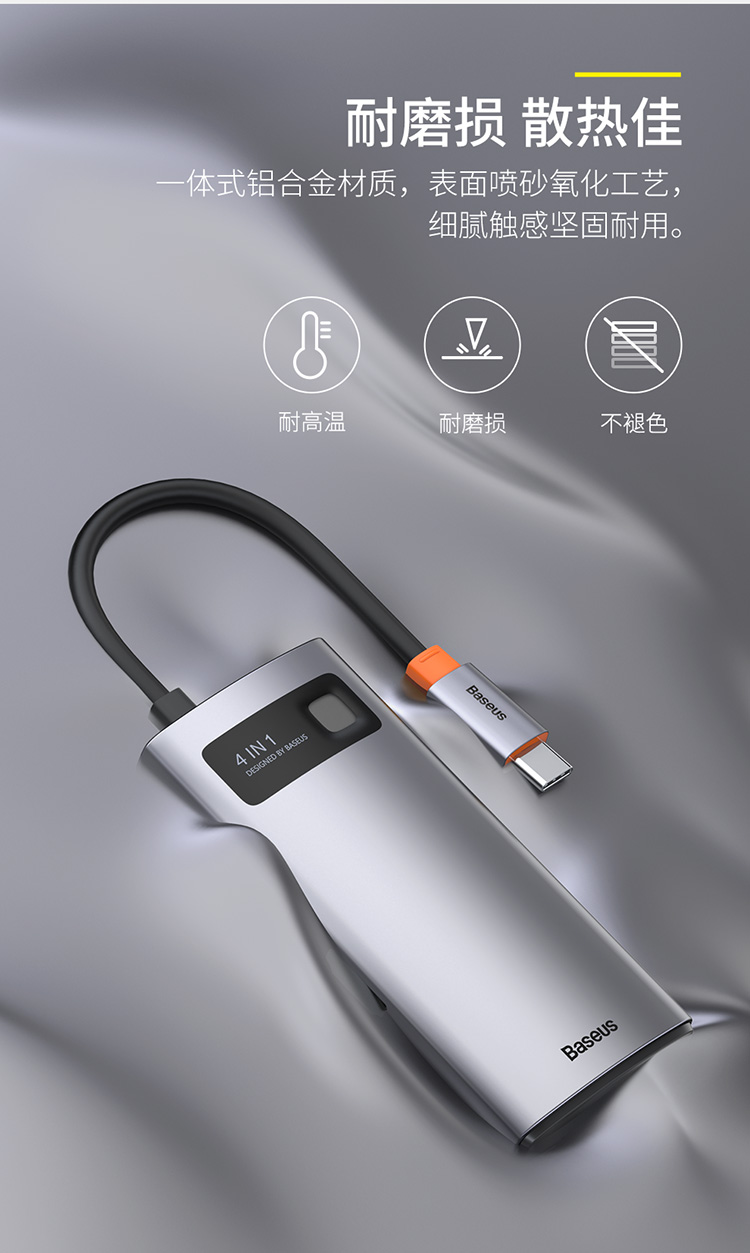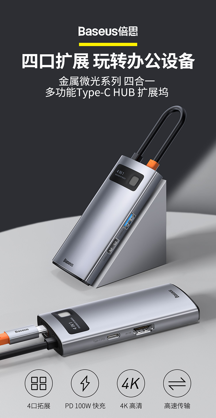 倍思 金属微光系列 四合一多功能Type-C HUB 扩展坞 (Type-C to HDMI*1+USB3.0*1+USB2.0*1+PD*1)