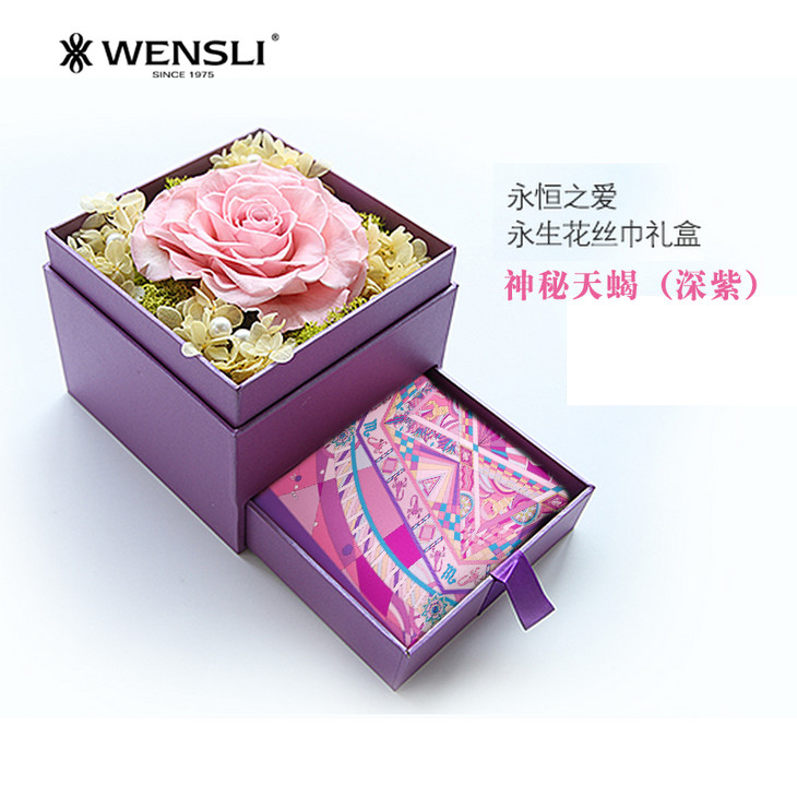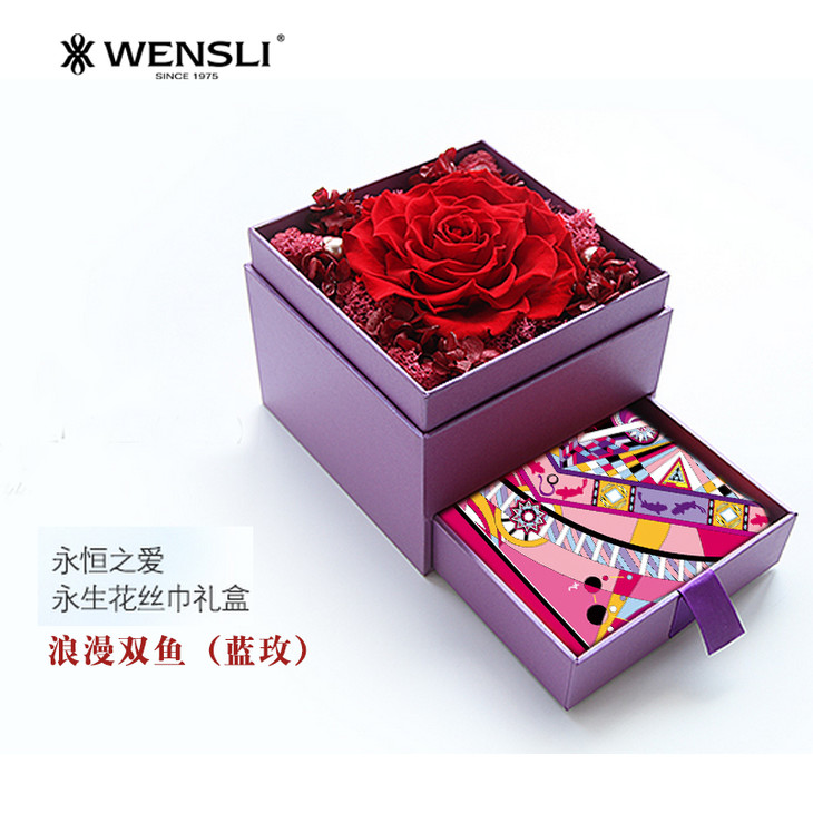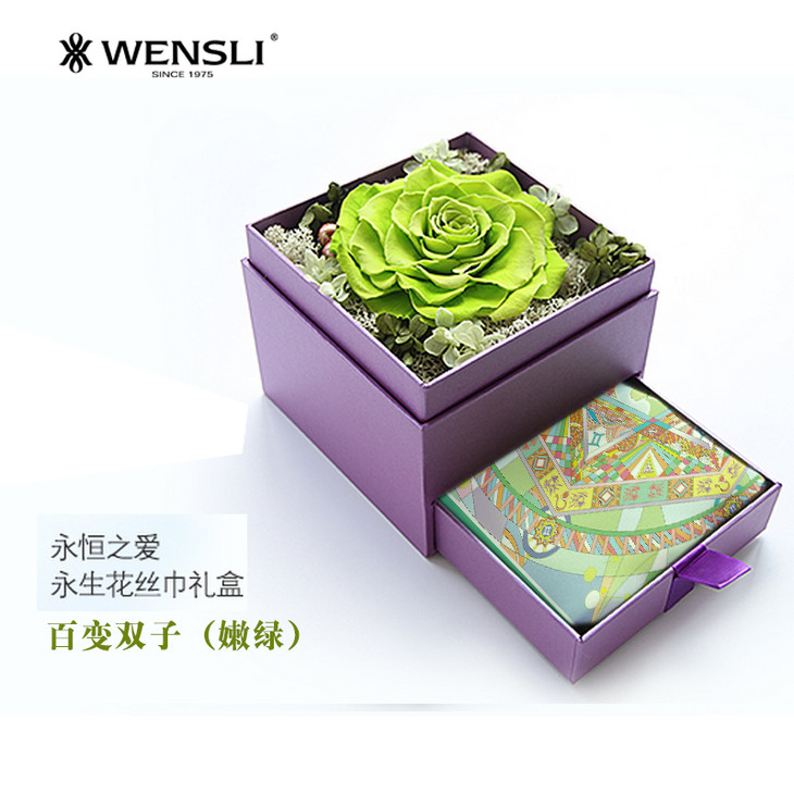 永生花有四个颜色:红色、绿色、粉色、蓝色,可以搭配不同星座的丝巾,购买时请备注星座。
