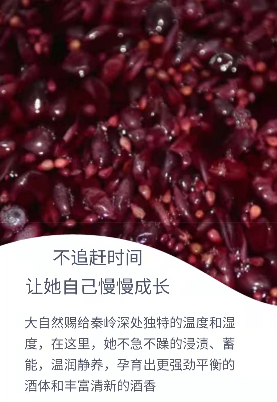 大自然赐予秦岭深处适宜的温度和湿度,葡萄在秦岭山水间安静的发酵、浸渍、蓄能、温润静养,使酒体和酒香更加丰盈而集中。
