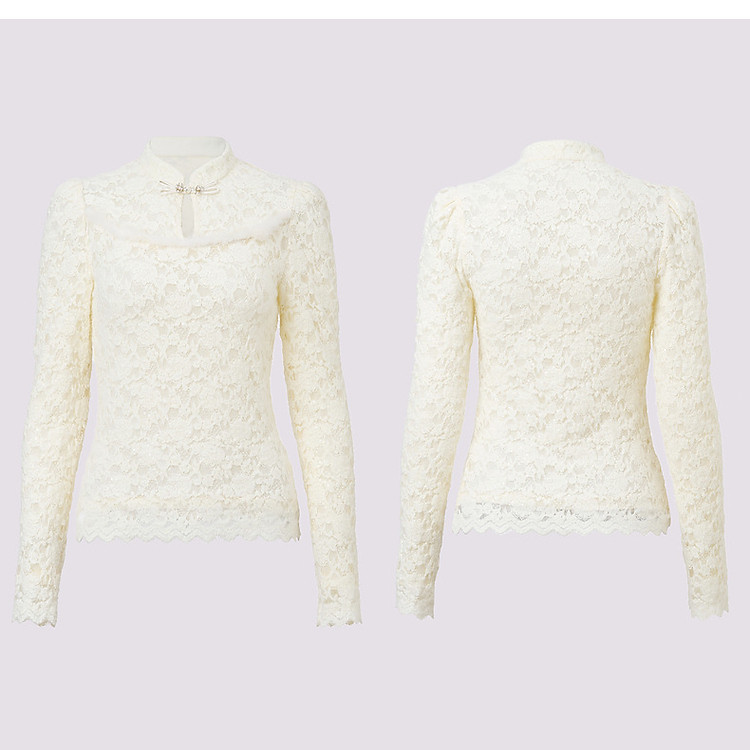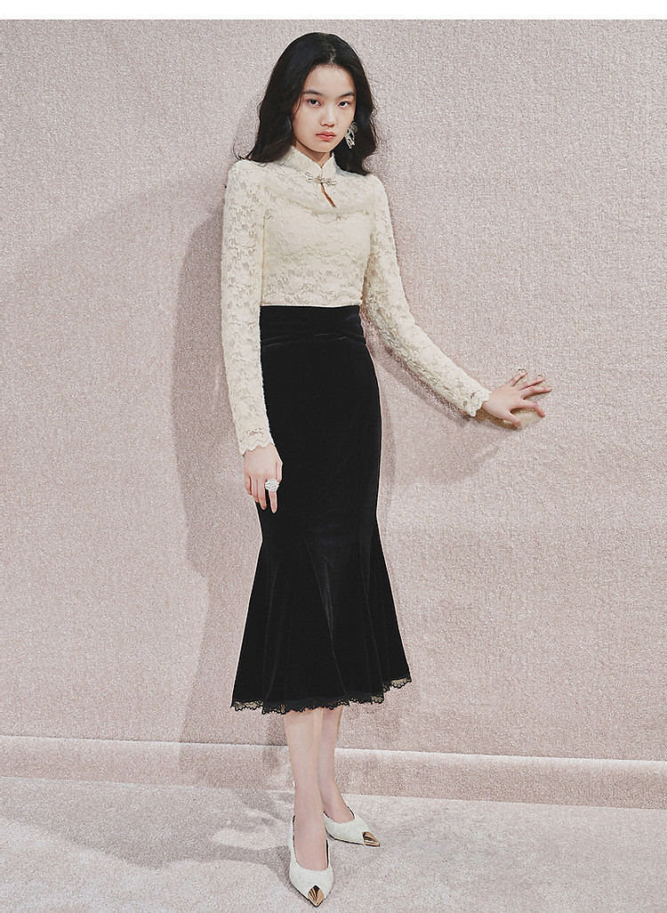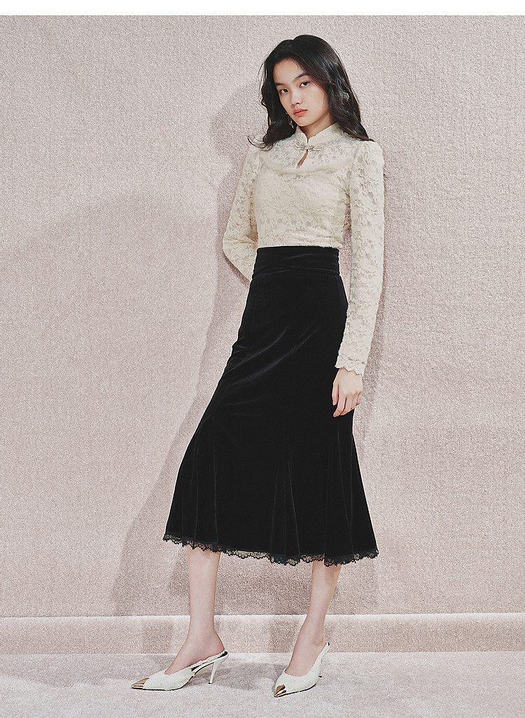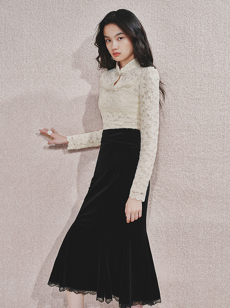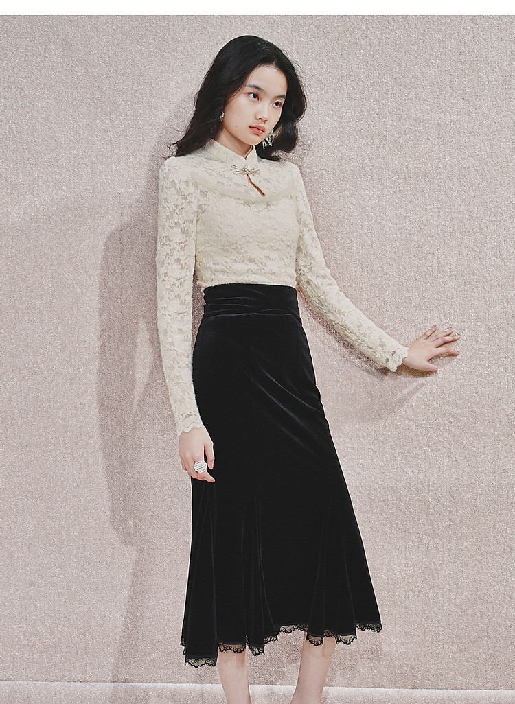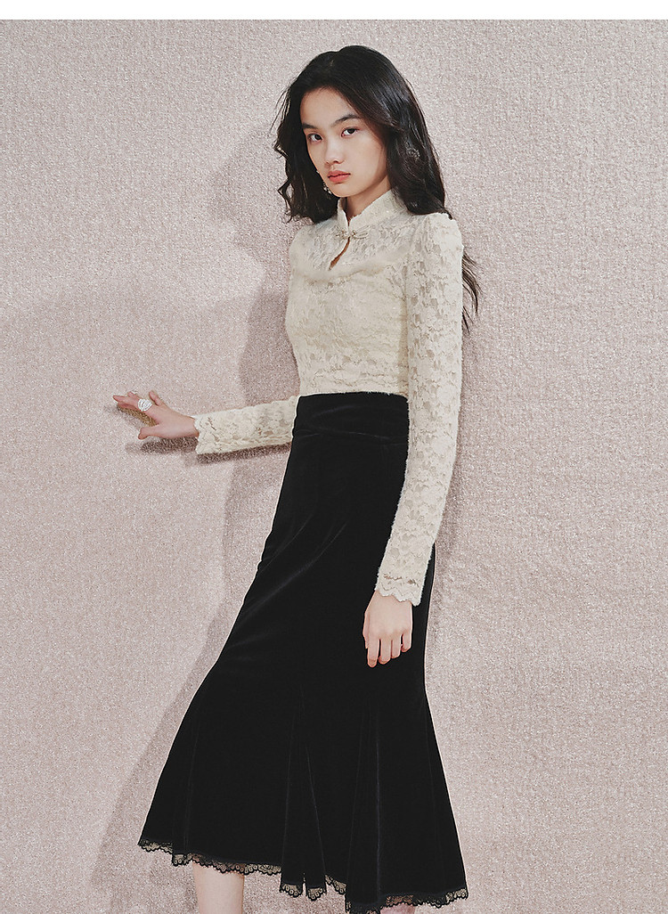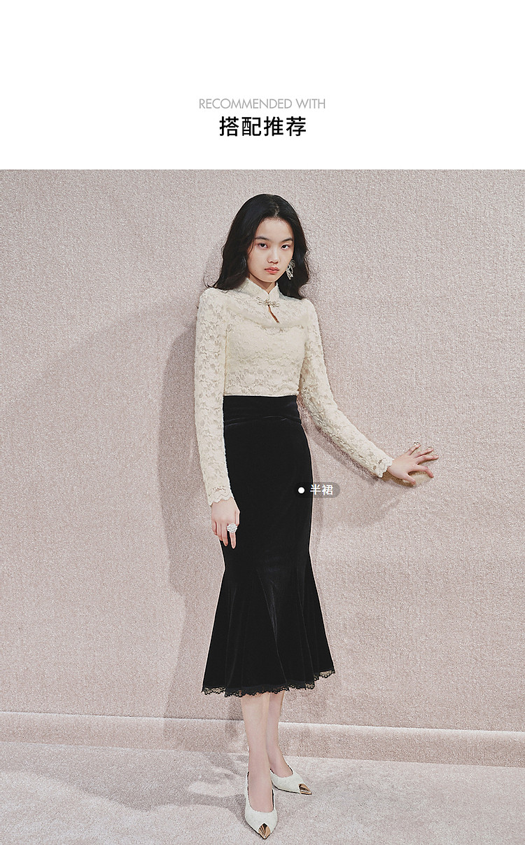 MAXRIENY贵雅新中式蕾丝雪纺衫24秋修身显瘦盘扣复古气质长袖