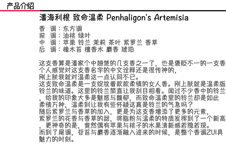 潘海利根 致命温柔香水 Penhaligon's ARTEMISIA 小样/正装