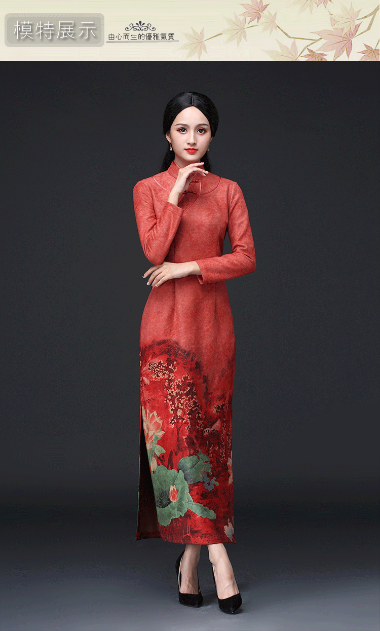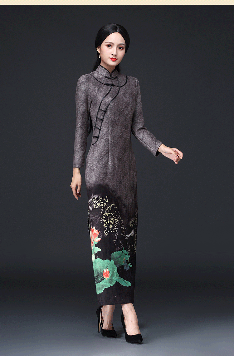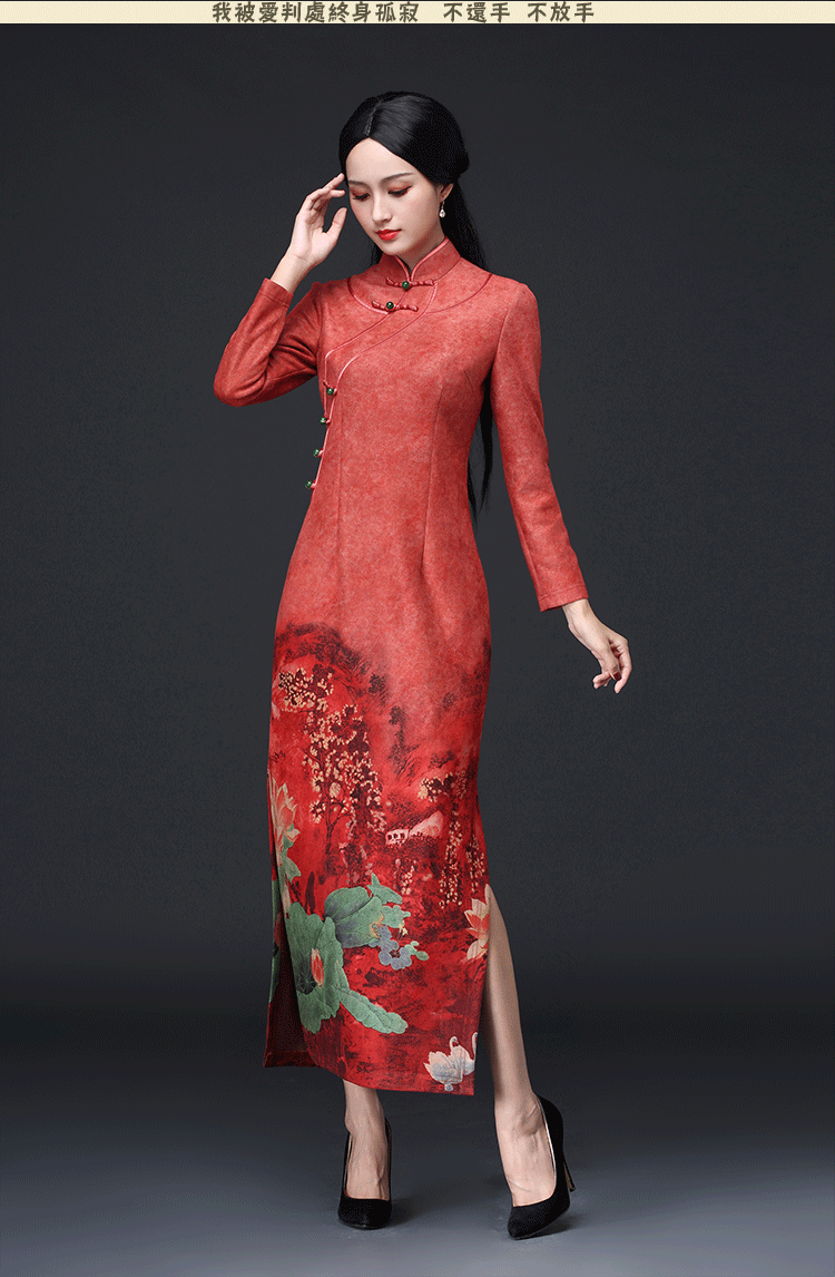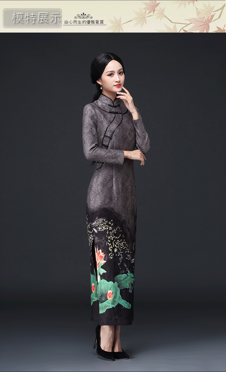 新款鹿皮绒修身复古中袖长款旗袍KLS-A1950