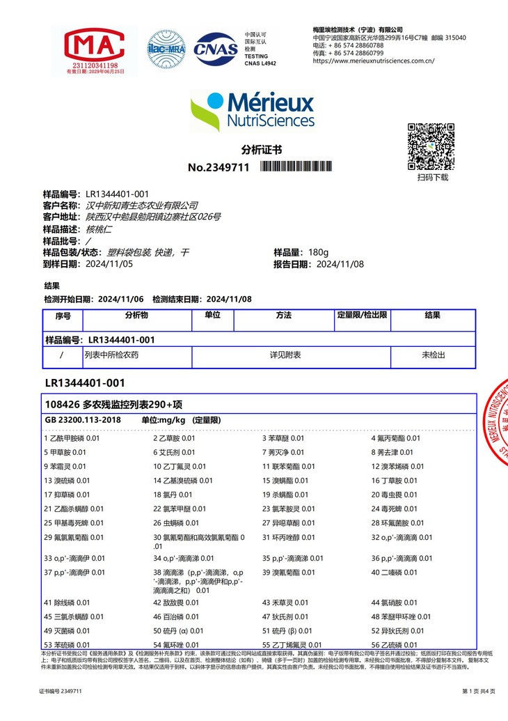 核桃是在野外野生采集的,都是几十年前种下去,没人管理的,为了很好的了解产品特性,在正式上架之前,我们也做了农残检测,无检出。蜂蜜是店里在售的秦岭野生蜂蜜,这次也补充做了检测。