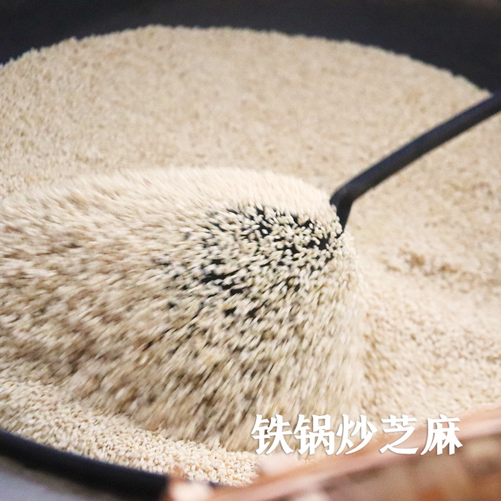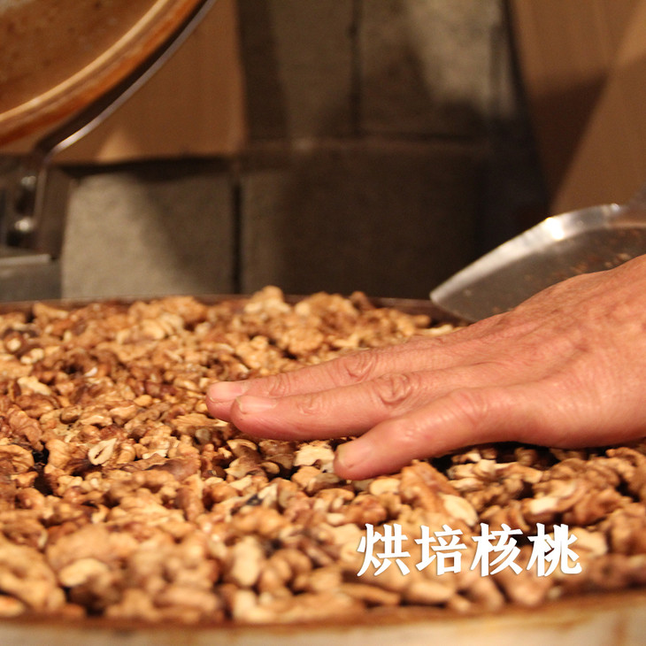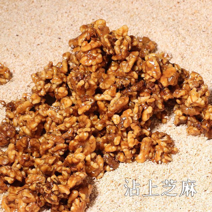 核桃柴火加热,在铁锅里裹蜂蜜,沾芝麻,不使用防腐剂。