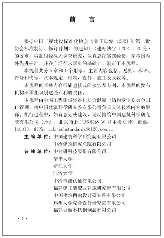 根据中国工程建设标准化协会《关于印发<2021年第二批协会标准制订、修订计划>的通知》(建标协字[2021]20号)的要求,编制组经深入调查研究,认真总结实践经验,参考国内外先进标准,并在广泛征求意见的基础上,制定本规程。 本规程共分6章和1个附录,主要内容包括:总则,术语、符号和代号,基本规定,材料,设计,施工及验收等。 本规程的某些内容可能直接或间接涉及专利,本规程的发布机构不承担识别这些专利的责任。 为了提高混凝土结构的可靠性,规范耐腐蚀性钢筋在混凝土结构中的应用,做到安全、适用、经济,保证质量,制定本规程。 本规程适用于耐腐蚀性钢筋在混凝土结构应用中的设计、施工及验收。 耐腐蚀性钢筋在混凝土结构中的应用除应符合本规程规定外,尚应符合国家现行有关标准和现行中国工程建设标准化协会有关标准的规定。