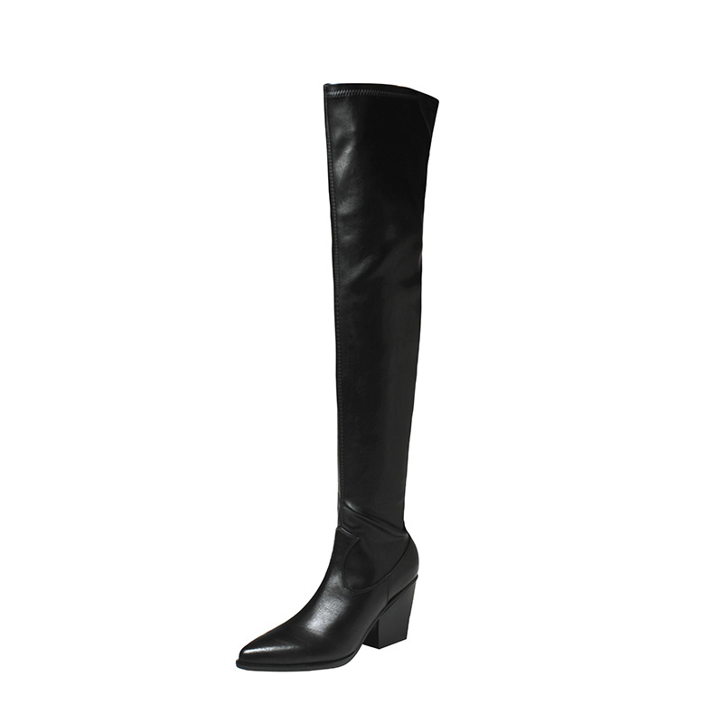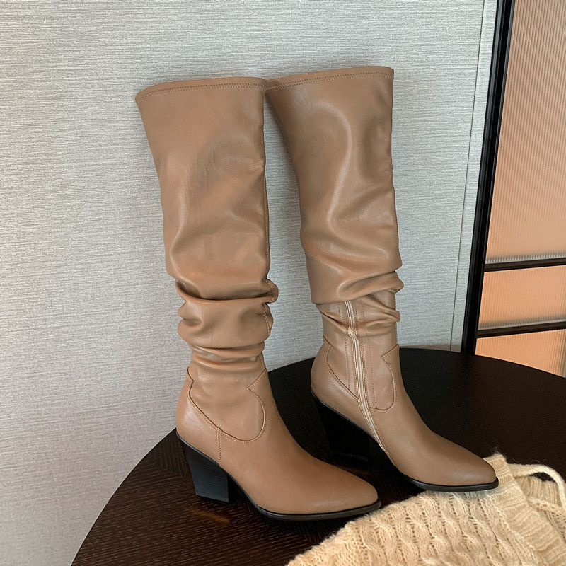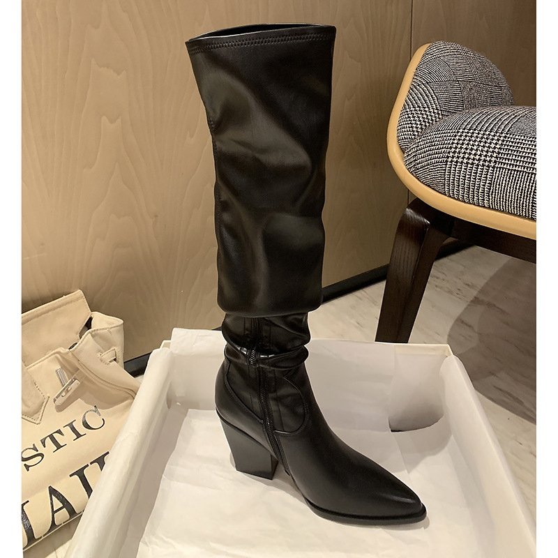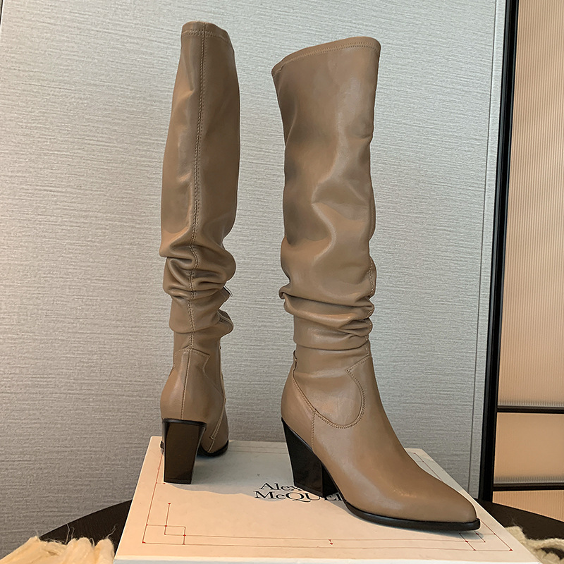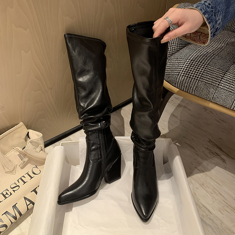 HYY3880欧美风新款牛皮褶皱过膝长筒靴~尖头侧拉链粗高跟瘦瘦靴大码靴40