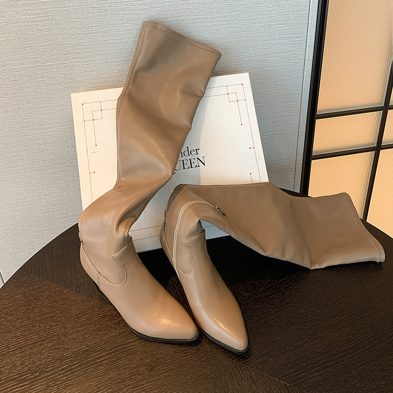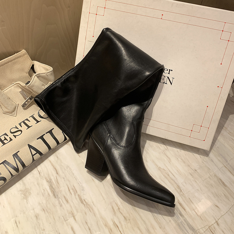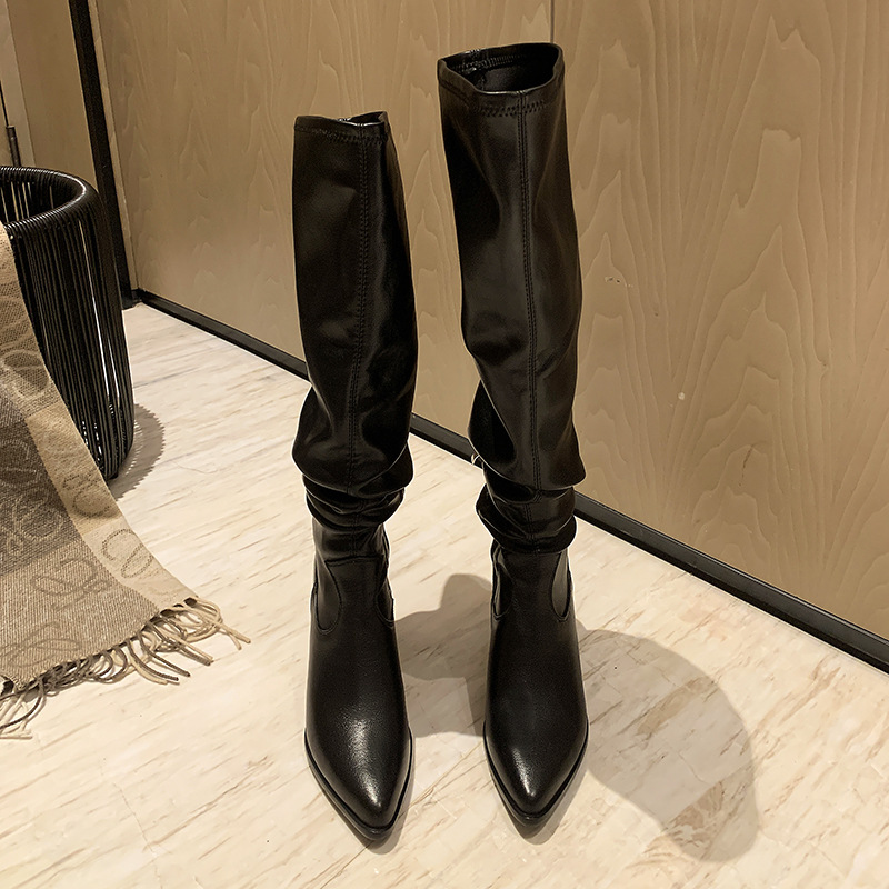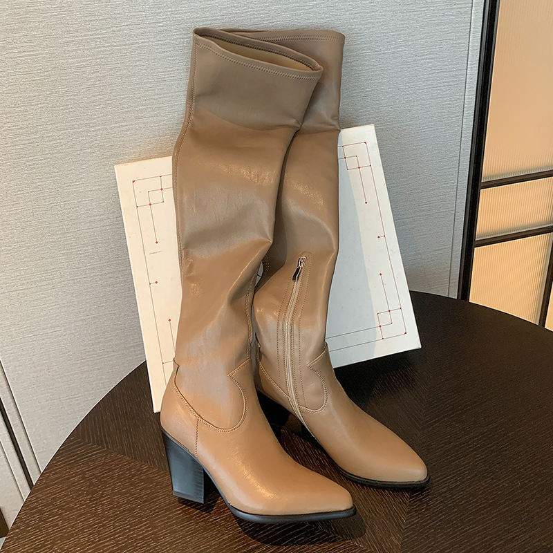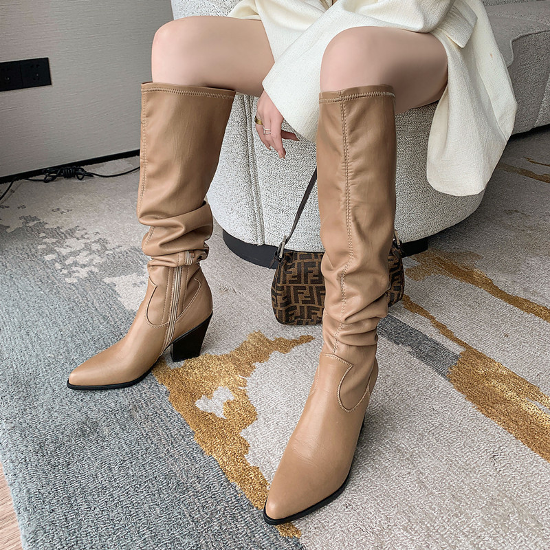 HYY3880欧美风新款牛皮褶皱过膝长筒靴~尖头侧拉链粗高跟瘦瘦靴大码靴40