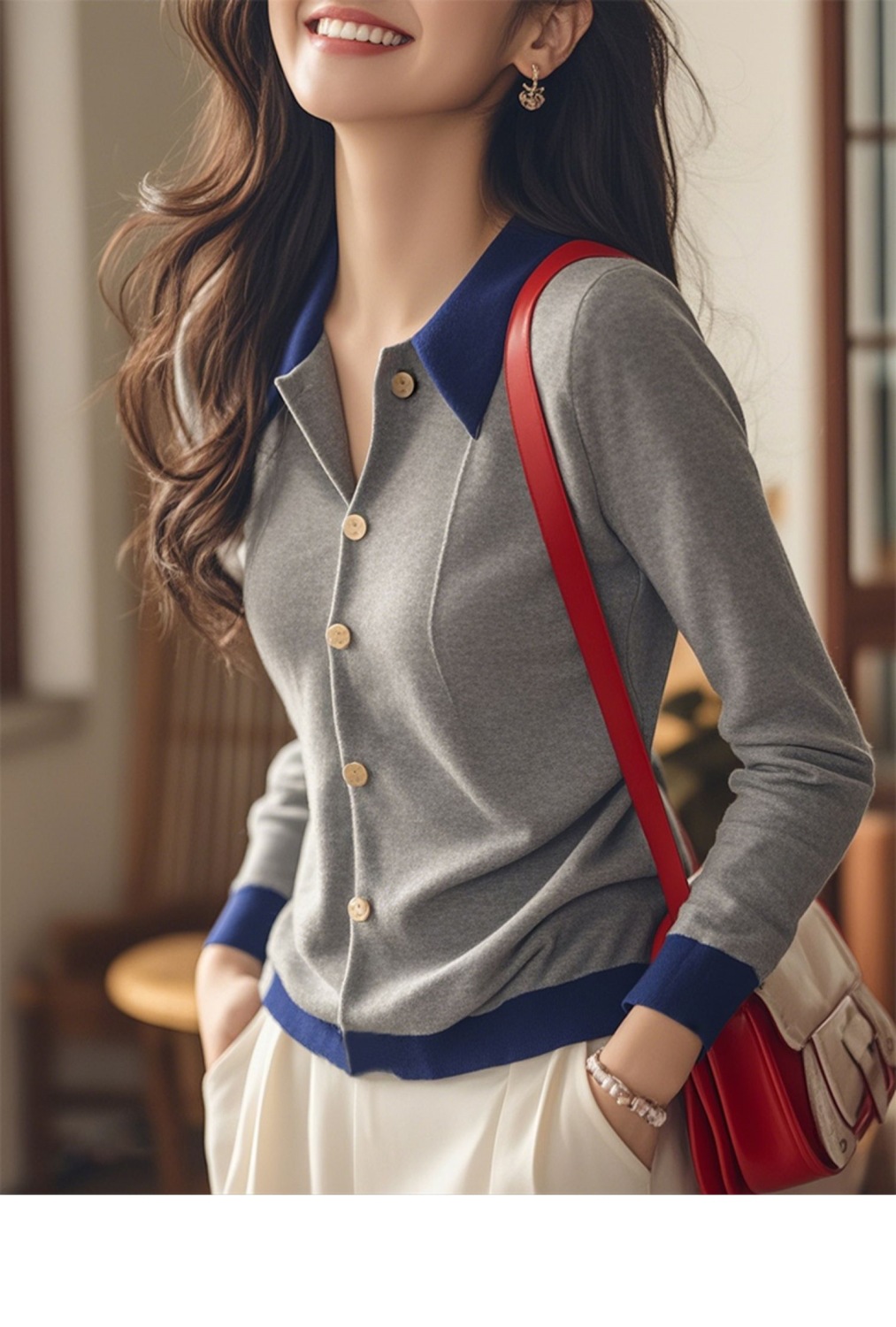 XMZ1049灰色拼接polo领针织衫女士秋冬季高级洋气打底开衫显瘦设计感上衣