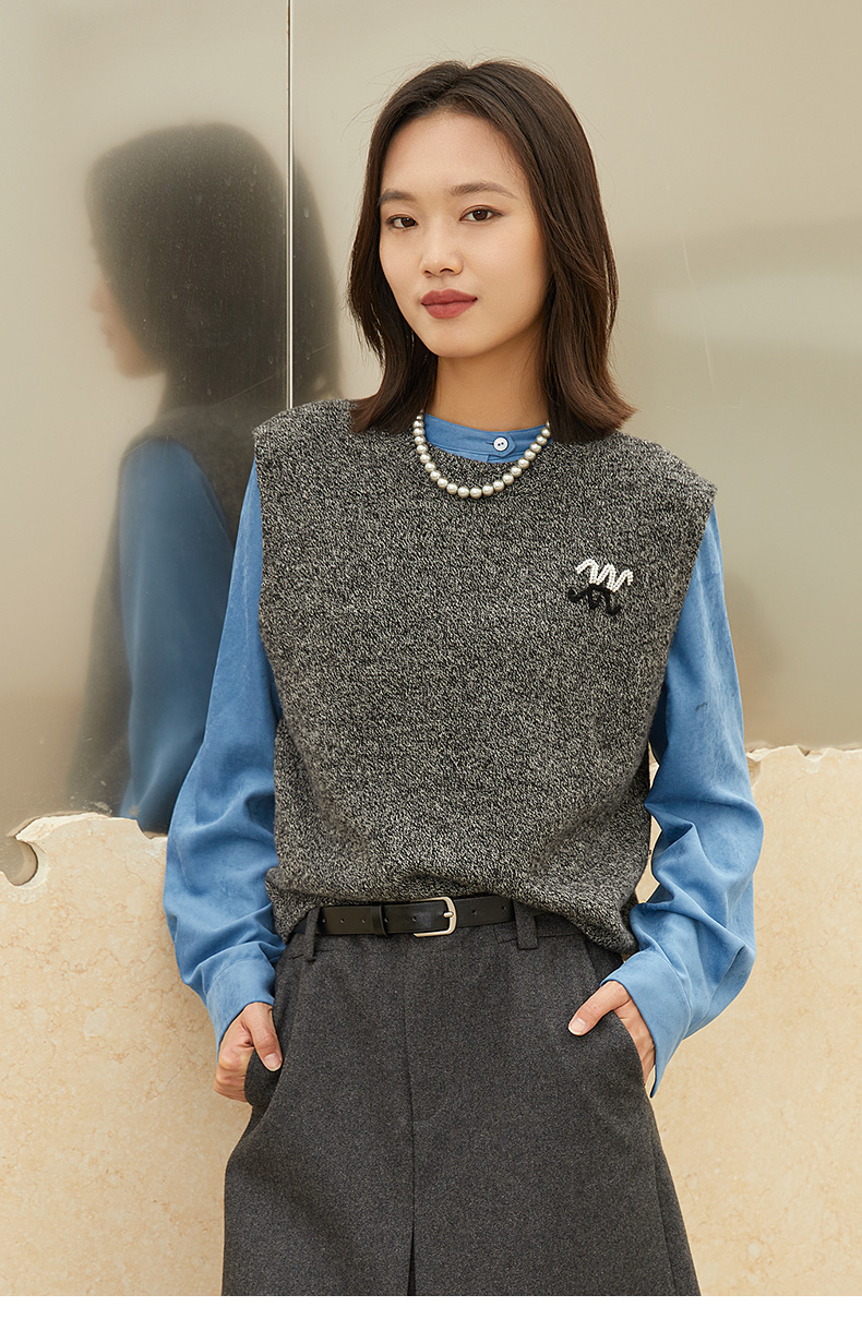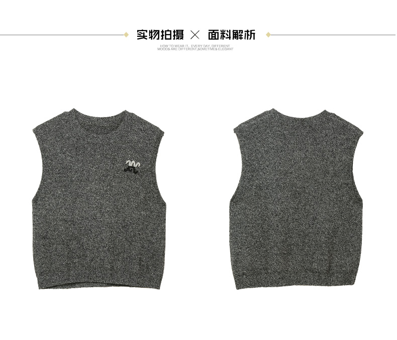灰色圆领针织马甲女秋季新款复古风趣味刺绣无袖毛衣背心外搭上衣