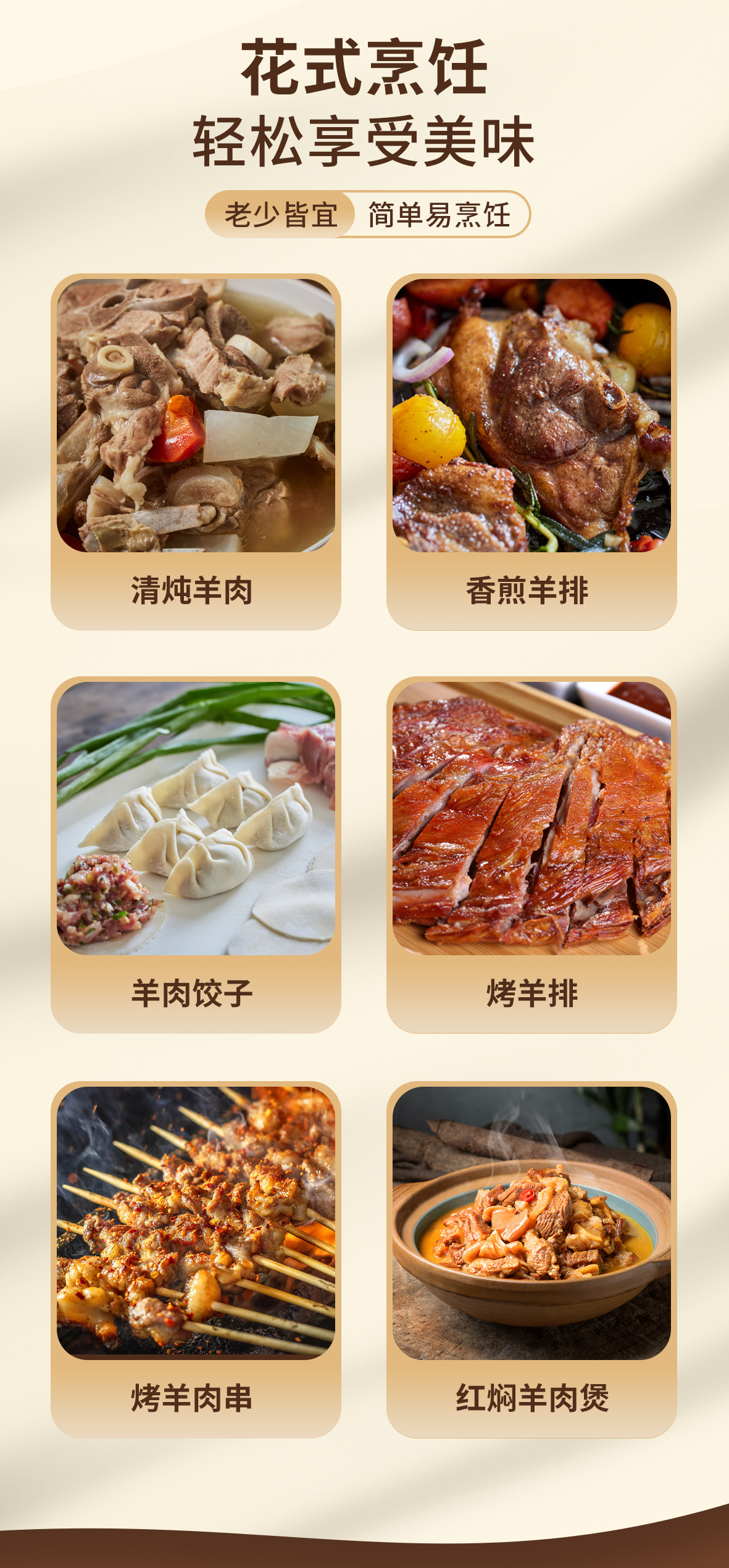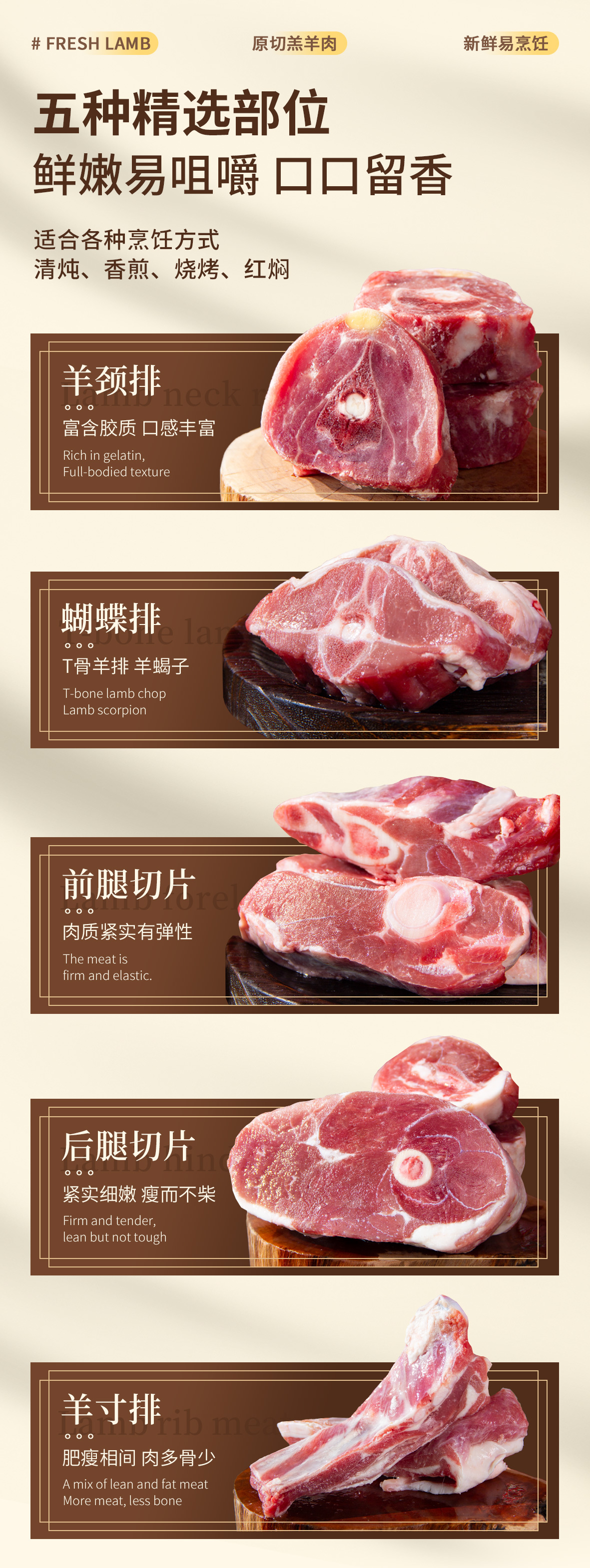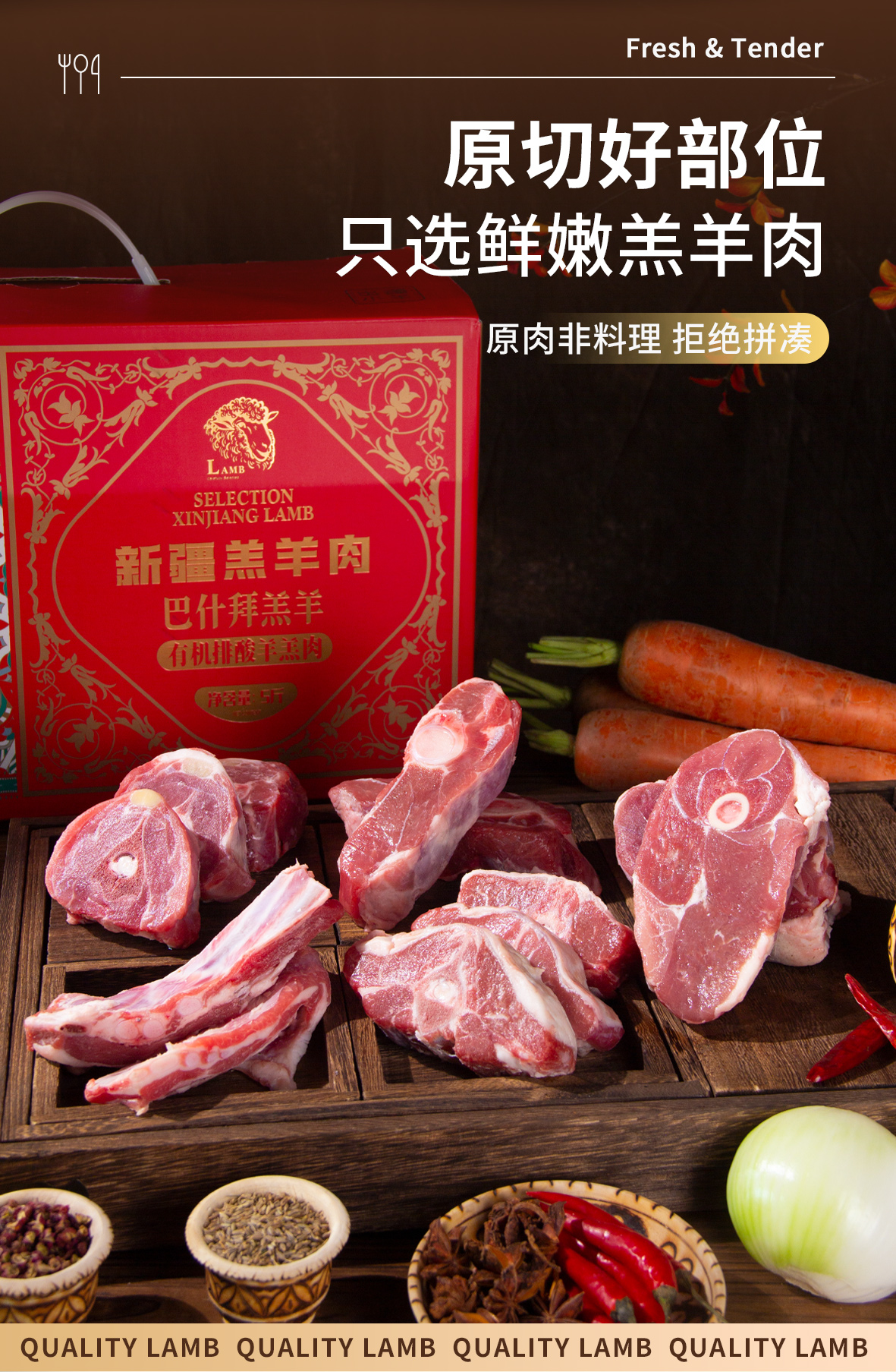 ①5斤礼盒装:羔羊前腿片500克、羔羊后腿片500克、羔羊寸排500克、羔羊蝴蝶排500克、羔羊颈排500克