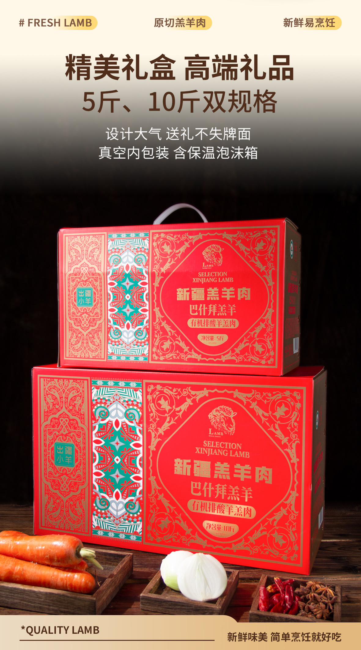 ②10斤礼盒装:羔羊前腿片500克*2份、羔羊后腿片500克*2份、羔羊寸排500克*2份、羔羊蝴蝶排500克*2份、羔羊颈排500克*2份