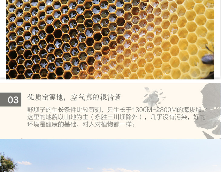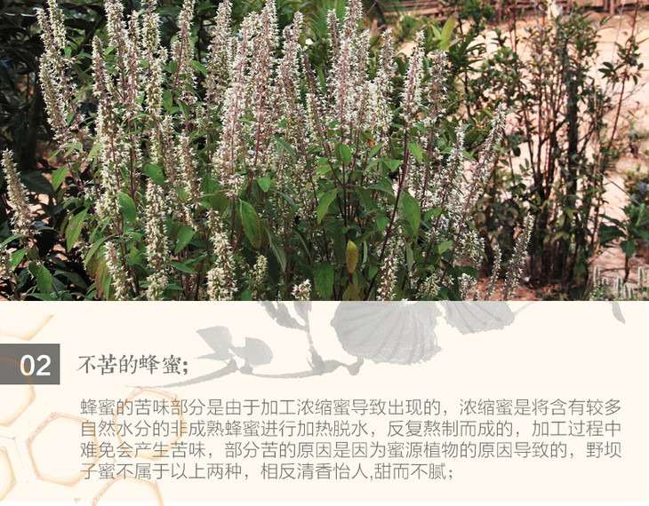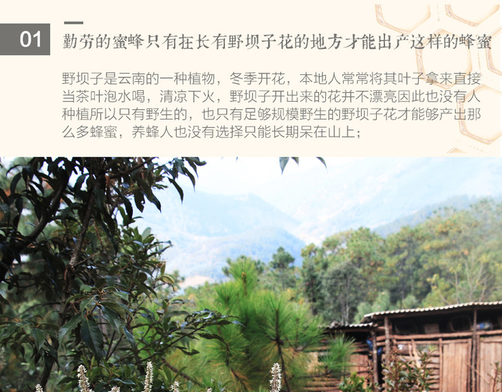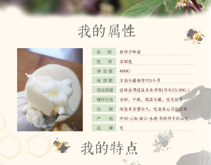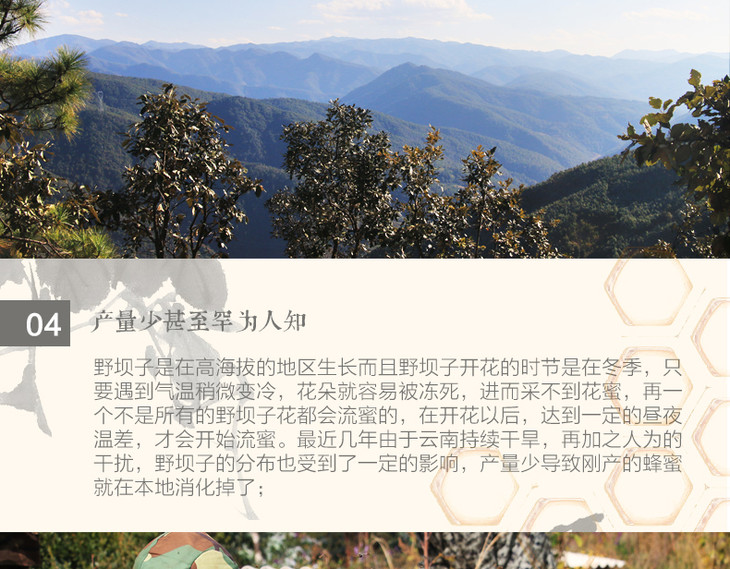 【产品亮点】色、香、味、营养绝佳,产量稀少的顶级蜂蜜,野坝子蜂蜜新鲜时呈浅绿色(琥珀色),结晶后呈乳白色,颗粒细腻,质地硬而不坚,蜜质甜而不腻,气味芬芳,具有野坝子花独特的香味,有“云南硬蜜”的美称,为蜜中上品中的极品,从古至今都是皇家御用贡蜜,400多年前,民间就开始向明清两朝的皇帝进贡硬蜜