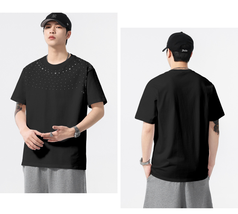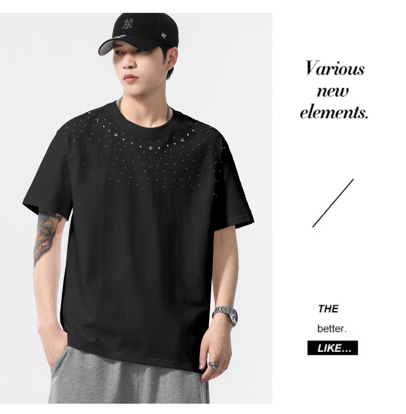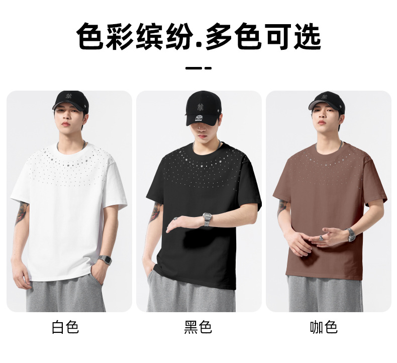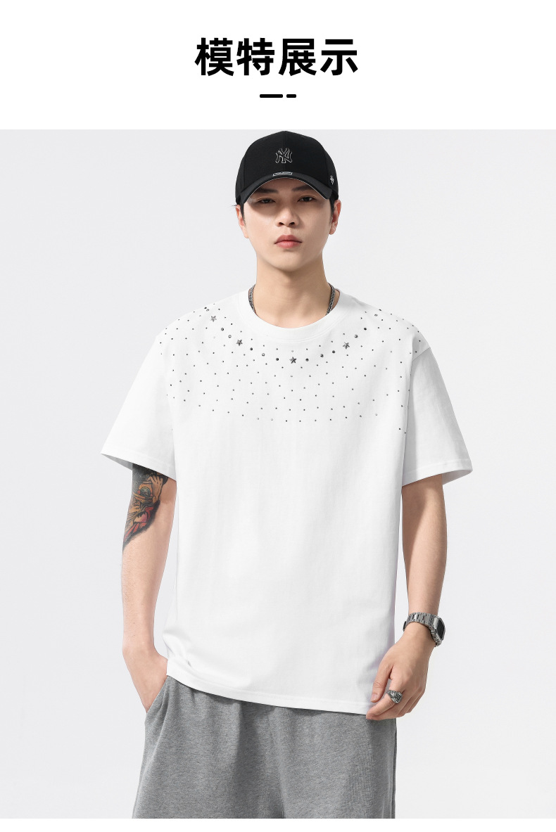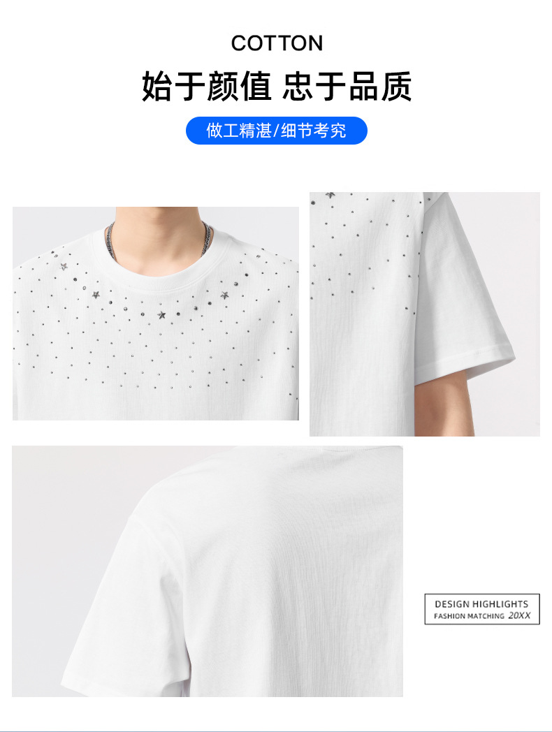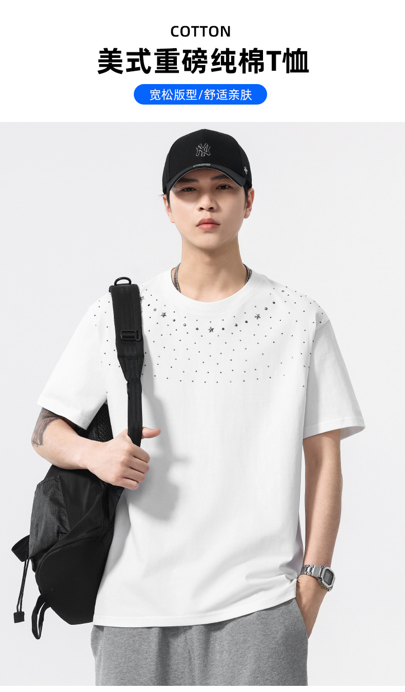 【100%棉】【DQ】大依优型大码男装240g重磅短袖T恤圆领宽松潮牌个性烫钻半袖上衣男士夏季新品
