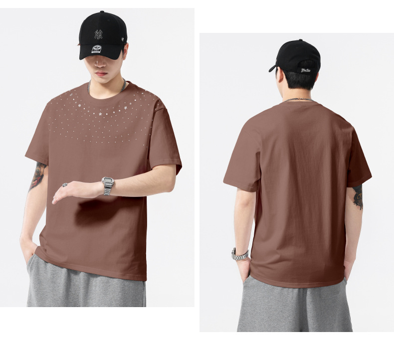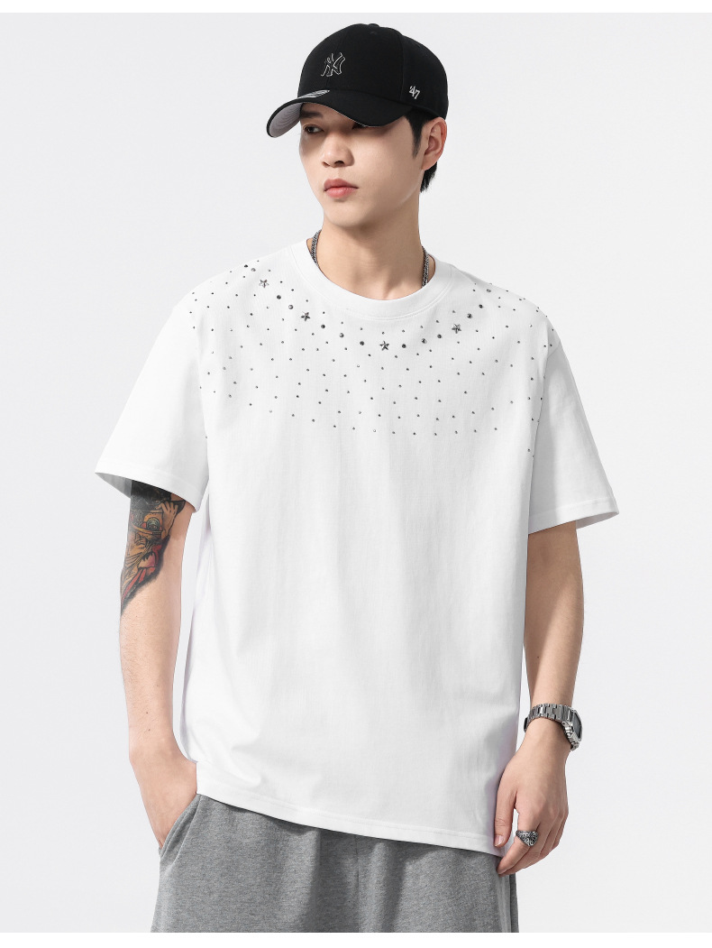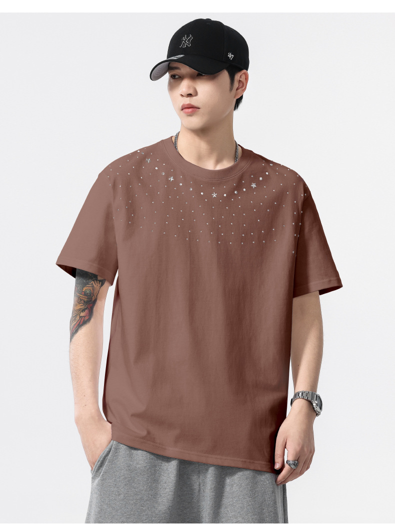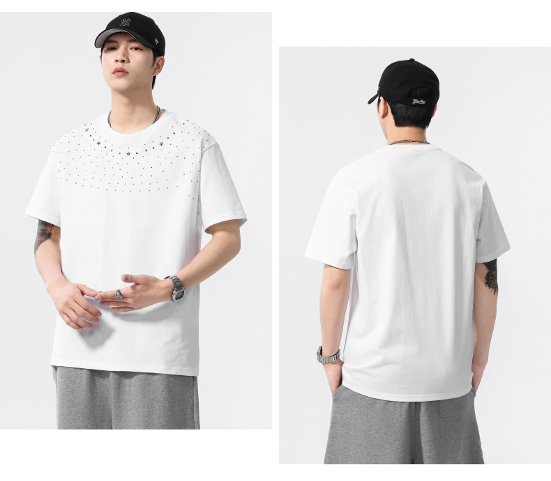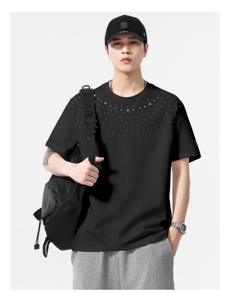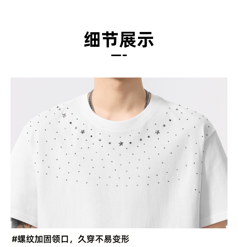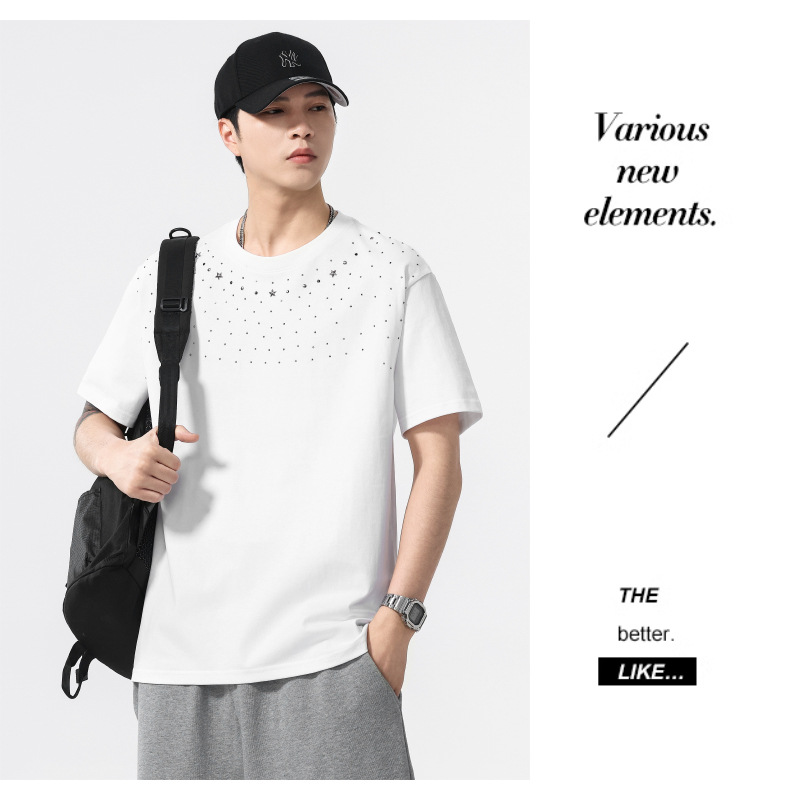 【100%棉】【DQ】大依优型大码男装240g重磅短袖T恤圆领宽松潮牌个性烫钻半袖上衣男士夏季新品