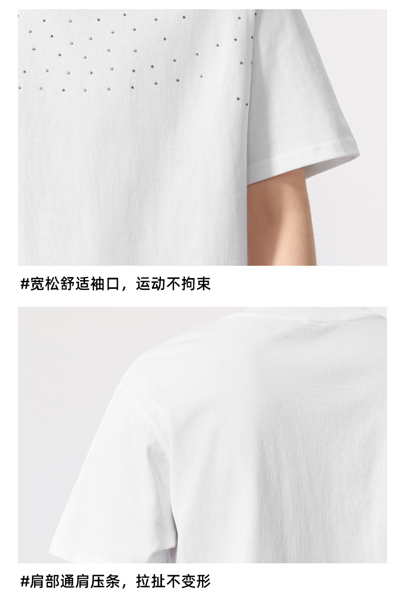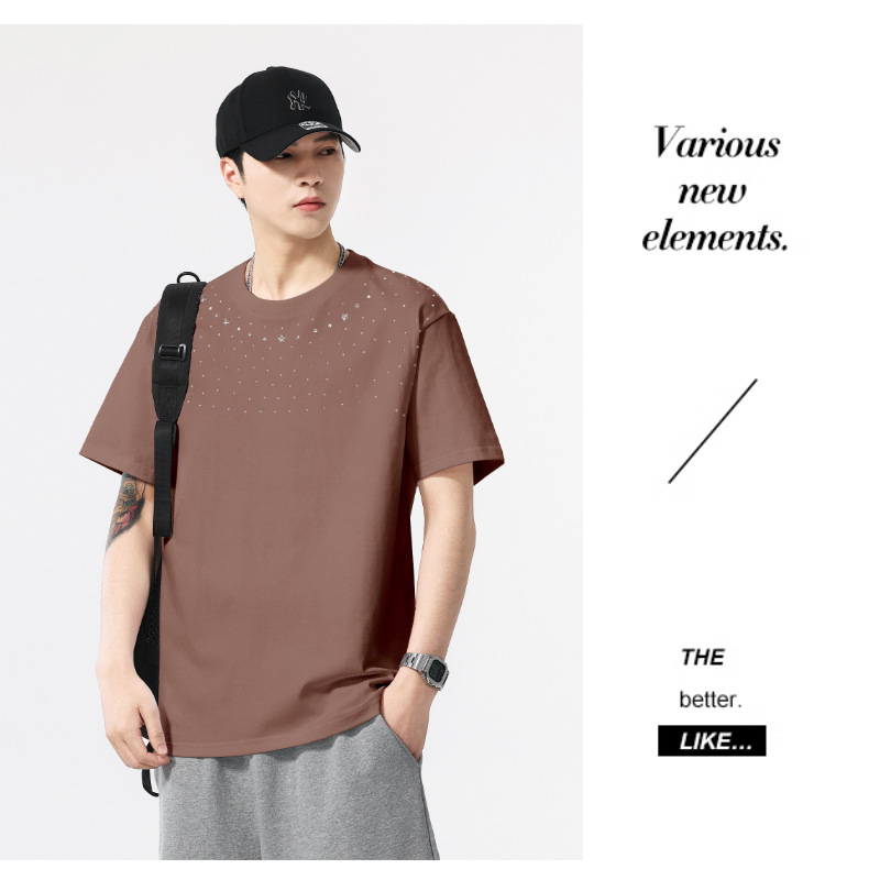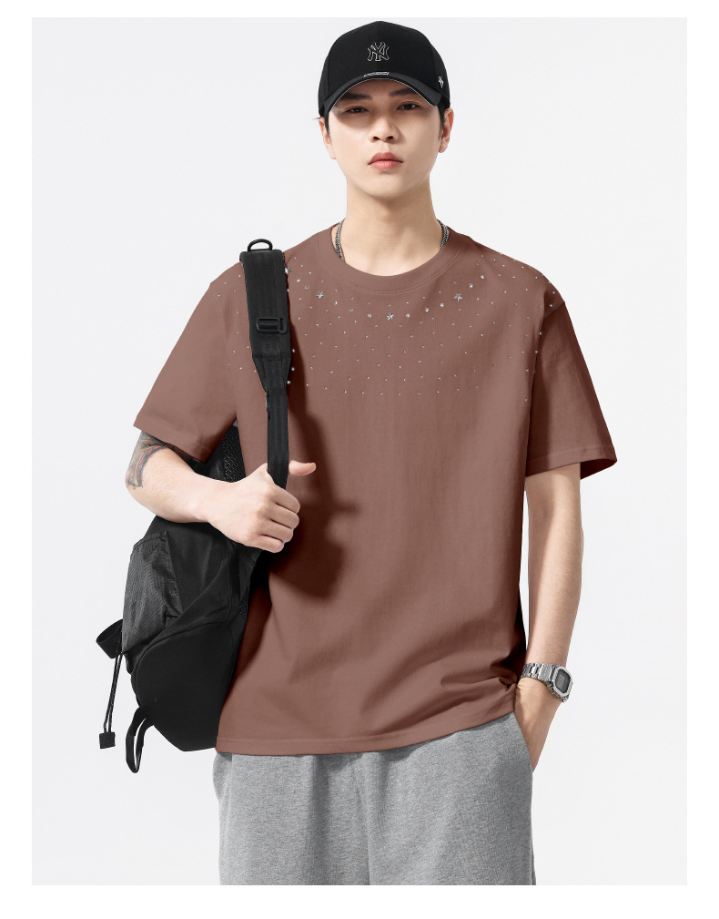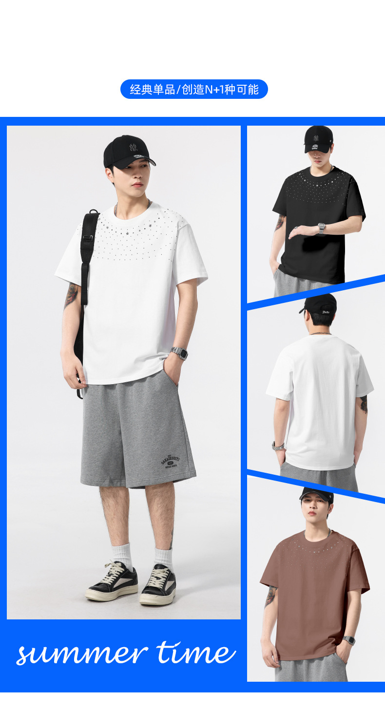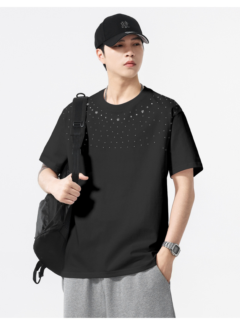 【100%棉】【DQ】大依优型大码男装240g重磅短袖T恤圆领宽松潮牌个性烫钻半袖上衣男士夏季新品